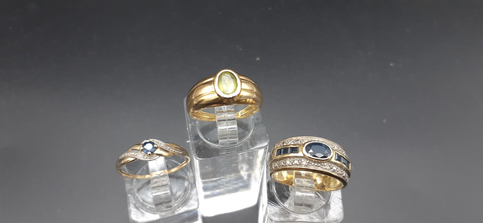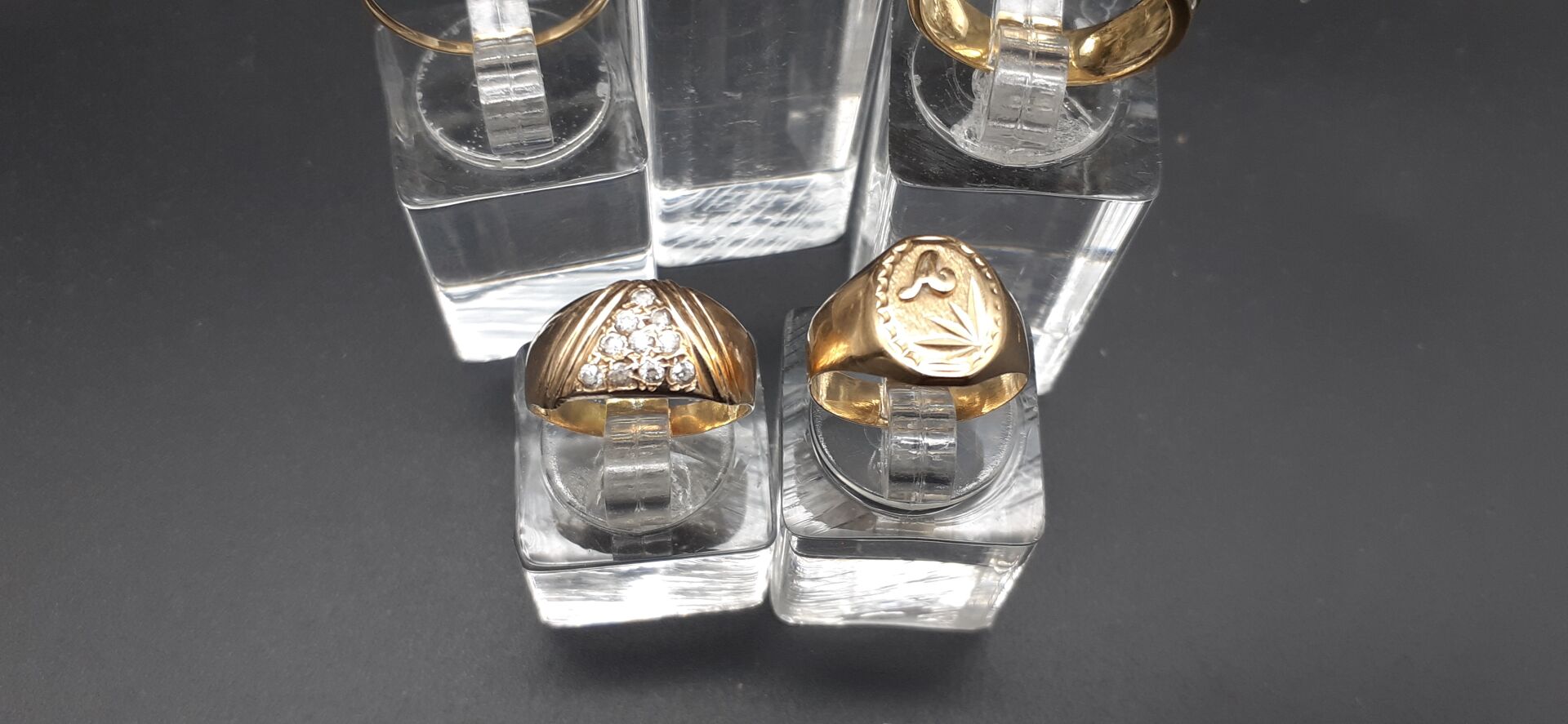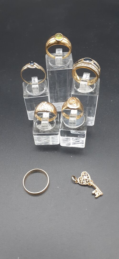 ATTENTION LOT JUDICIAIRE REGLEMENT EXIGE SOUS 10 JOURS SOUS PEINE D’ANNULATION DU BORDEREAU ET POURSUITES. Ensemble en or jaune 18K 750/1000e soit 1 anneau, 5 bagues ornées de pierres et un pendentif clé (usures et chocs) Poids brut total : 15,05 g.Réf B022100541B