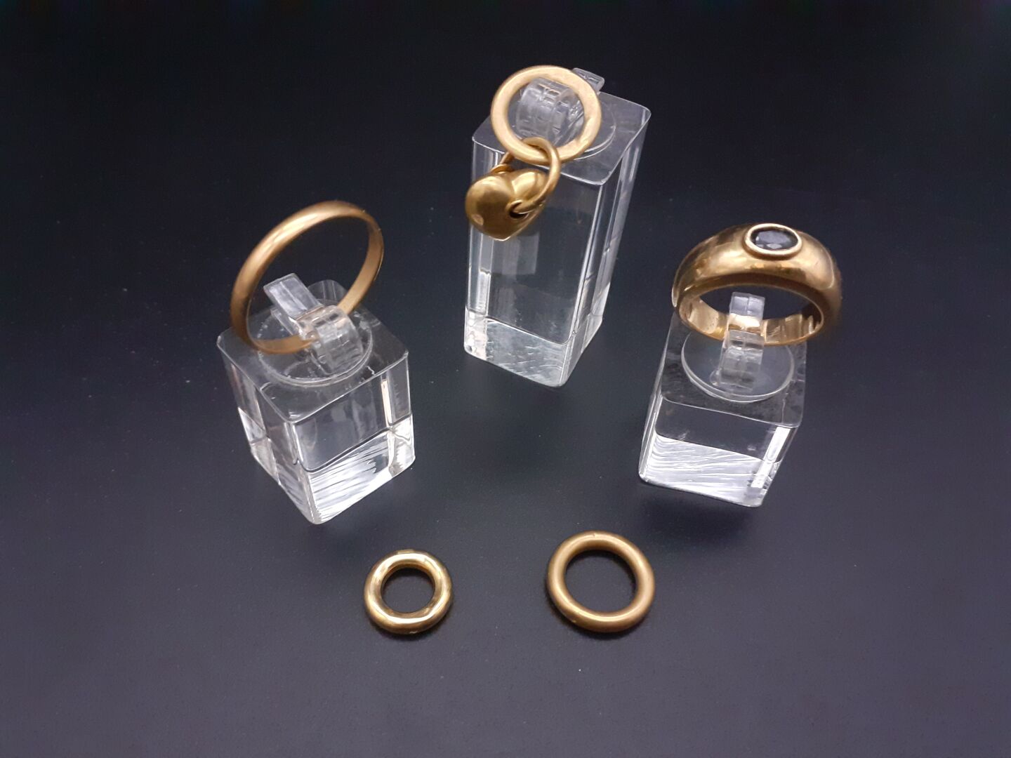 ATTENTION LOT JUDICIAIRE REGLEMENT EXIGE SOUS 10 JOURS SOUS PEINE D’ANNULATION DU BORDEREAU ET POURSUITES. Ensemble en or jaune 18K 750/1000e soit une alliance, 1 bague sertie de pierres, 2 anneaux et un pendentif « coeur ». Poids brut total : 19,10 g. réf B022100526J