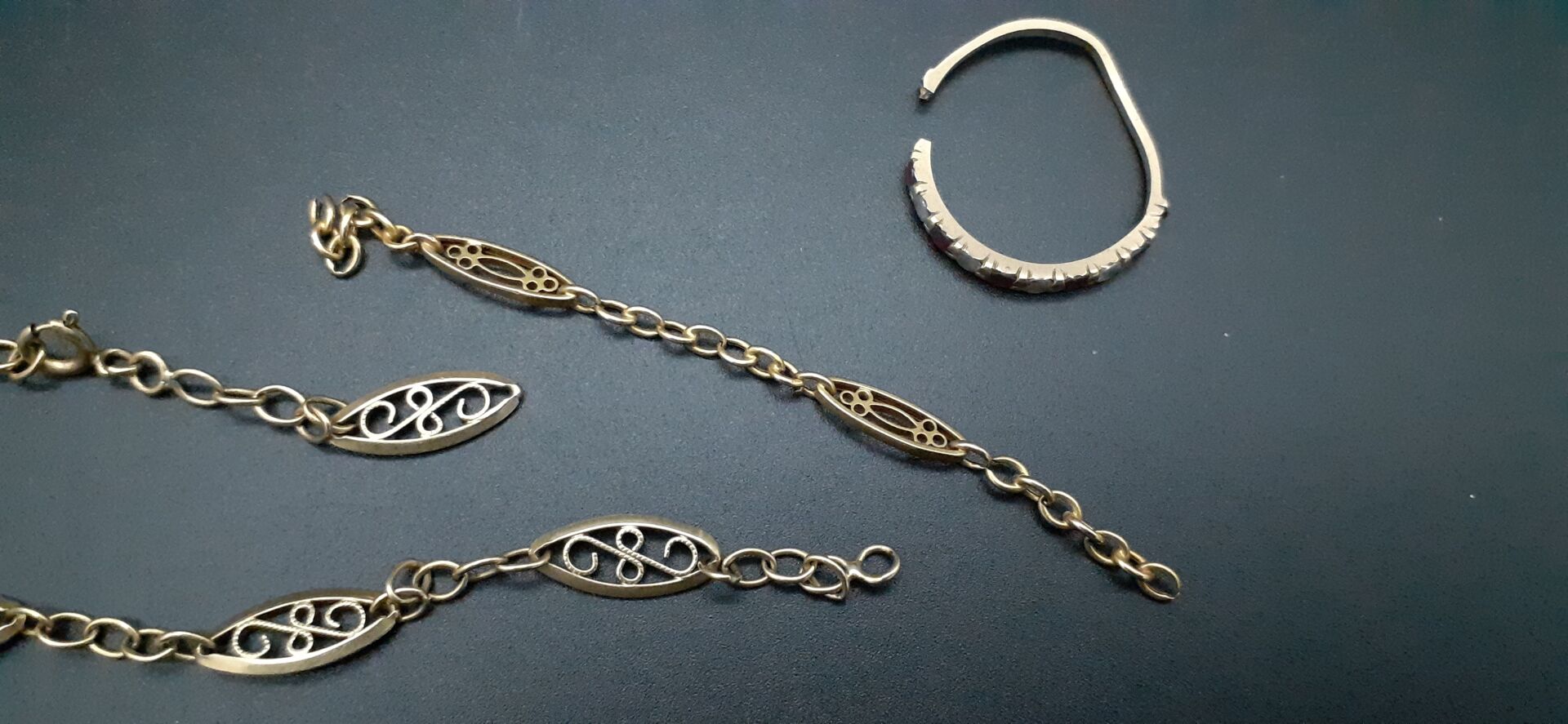 ATTENTION LOT JUDICIAIRE REGLEMENT EXIGE SOUS 10 JOURS SOUS PEINE D’ANNULATION DU BORDEREAU ET POURSUITES. Ensemble en or jaune 18K 750/1000e soit une bague ornée de verroterie jaune, un débris de bague serti de pierres (manques), deux débris de bracelet. Poids brut total : 12,70 g. réf B022101663B