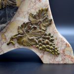 ATTENTION LOT JUDICIAIRE REGLEMENT EXIGE SOUS 10 JOURS SOUS PEINE D’ANNULATION DU BORDEREAU ET POURSUITES. Pendule en marbre beige et marbre portor à décor appliqué de pampres de vigne en bronze. Cadran émaillé à chiffres arabes pour les heures, chemin de fer (manquent des aiguilles, usures). Vers 1940/1950. Haut. : 35 cm. réf. : B021900870C