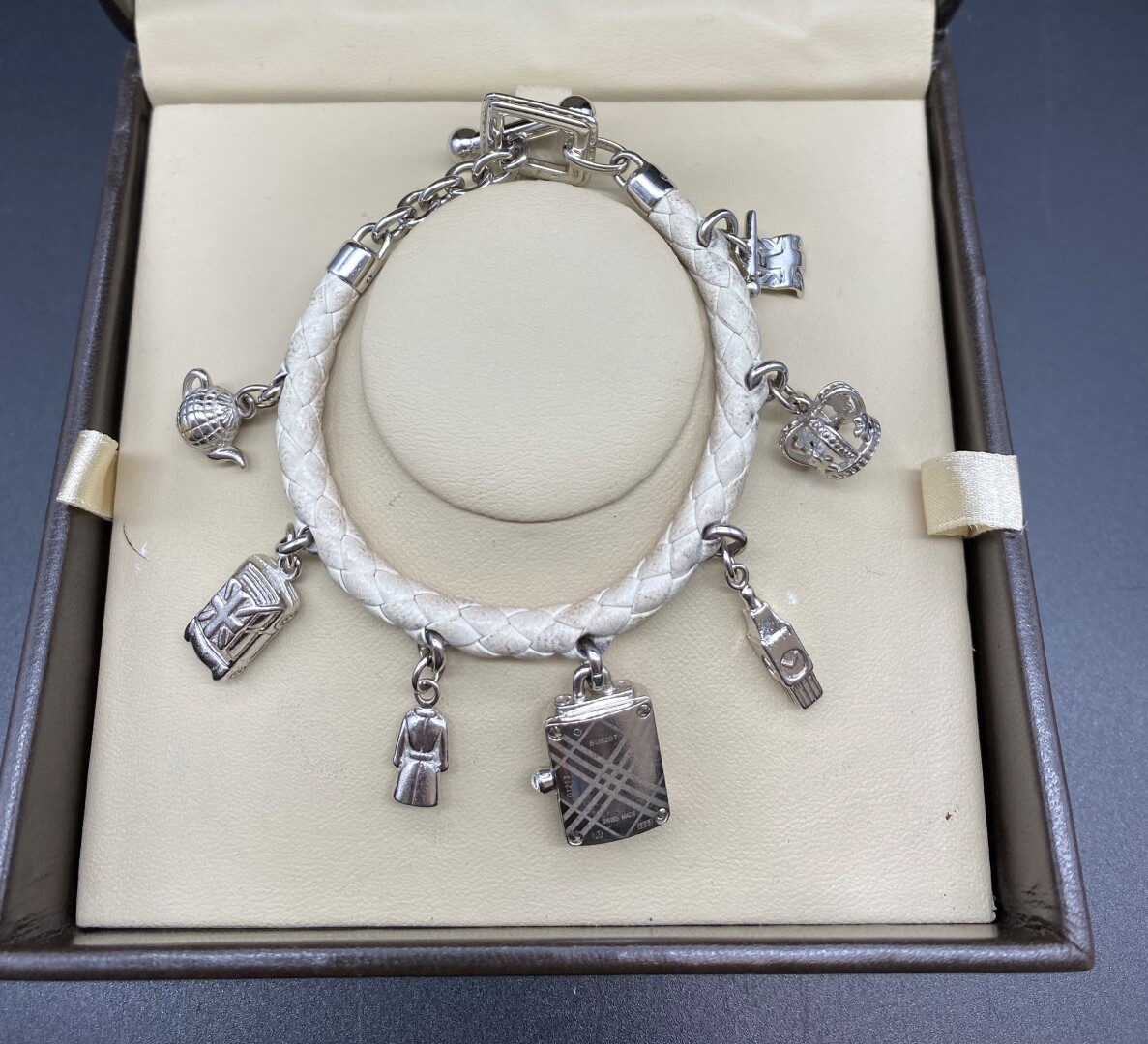 * ATTENTION LOT JUDICIAIRE REGLEMENT EXIGE SOUS 7 JOURS SOUS PEINE D’ANNULATION DU BORDEREAU ET POURSUITES. BURBERRY. Montre bracelet de dame, bracelet en cuir tressé beige (usures) à charms (pendeloques) en argent (poinçon Suise tête de chien). Le boîtier formé par un cadenas, mécanisme à quartz. Poids brut. : 43,54 g. Boîte, facture. réf. : B021900434 G