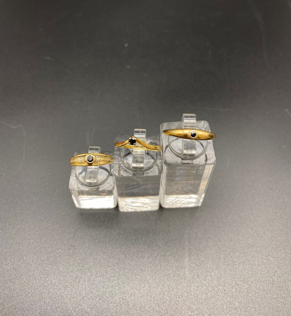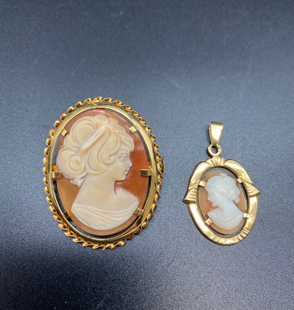 * ATTENTION LOT JUDICIAIRE REGLEMENT EXIGE SOUS 7 JOURS SOUS PEINE D’ANNULATION DU BORDEREAU ET POURSUITES. Ensemble en or jaune 18K 750/1000e soit deux camées coquillage représentant des bustes de femme, montés en pendentif et trois bagues serties de pierres bleues. Poids brut total : 9,90 g. Deux boîtes. réf. : B021900559Z