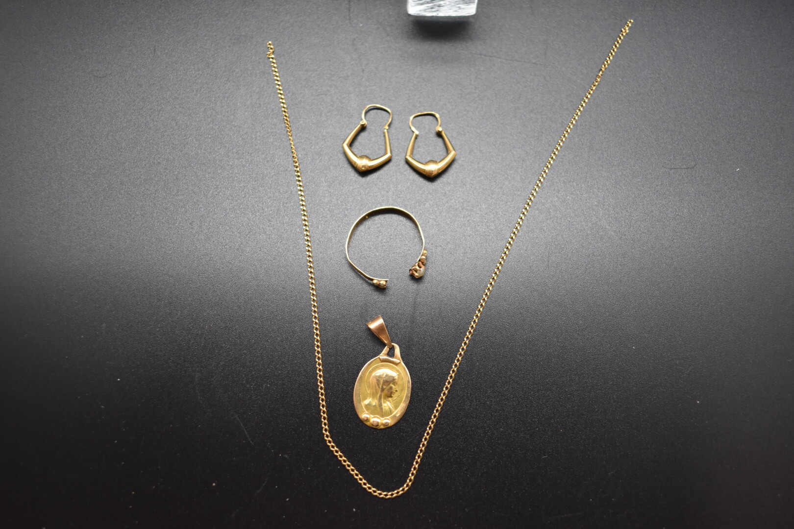 *ATTENTION LOT JUDICIAIRE REGLEMENT EXIGE SOUS 7 JOURS SOUS PEINE D’ANNULATION DU BORDEREAU ET POURSUITES. Ensemble en or jaune 18K 750/1000e soit un anneau, trois bagues ornées de pierres claires et une perlette (cassée), une paire de petites créoles, une médaille religieuse et un fragment de chaîne. Poids brut total : 14,25 g.réf. B022001348G