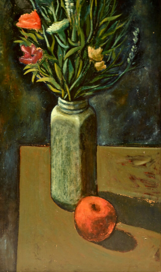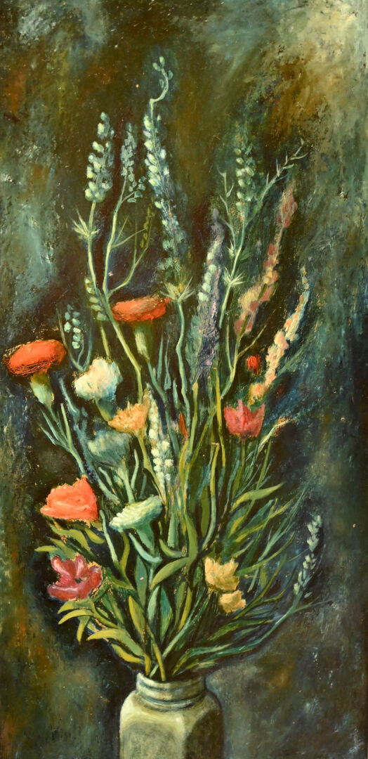 Attribué à Ardavast BERBERIAN (1923 – 2002). ? Bouquet de fleurs. Huile sur isorel. Traces d’insectes xylophages. 99 x 35 cm.