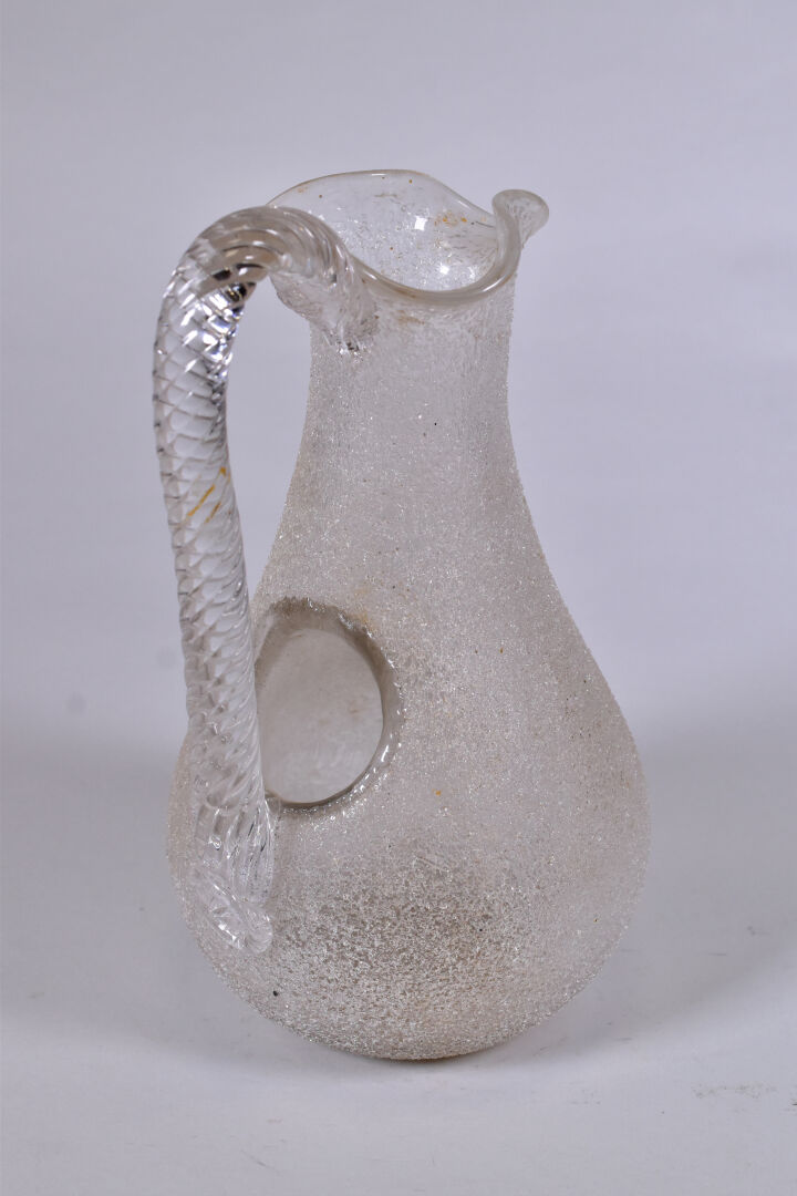 Attribué à BACCARAT. Carafe rafraichissoir en verre granité,, le col en corole, l’anse torsadée appliquée à chaud. Haut. : 27 cm.