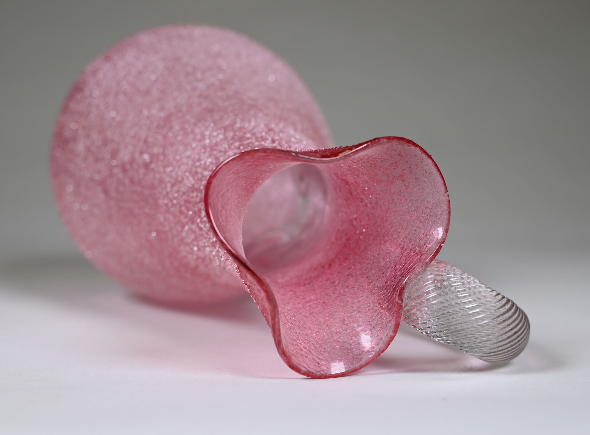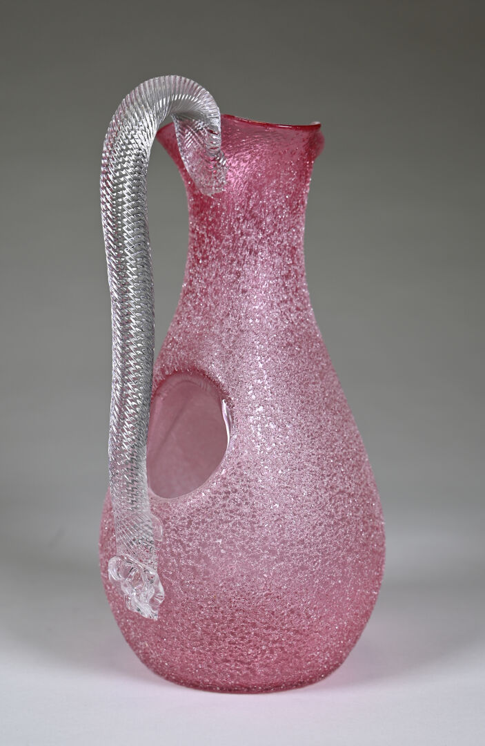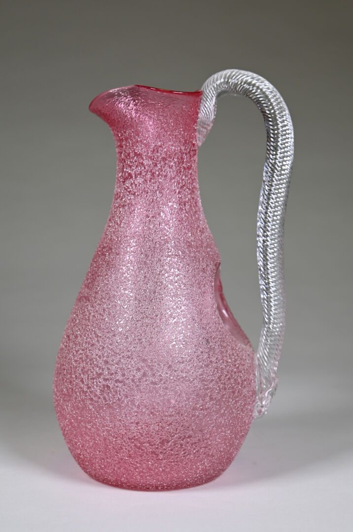 Attribué à BACCARAT. Carafe rafraichissoir en verre granité rose, le col en corole, l’anse torsadée appliquée à chaud. Haut. : 29.5 cm.