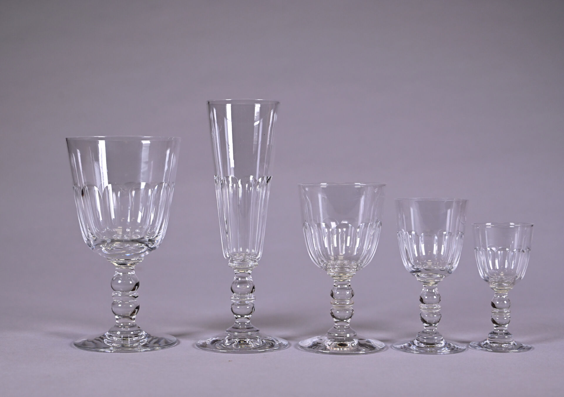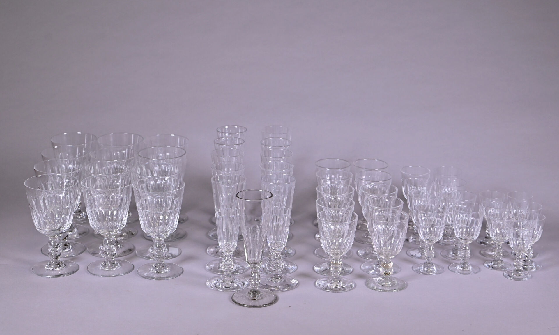 Attribué à BACCARAT. Parties de service de verres à pied en cristal modèle « Gondole » cotes plates comprenant 12 verres à eau (2 égrenures), 10 verres à vin, 8 verres à Porto, 7 verres à liqueur, 11 flutes à champagne. Non marqués. Hauteur des verres : 9 cm – 10,7 cm – 12 cm – 15 cm et 18 cm.