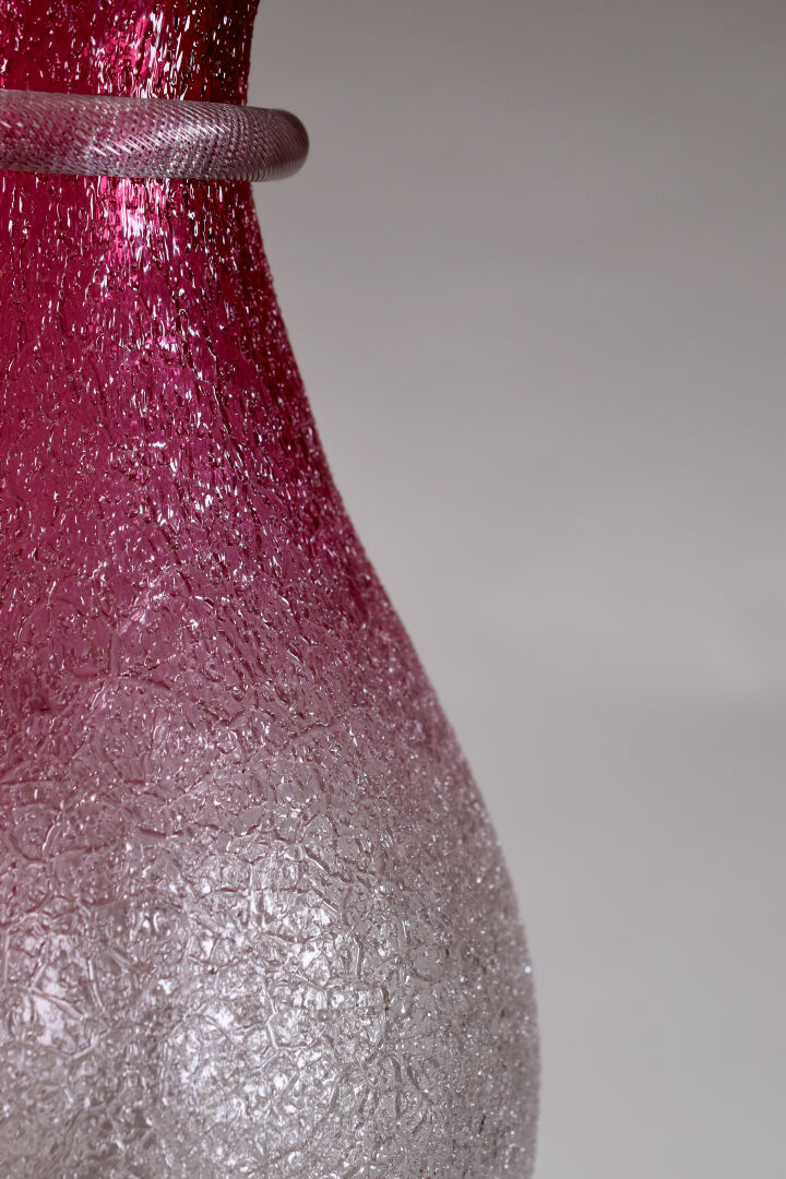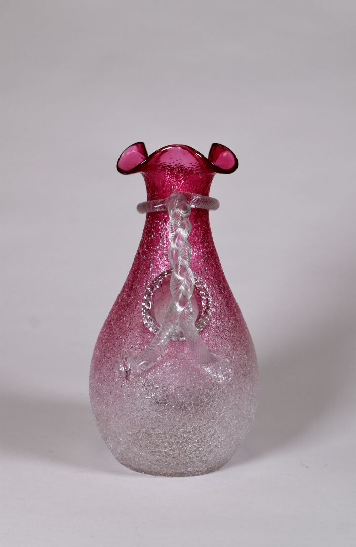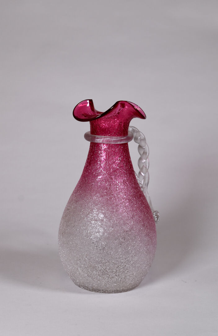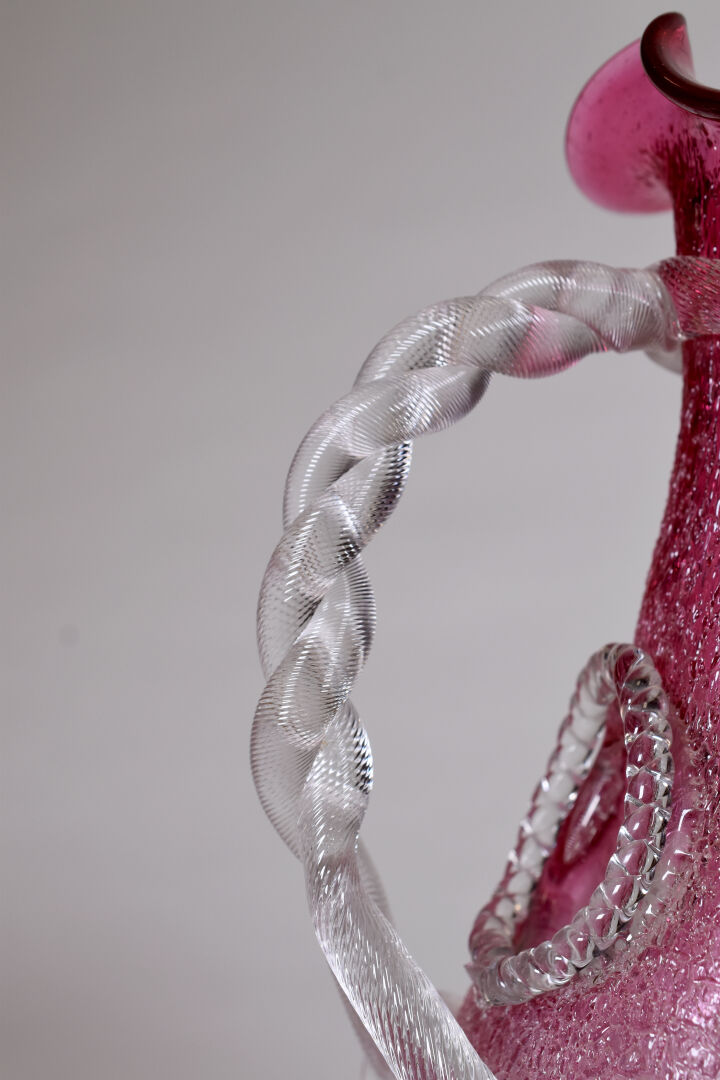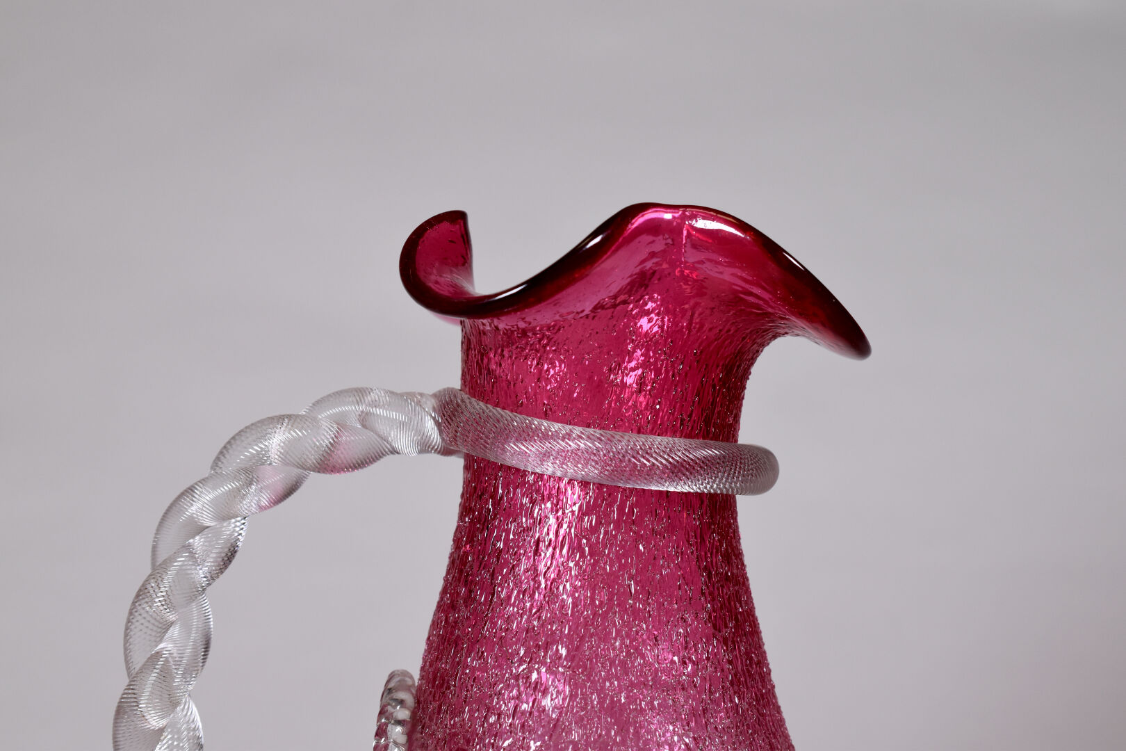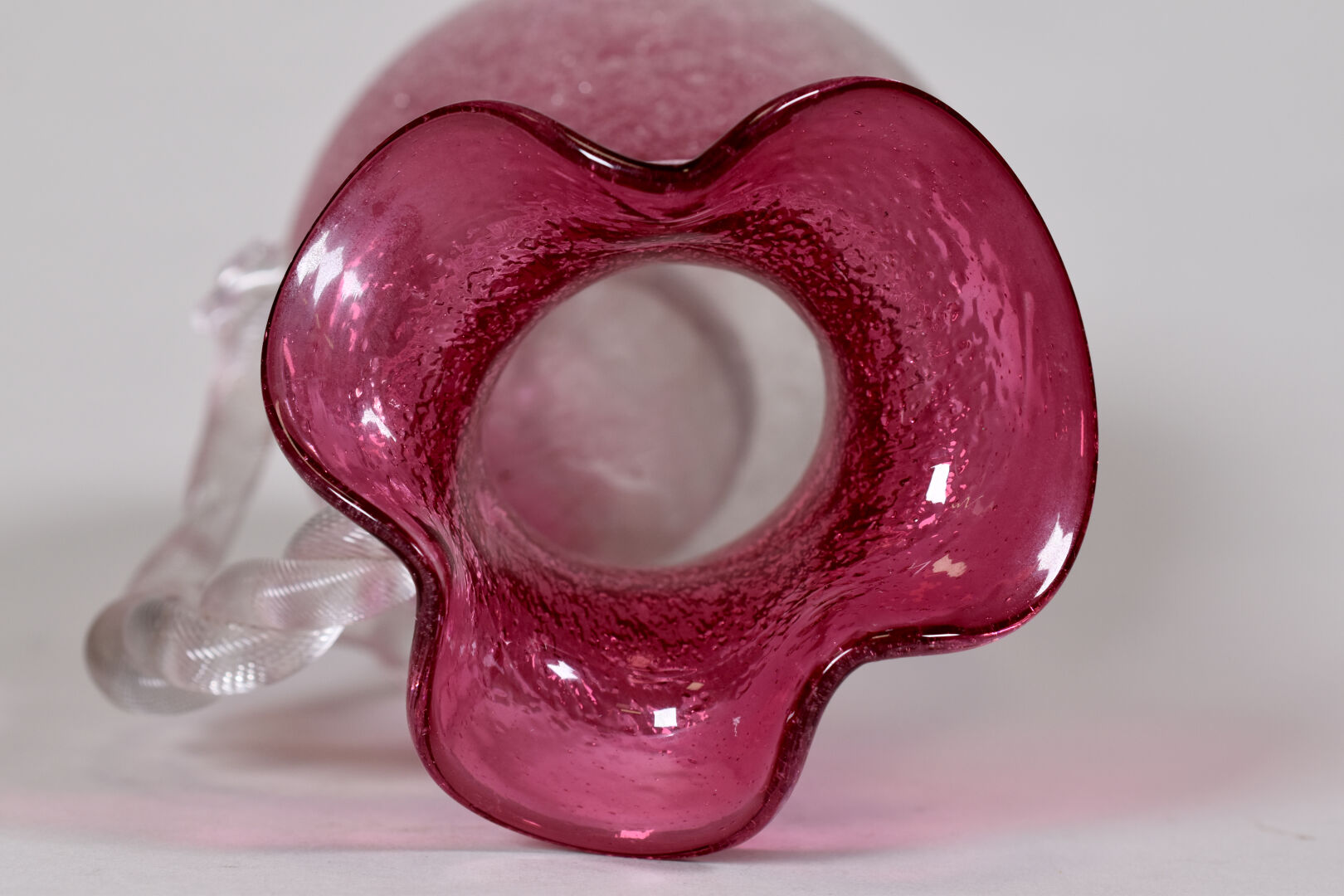 Attribué à BACCARAT. Verseuse en verre granité clair et rose, le col en corole, l’anse torsadée appliquée à chaud. Haut. : 28 cm.