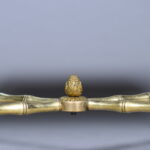 Attribué à BAGUES. Table basse en bronze doré à piètement simulant le bambou réuni par une entretoise en X surmontée d’une pomme de pin et terminé par des griffes. Plateau de verre opalin noir (rayures et usures d’usage). Haut. : 45,5 cm -Larg; : 85 cm – Prof. : 45 cm.