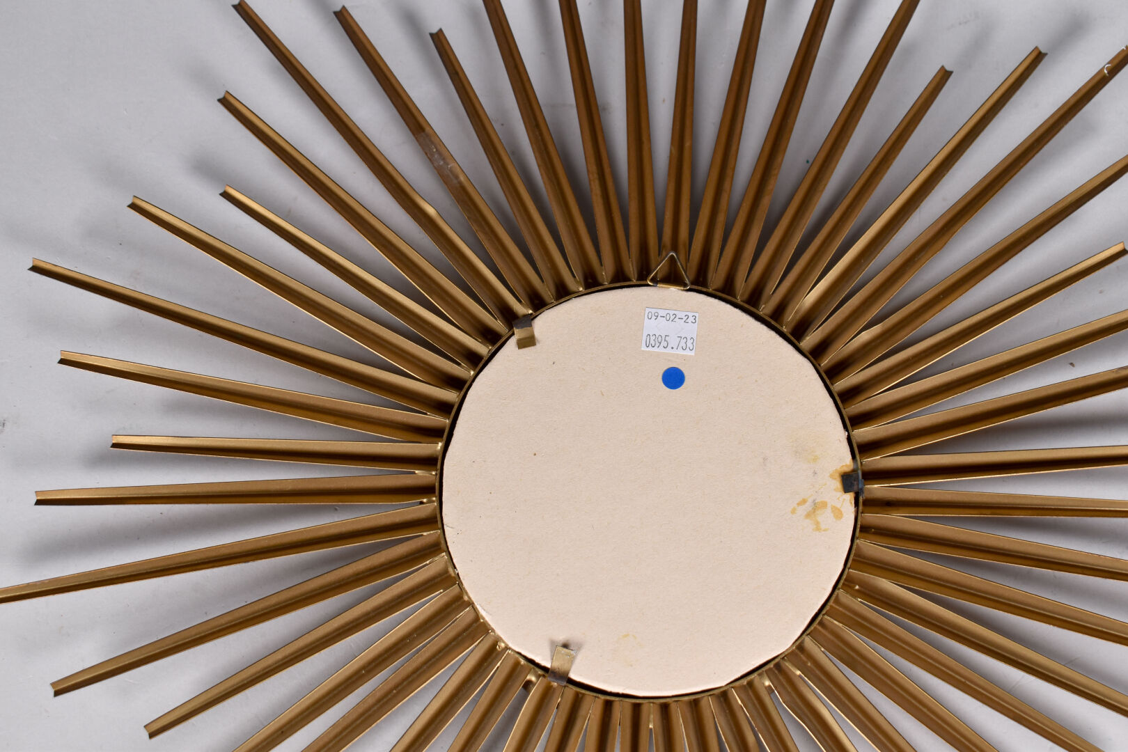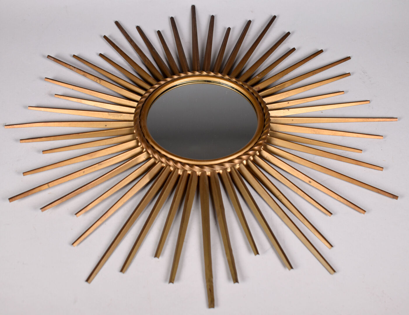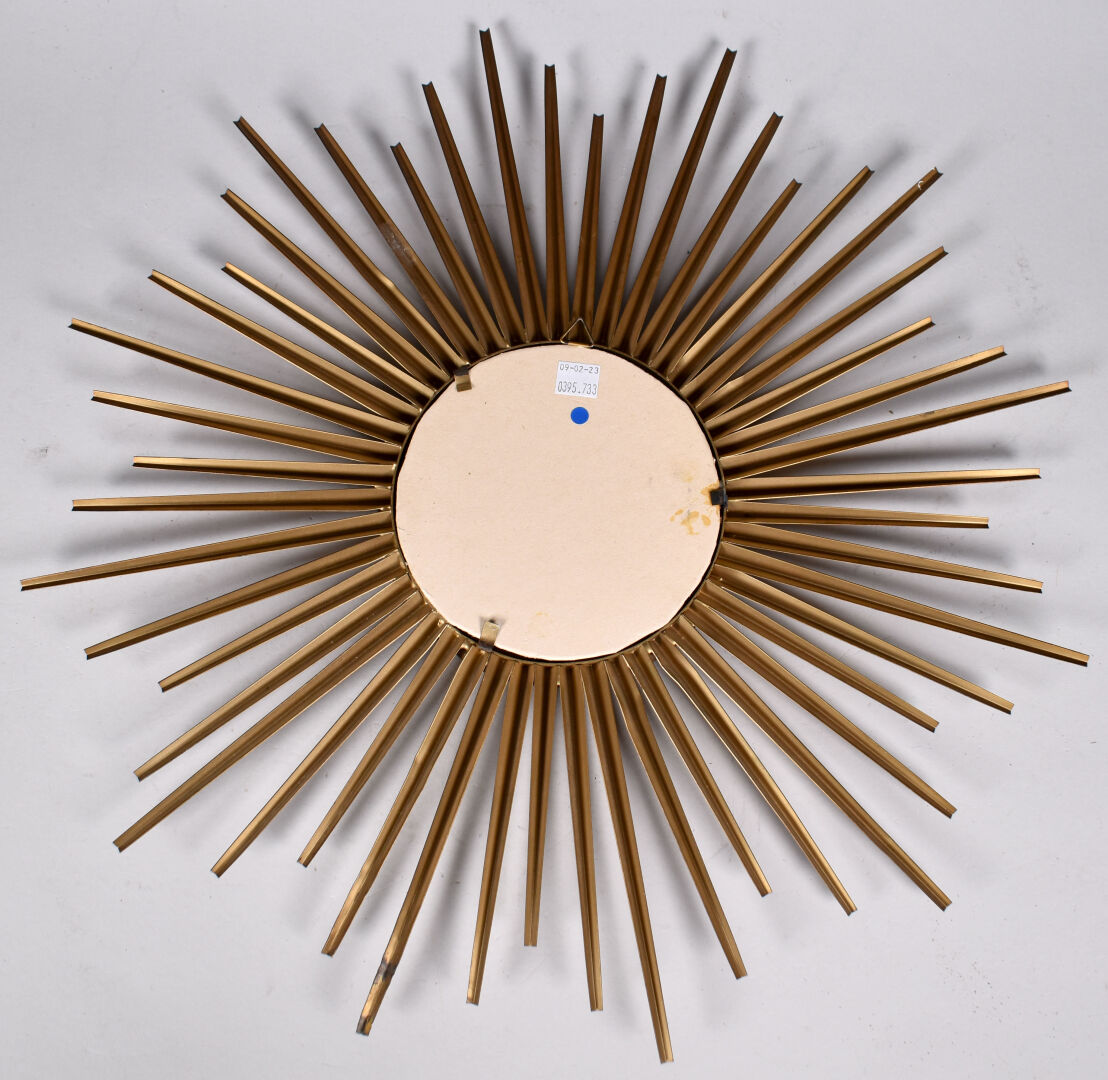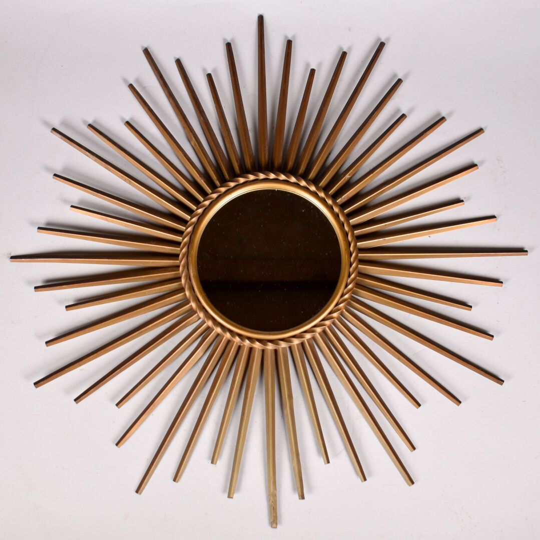Attribué à CHATY-VALLAURIS. Miroir soleil en métal doré (une restauration à un taquet de fixation du dos). Diam. : 51 cm.