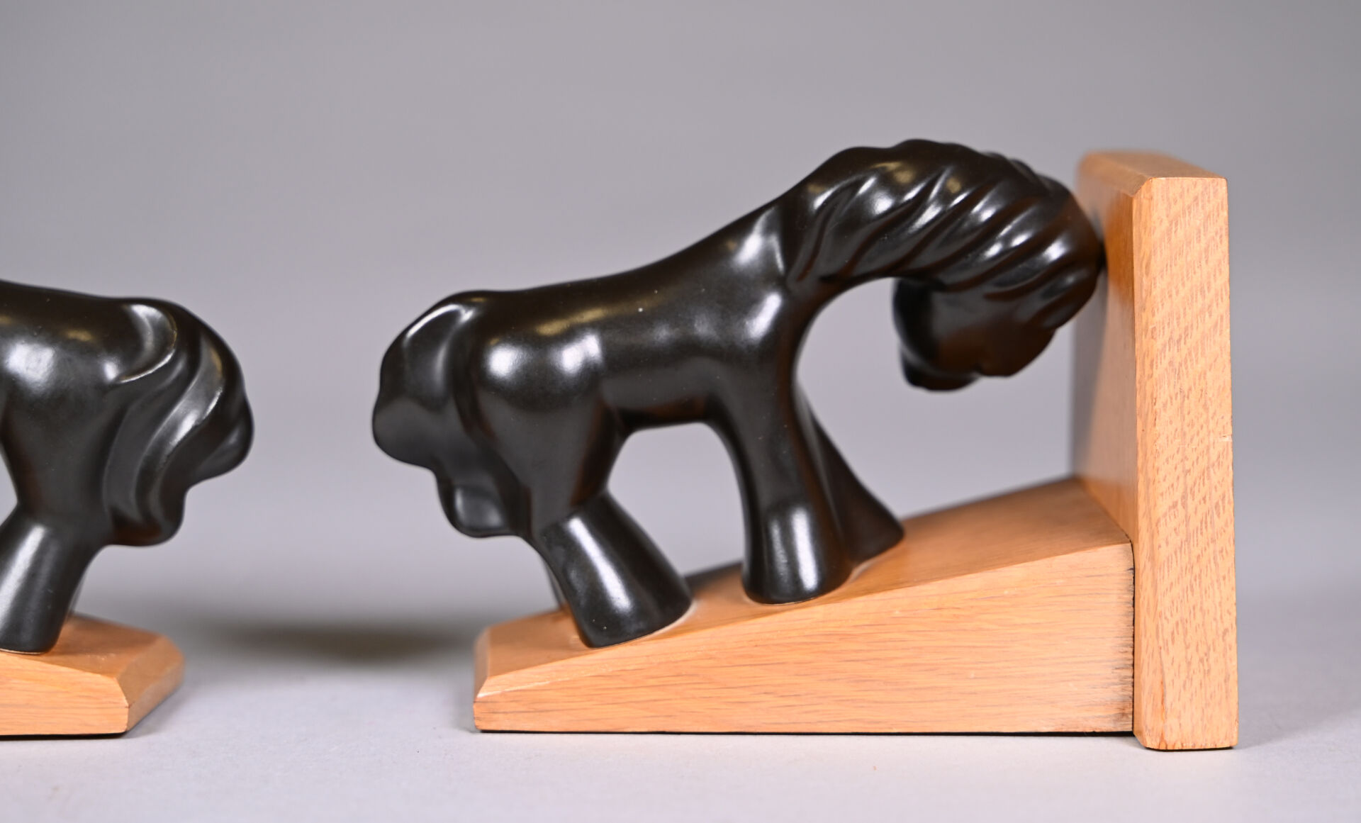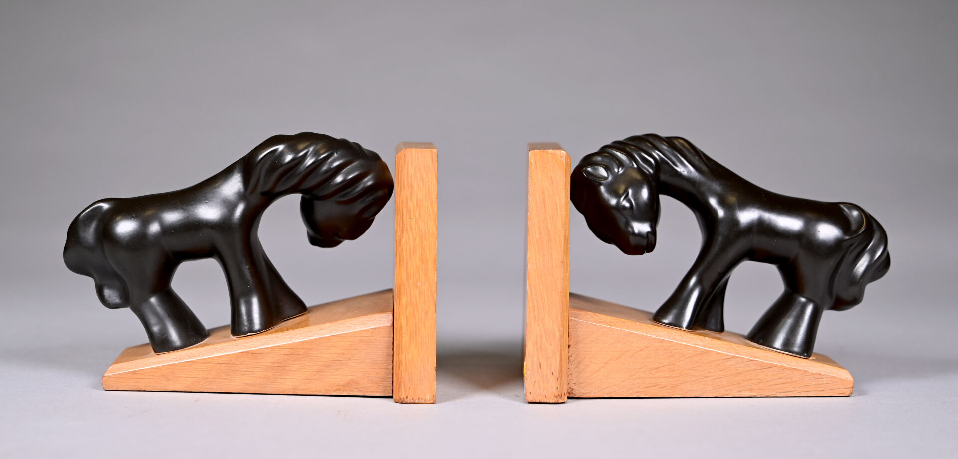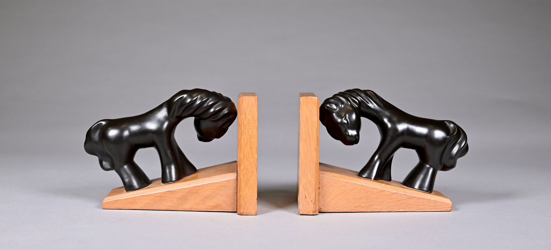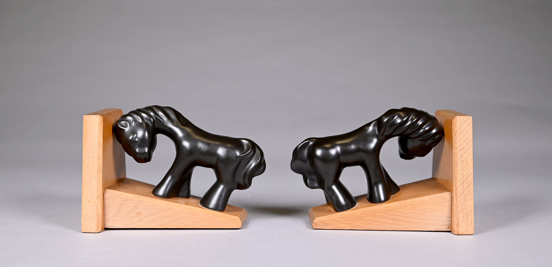 Attribué à Colette GUEDEN (XXe siècle). Paire de serre-livres à décor d’un cheval en céramique émaillée noire lustrée, la base en bois. Haut. : 11,5 cm.