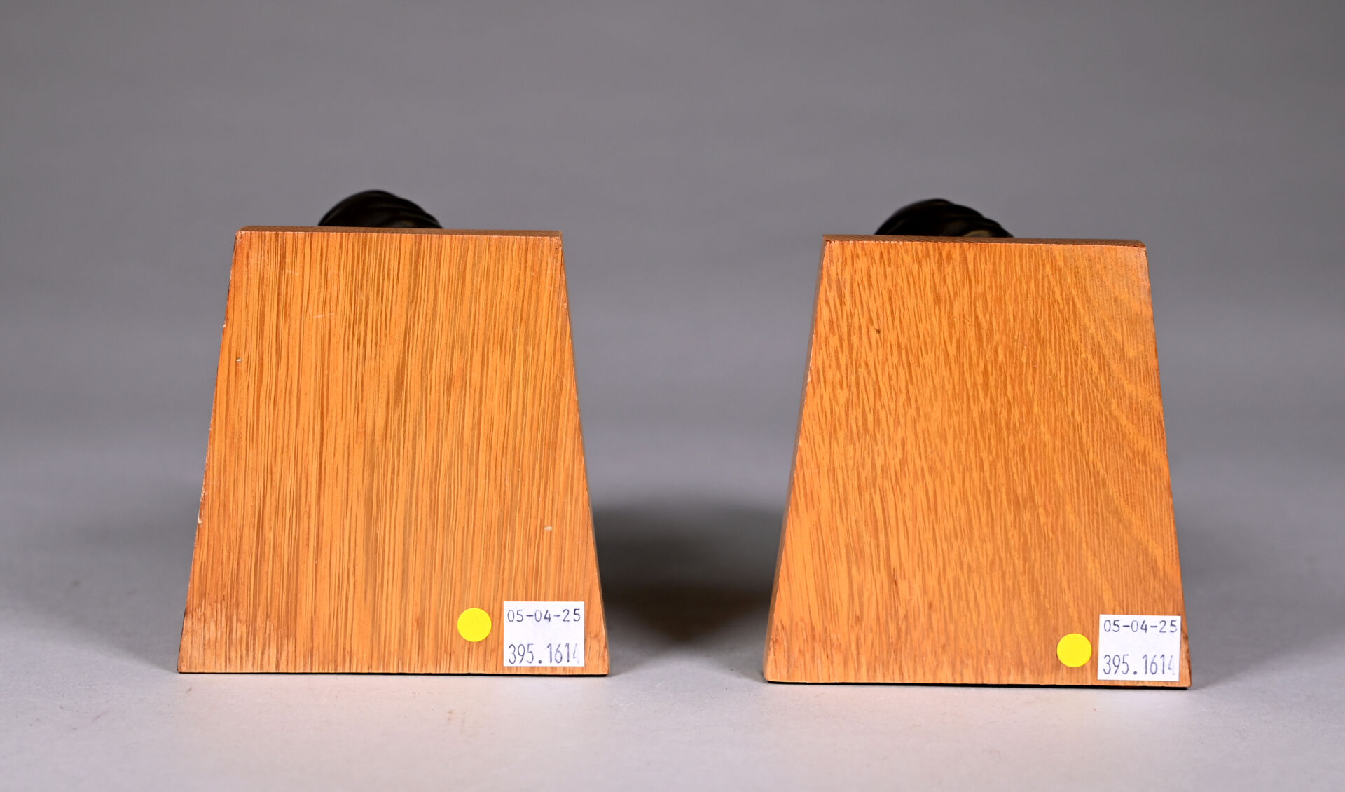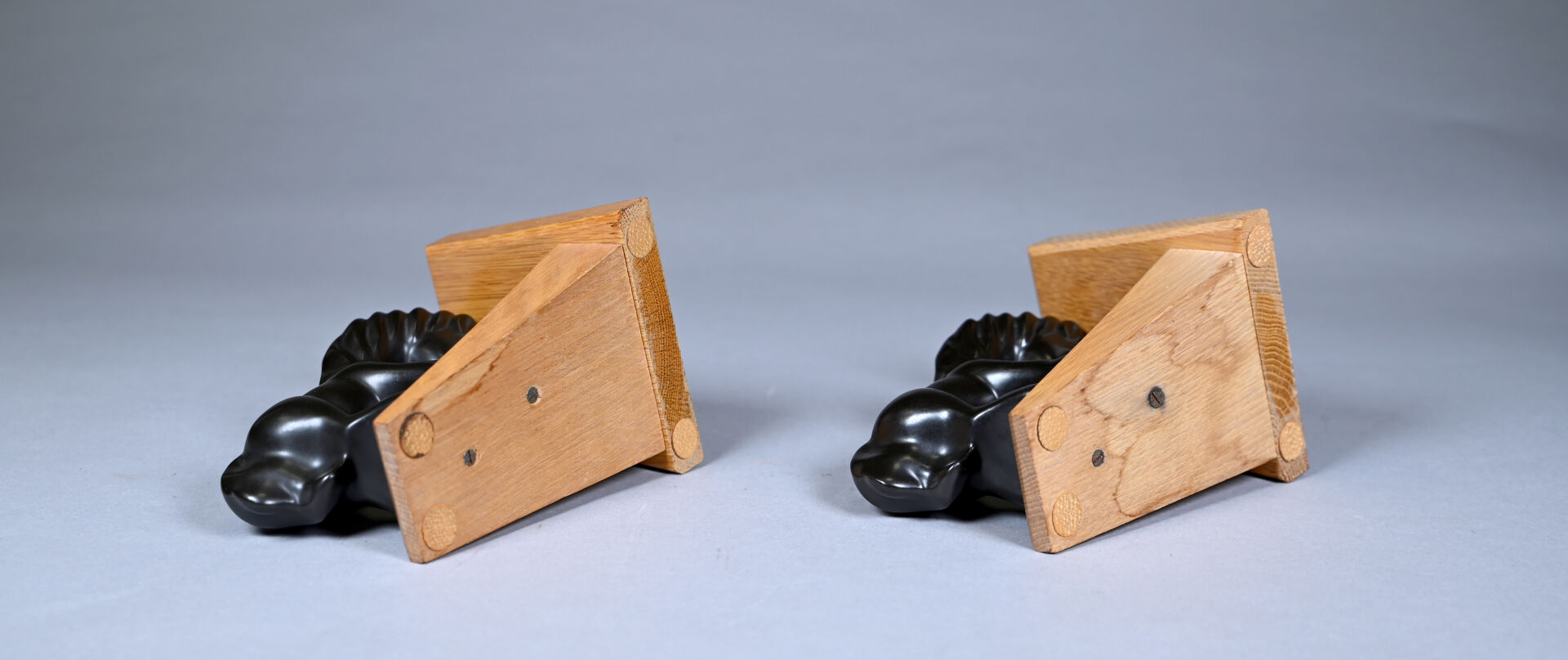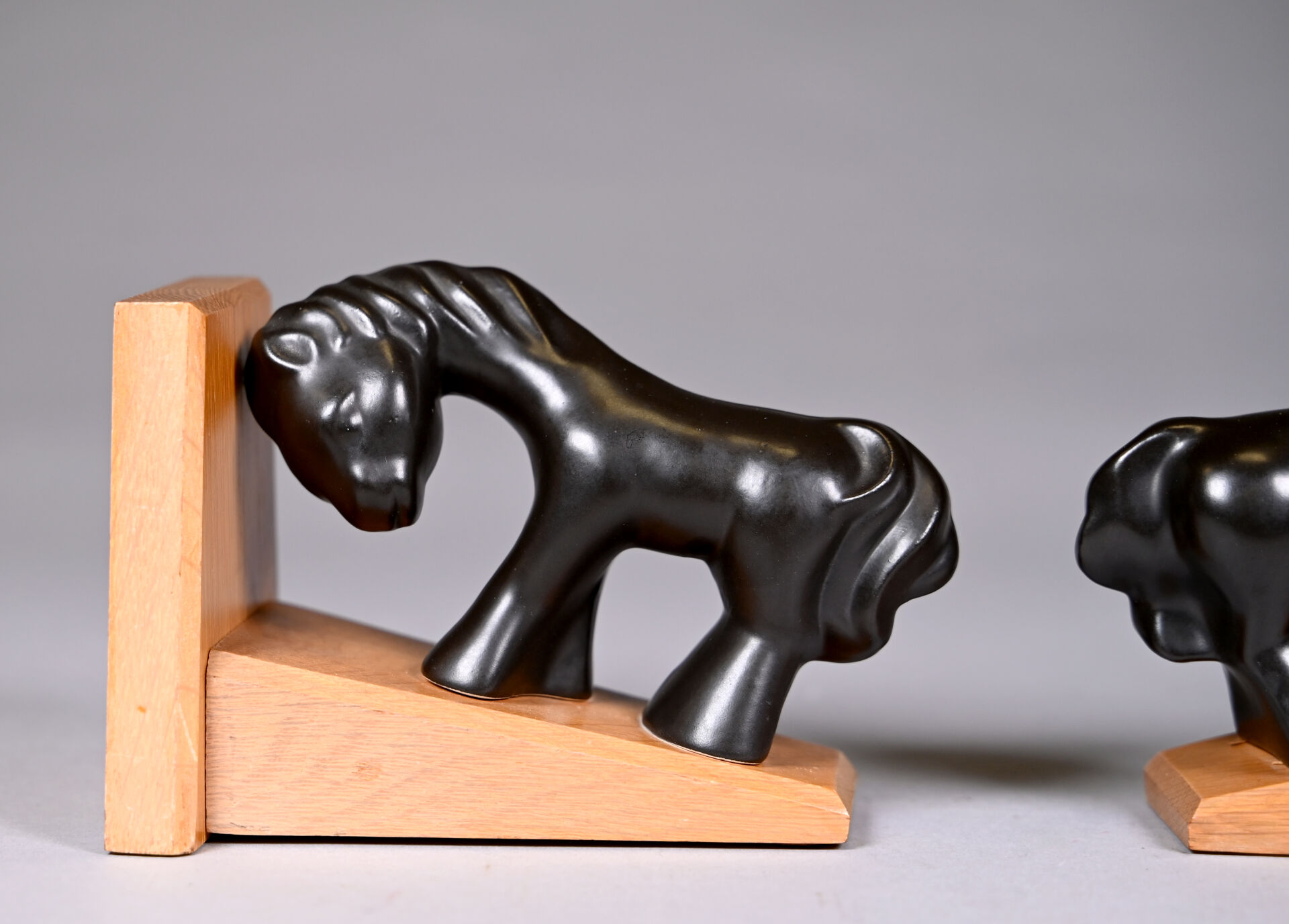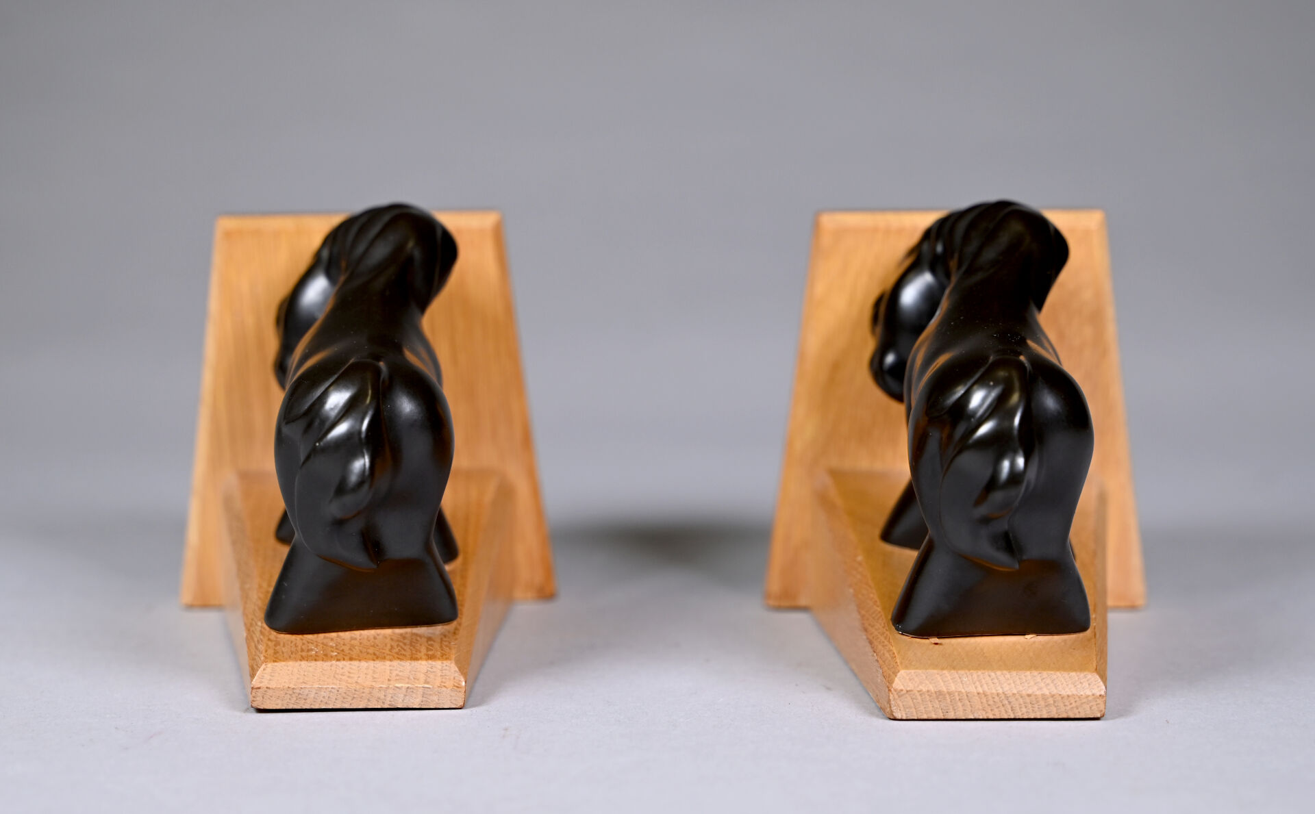 Attribué à Colette GUEDEN (XXe siècle). Paire de serre-livres à décor d’un cheval en céramique émaillée noire lustrée, la base en bois. Haut. : 11,5 cm.