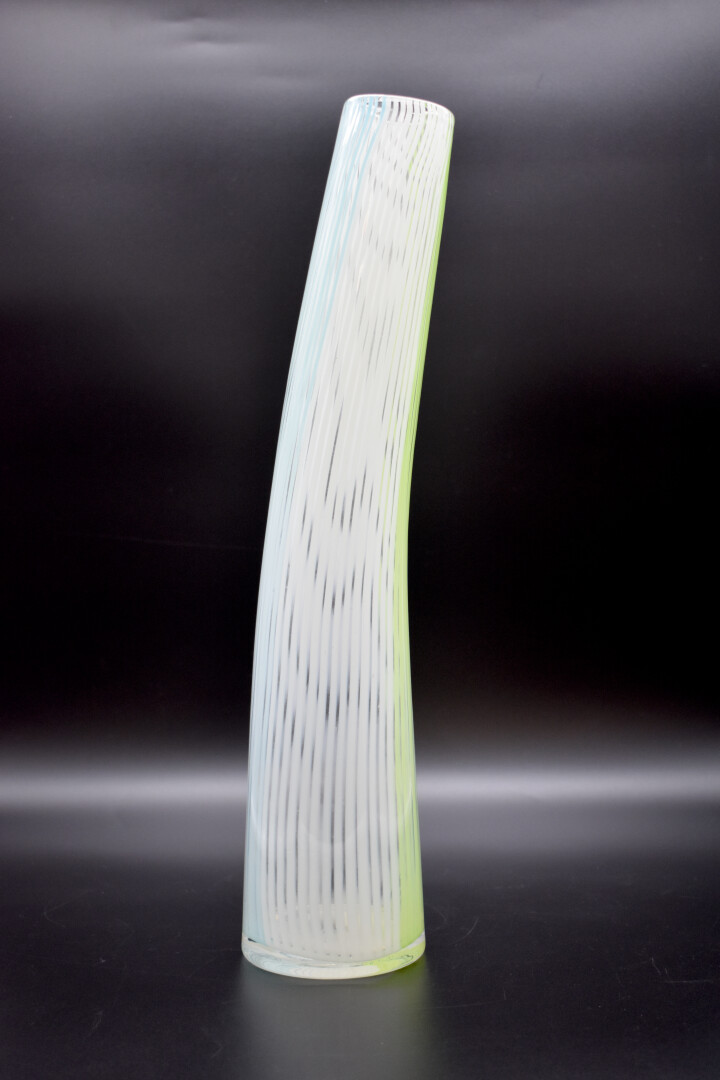 Attribué à Dino MARTENS pour Auréliano TOSO à Murano. Haut vase rouleau en verre filigranné vert, bleu et blanc. Haut. : 41,5 cm.