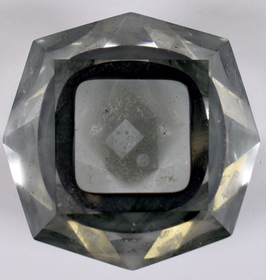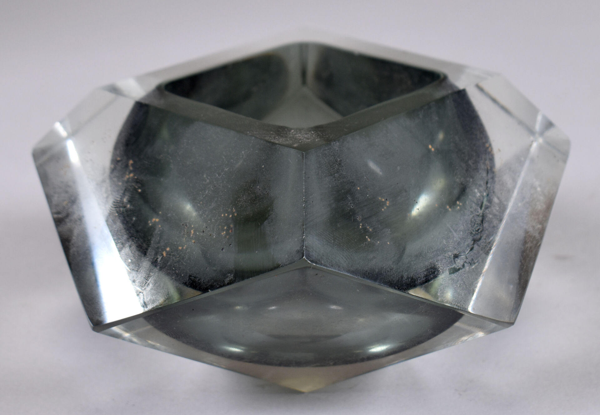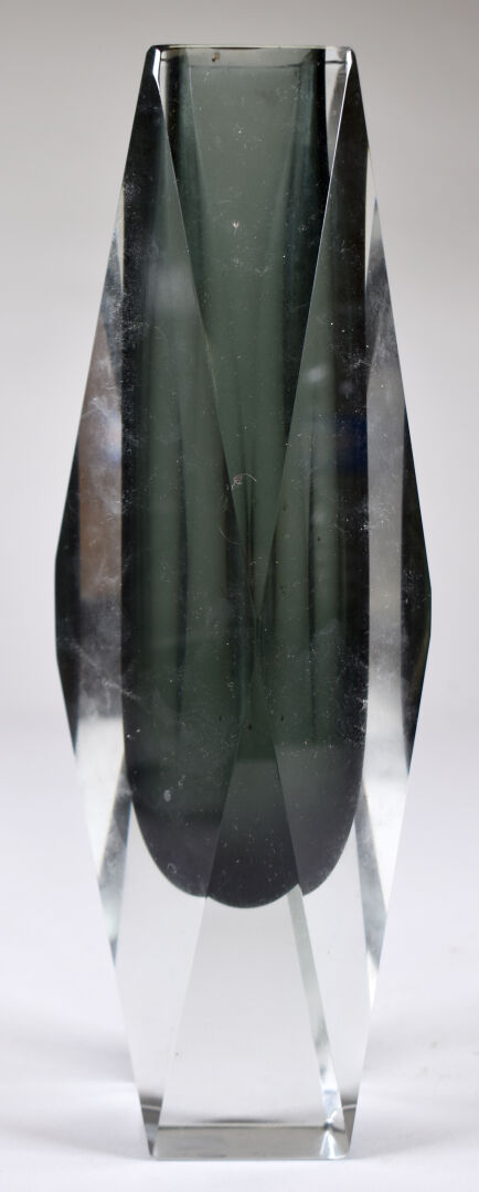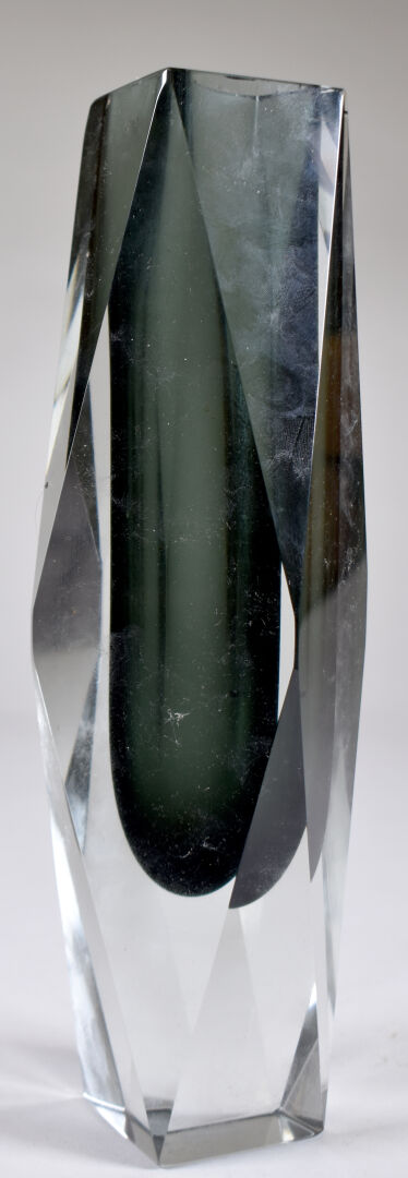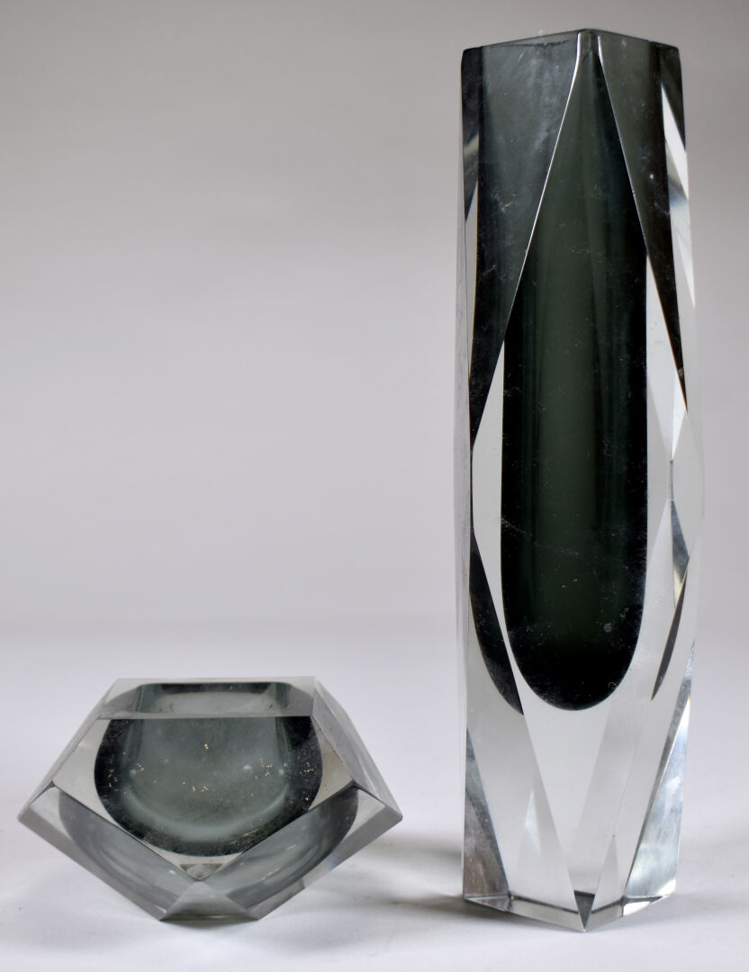 Attribué à Flavio POLI – Murano. Ensemble en verre somerso noir et clair soit un vase et une coupe facettés (égrenures). Haut. du vase : 31 cm.