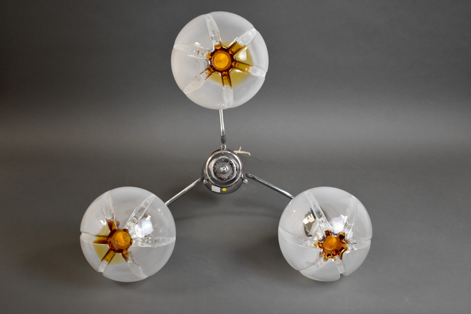 Attribué à Gaetano SCIOLARI (1927-1994) MAZZEGA ? à Murano. Lustre à trois bras de lumière en métal chromé, les globes en verre opalescent et ambré. Vers 1970. Haut. : 64 cm – Diam. : 60 cm.