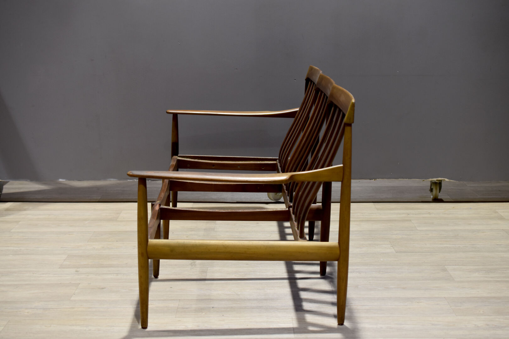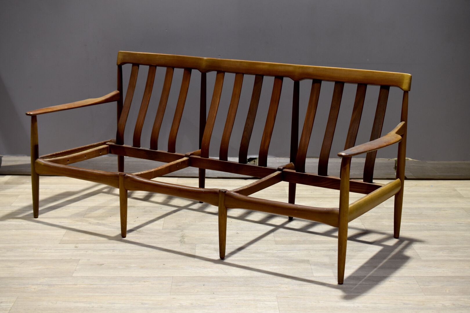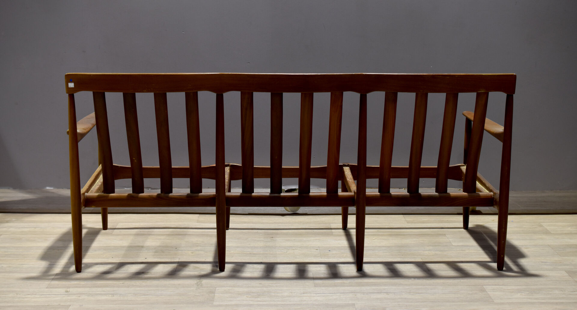 Attribué à Grete JALK. Banquette en teck ou bois exotique (quelques insolations, une restauration, manquent les sangles et les coussins). Haut. : 79 cm – Larg. : 178 cm – Prof. : 71 cm.