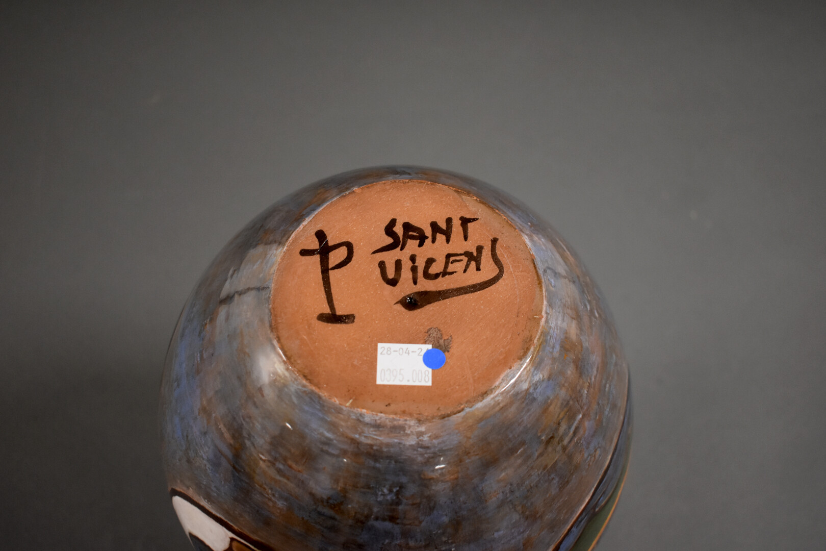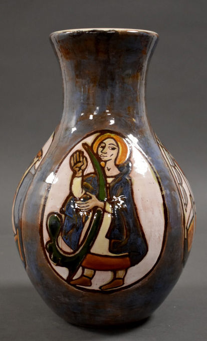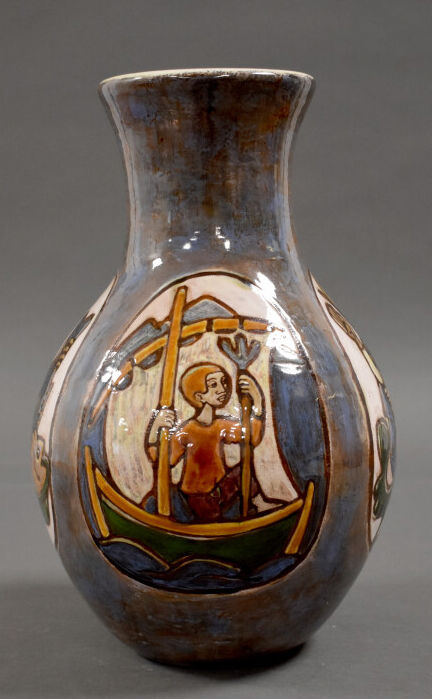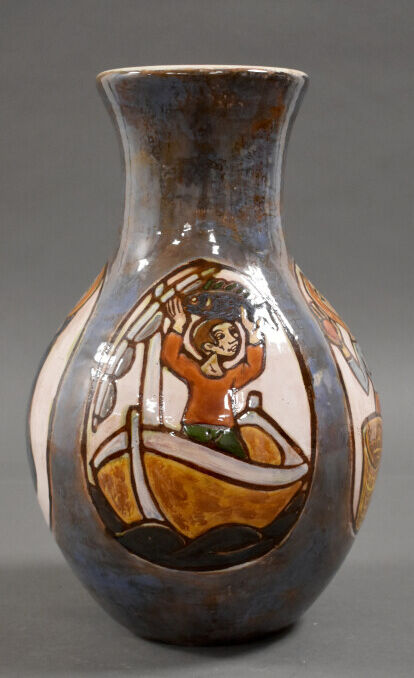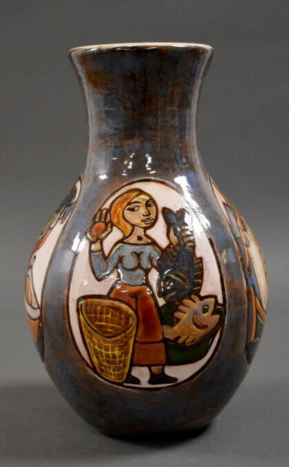 Attribué à Jacques POUSSINE (né en 1923) à Sant Vicens. Vase ovoïde à col resserré en céramique émaillée en polychromie de scènes de pêche dans des réserves sur fond bleu-gris. Avec monogramme au-dessous. Haut. : 35,5 cm.