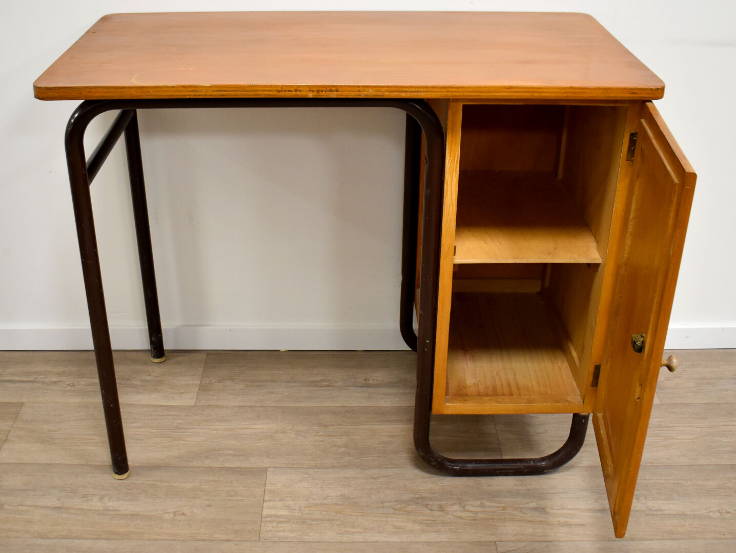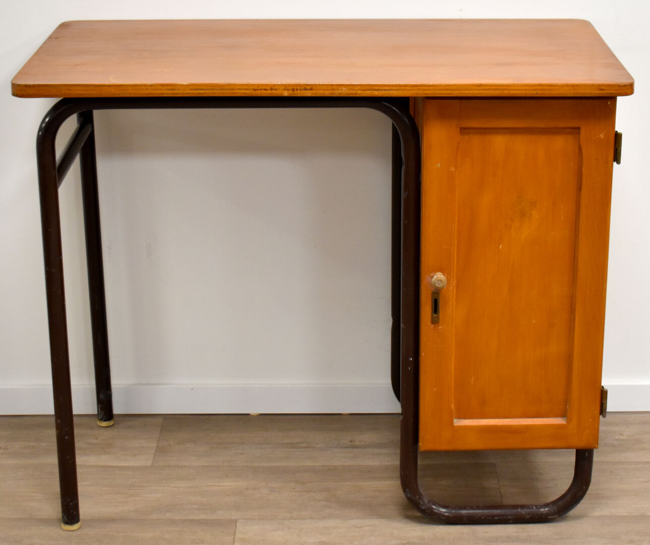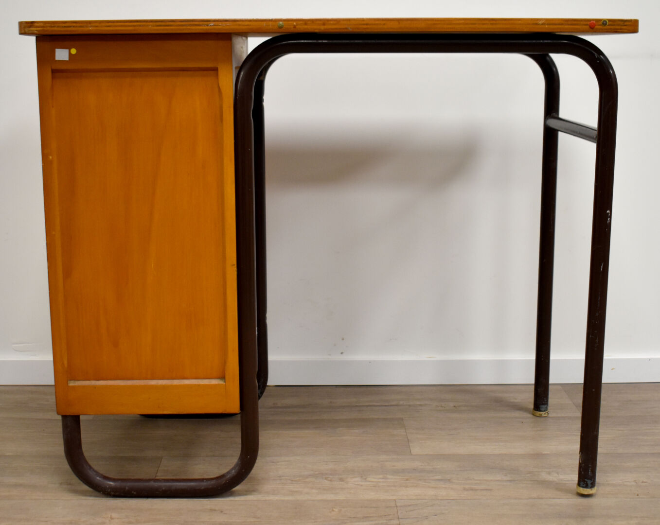 Attribué à Jaques HITIER (1917-1999). Bureau en contre plaqué et métal tubulaire brun (reverni, usures). Le caisson ouvrant à une porte. Vers 1950/1960. Haut. : 78 cm – Larg. : 95 cm – Prof. : 50 cm.