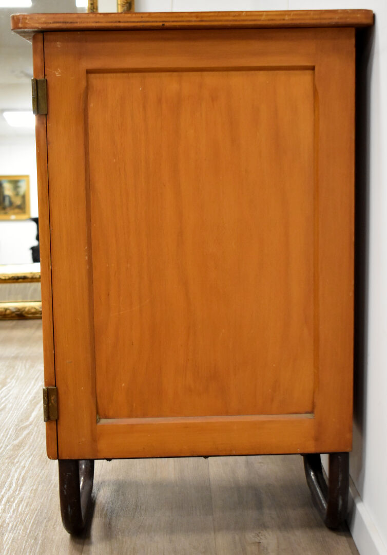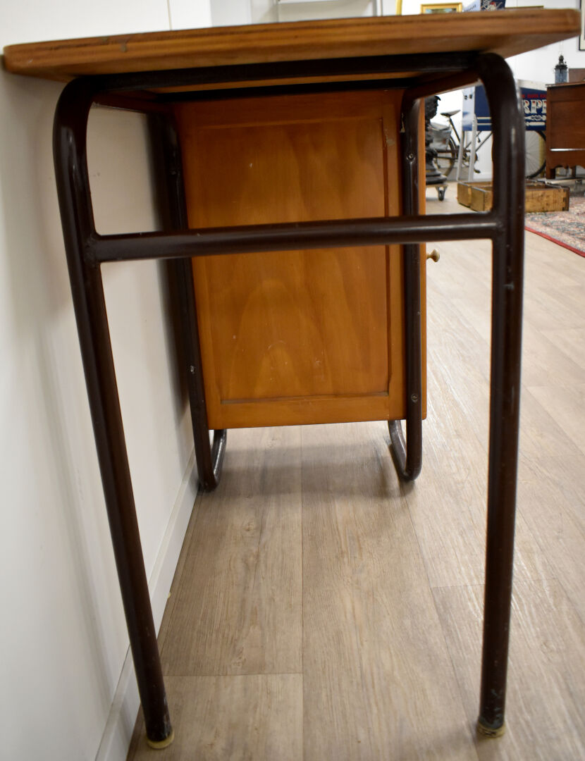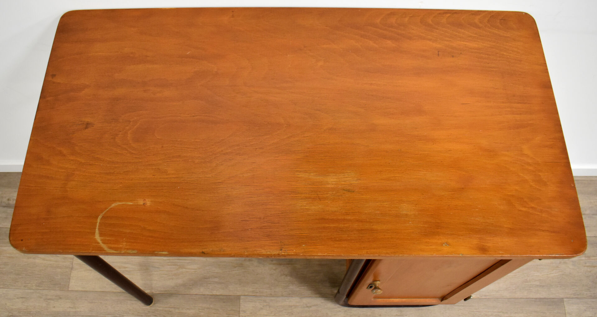 Attribué à Jaques HITIER (1917-1999). Bureau en contre plaqué et métal tubulaire brun (reverni, usures). Le caisson ouvrant à une porte. Vers 1950/1960. Haut. : 78 cm – Larg. : 95 cm – Prof. : 50 cm.