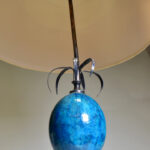 Attribué à la maison CHARLES. Lampe à poser palmier en métal argenté, le fût orné d’un oeuf en résine (?) laqué turquoise (usures à l’argenture, quelques déformations, partie haute tordue). Abat-jour probablement rapporté. Haut. : 90,5 cm.