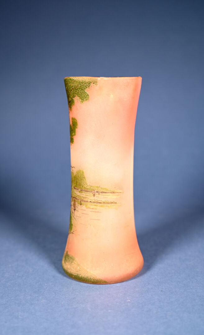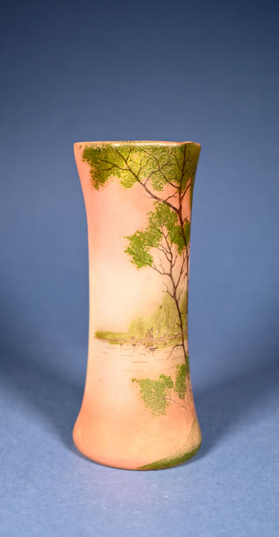 Attribué à Legras. vase fuselé en verre peint d’un paysage lacustre en vert et brun sur fond orangé. Haut. : 28 cm.
