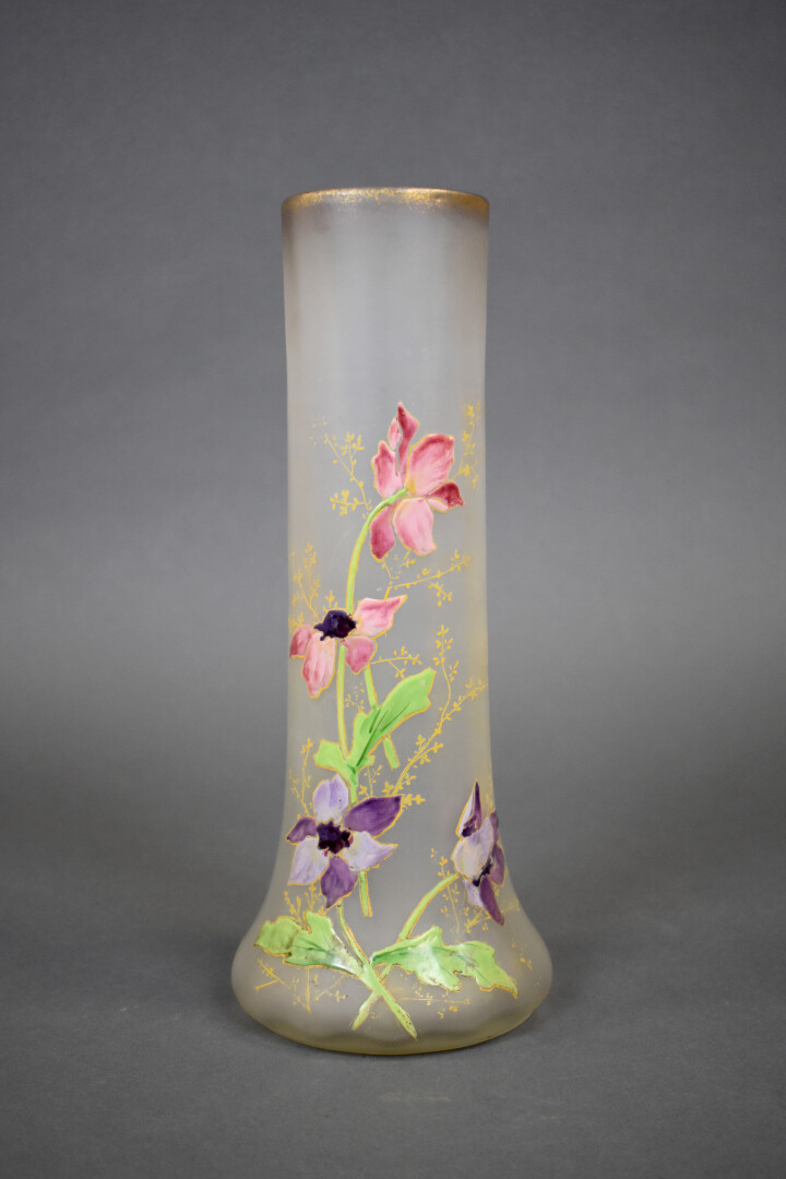 Attribué à Legras. Vase rouleau à base bourelée en verre dépoli à décor émaill de fleurs en polychromie (légères usures). Haut. : 30, 5 cm.