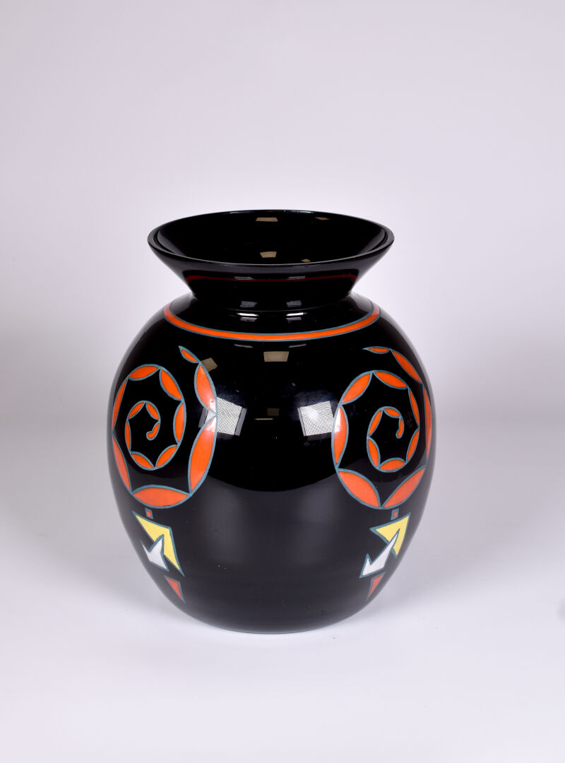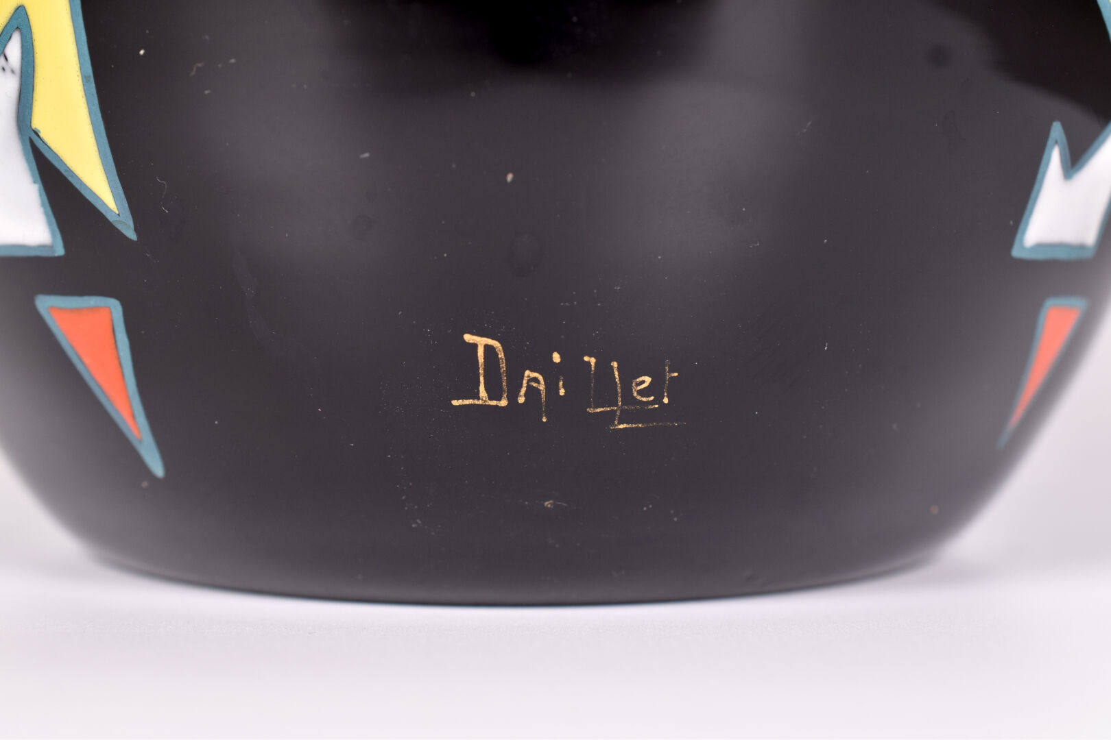 Attribué à Maurice DAILLET. Vase boule en verre opalin noir à décor émaillé en rouge jaune et blanc de motifs géométriques (quelques égrenures au col. Signé. Haut. : 21 cm.