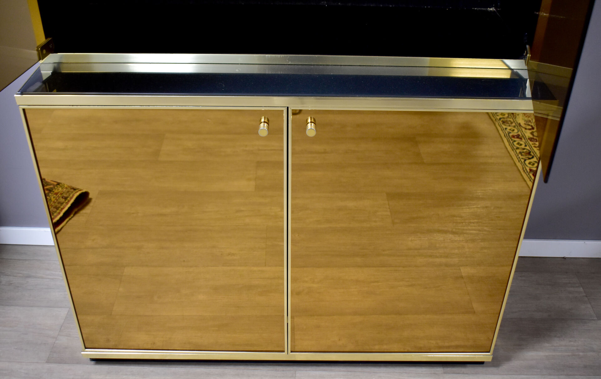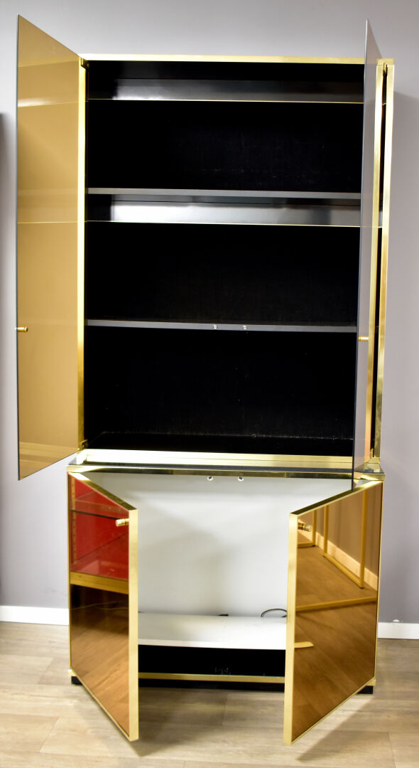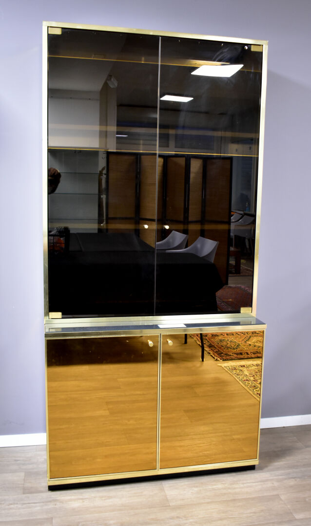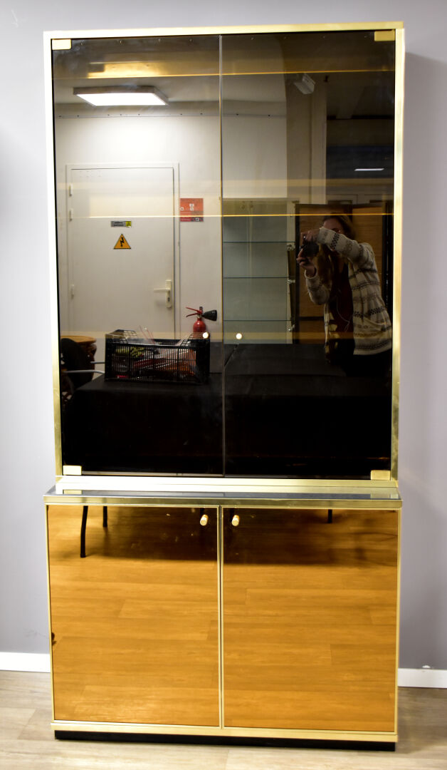 Attribué à Renalto ZEVI pour METALARTE. Meuble vitrine en métal doré ouvrant à deux portes en verre fumé en partie haute et deux abbatants en partie basse (usures d’usage). Haut. : 204 cm – Larg. : 100 cm – Prof. : 48 cm.