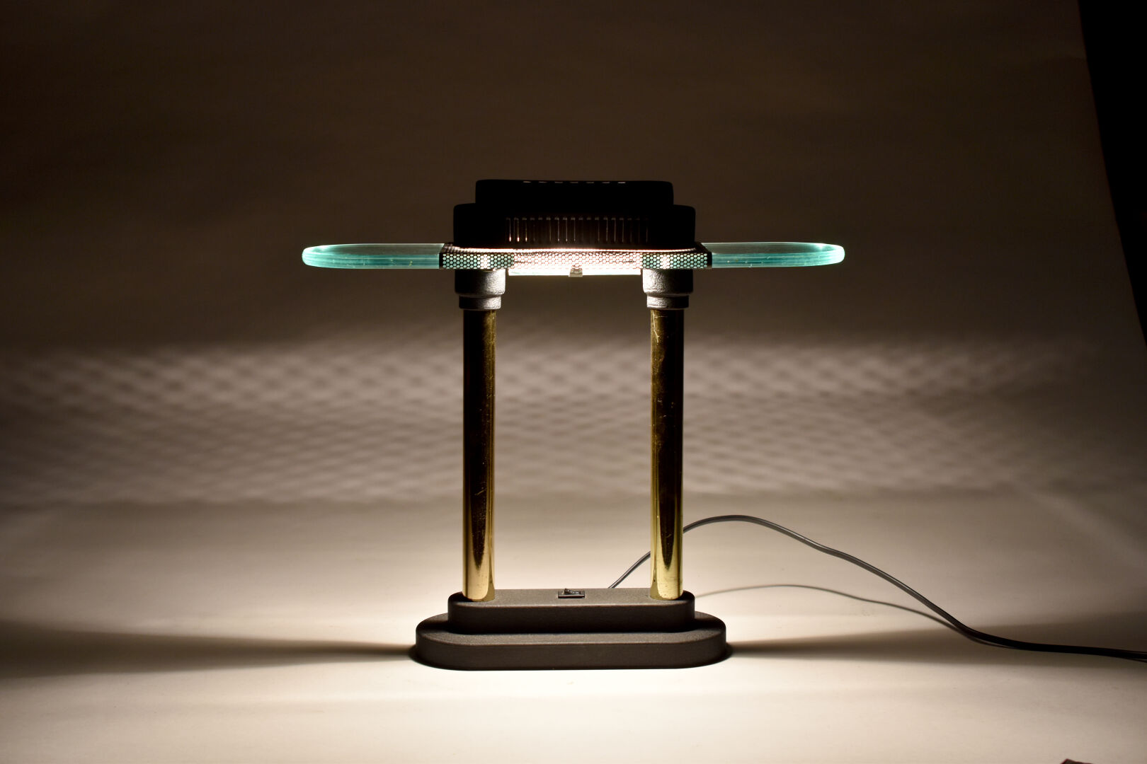 Attribué à Robert SONNEMAN. Lampe à poser en métal laqué noir et doré modèle Penta. Le fût à double colonne. Le diffuseur à plaque de verre clair entourée d’une plaque de métal perforé. Haut. : 37 cm.