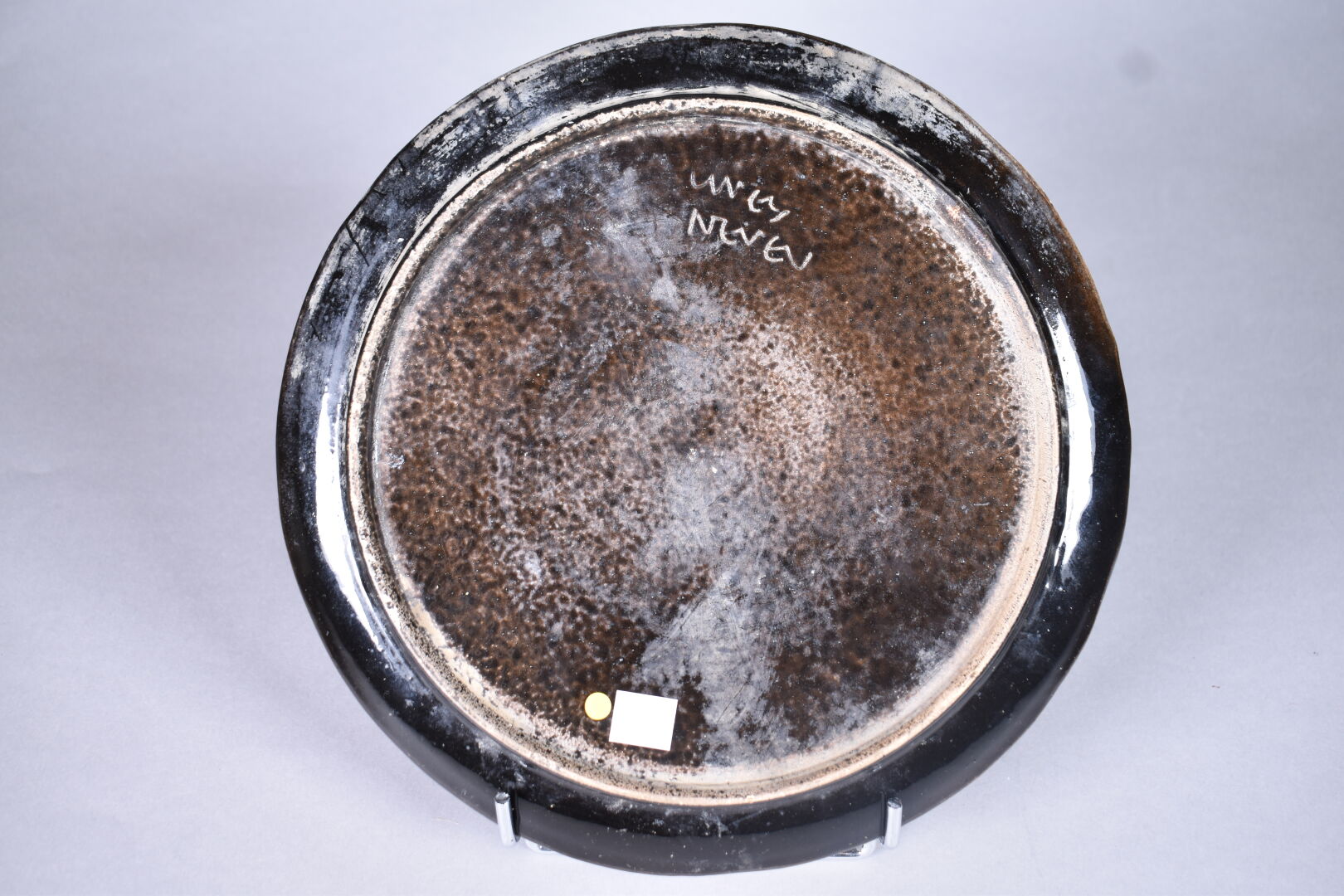 Attribué à Yves NEVEU (XXe siècle). Plat en céramique à décor émaillé en polychromie de Poséïdon. Signé au dessous. Diam. : 28 cm.