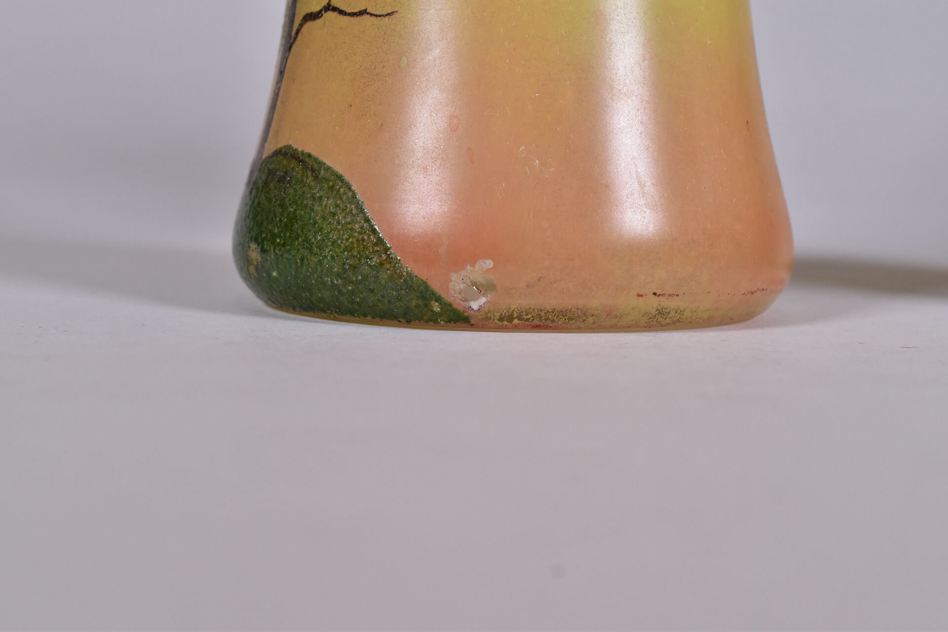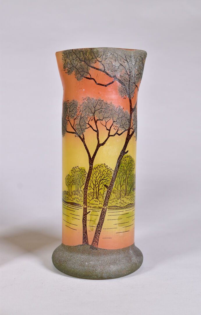 Attribués à LEGRAS. Deux vases rouleaux en verre à décor émaillé peint de paysages lacustres sur fond jaune orangé (un éclat). Haut. : 28 et 27 cm.