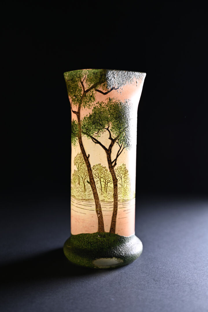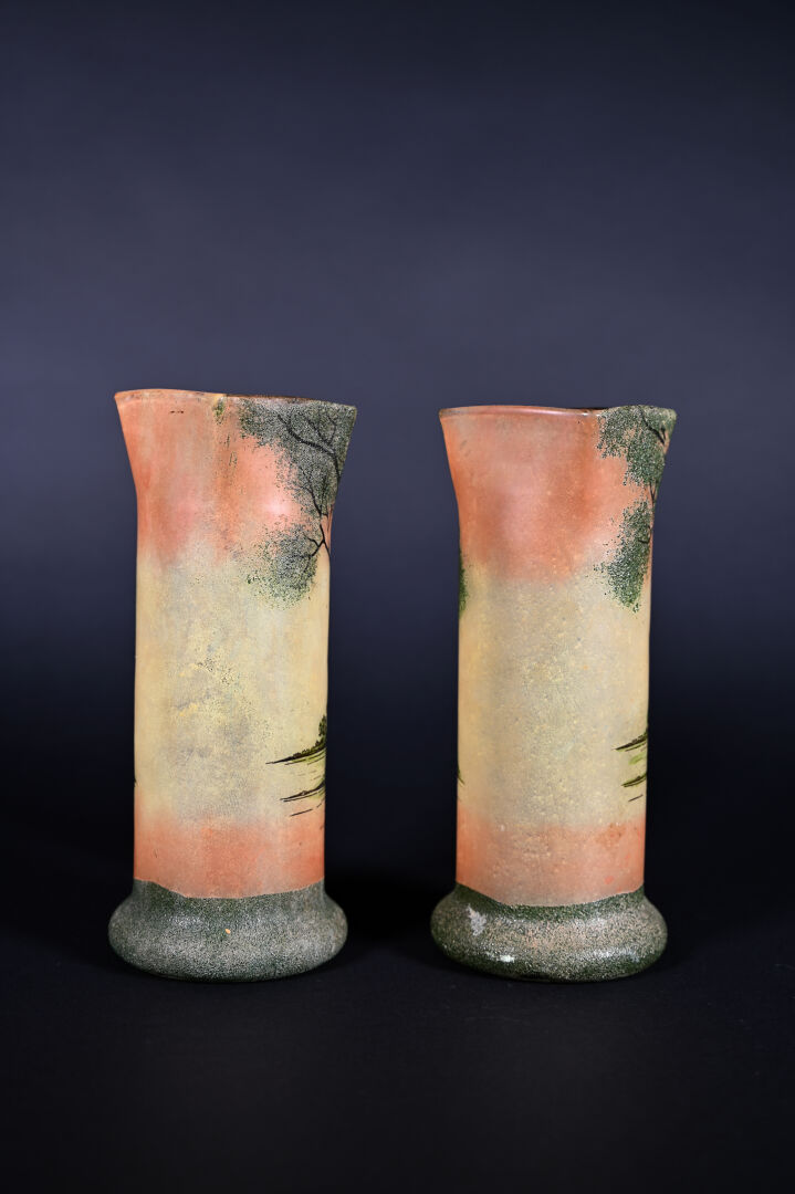 Attribués à LEGRAS. Paire de vases en verre émaillé et peint d’arbres en vert et brun sur fond orange (usures et frottements). Haut. : 26,5 cm.