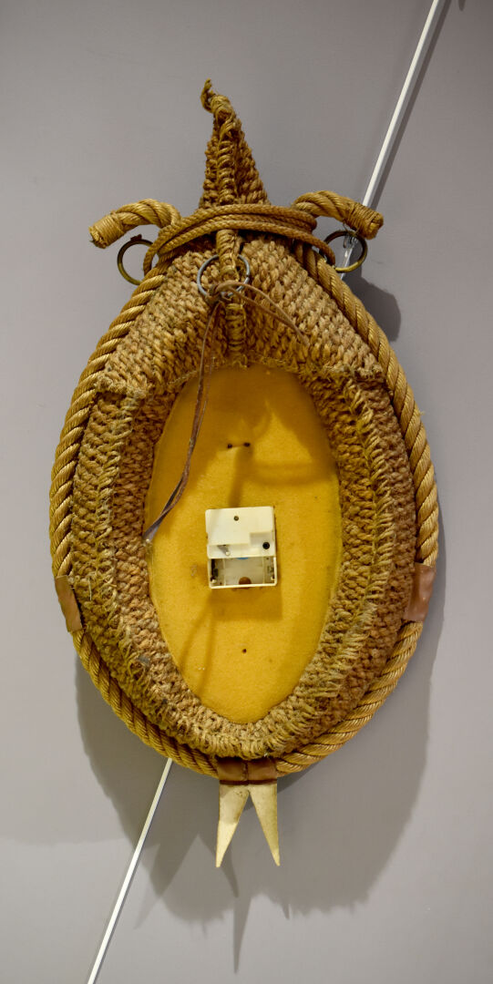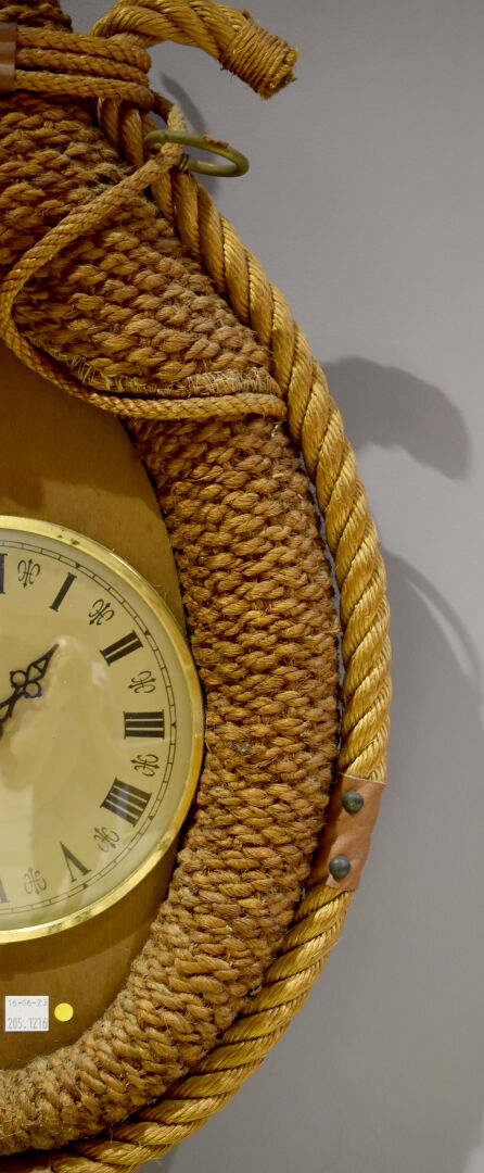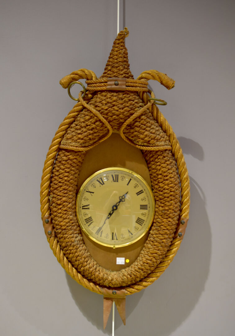 AUDOUX MINET. Pendule à monture en corde nouée et tressée, métal et cuir fauve (quelques usures). Cadran à chiffres romains. Haut. : 76 cm.