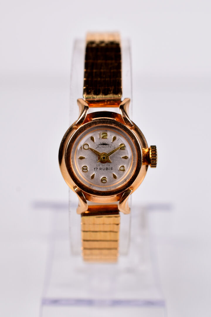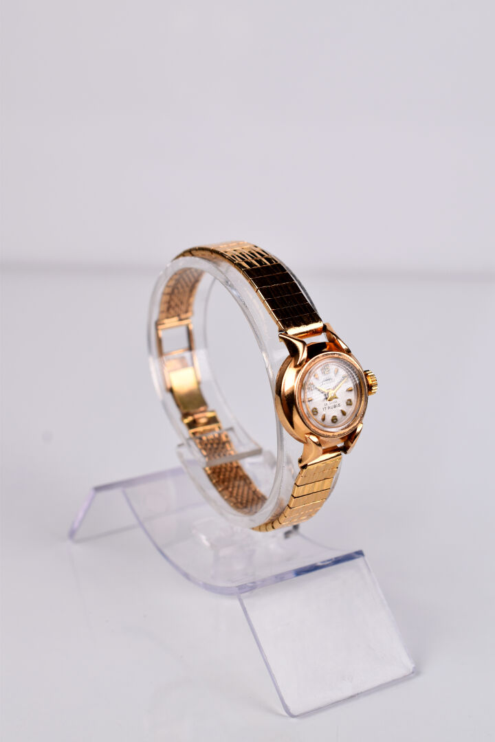 AURORE. Montre bracelet de dame tout or 18K 750/1000e, mouvement quartz Dim. du boitier. : 18 mm. Long bracelet. : 15 cm. Poids brut. : 25 g.