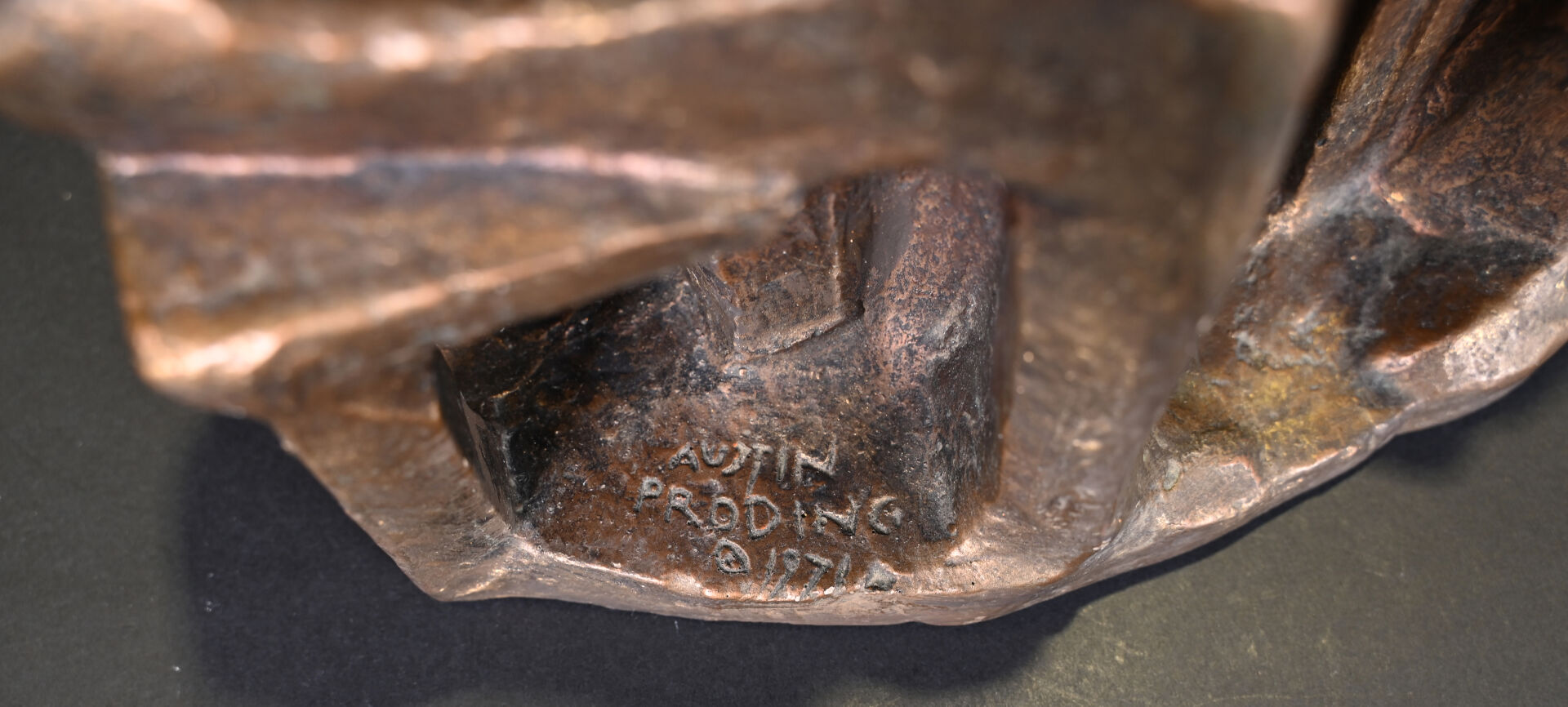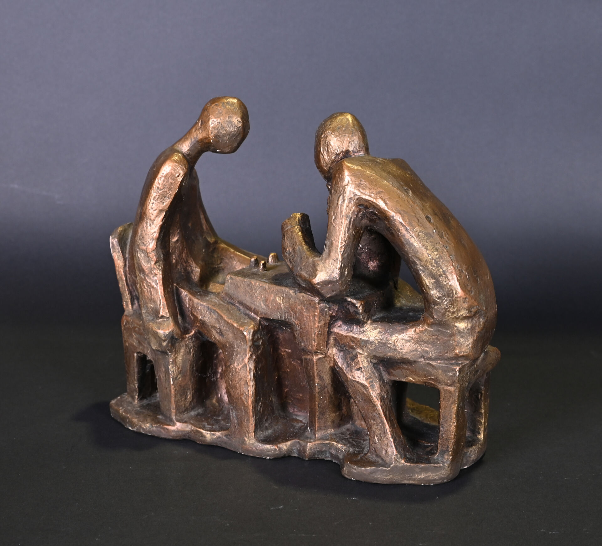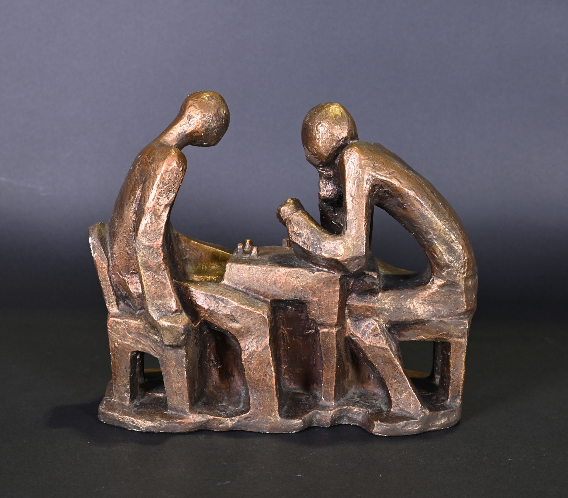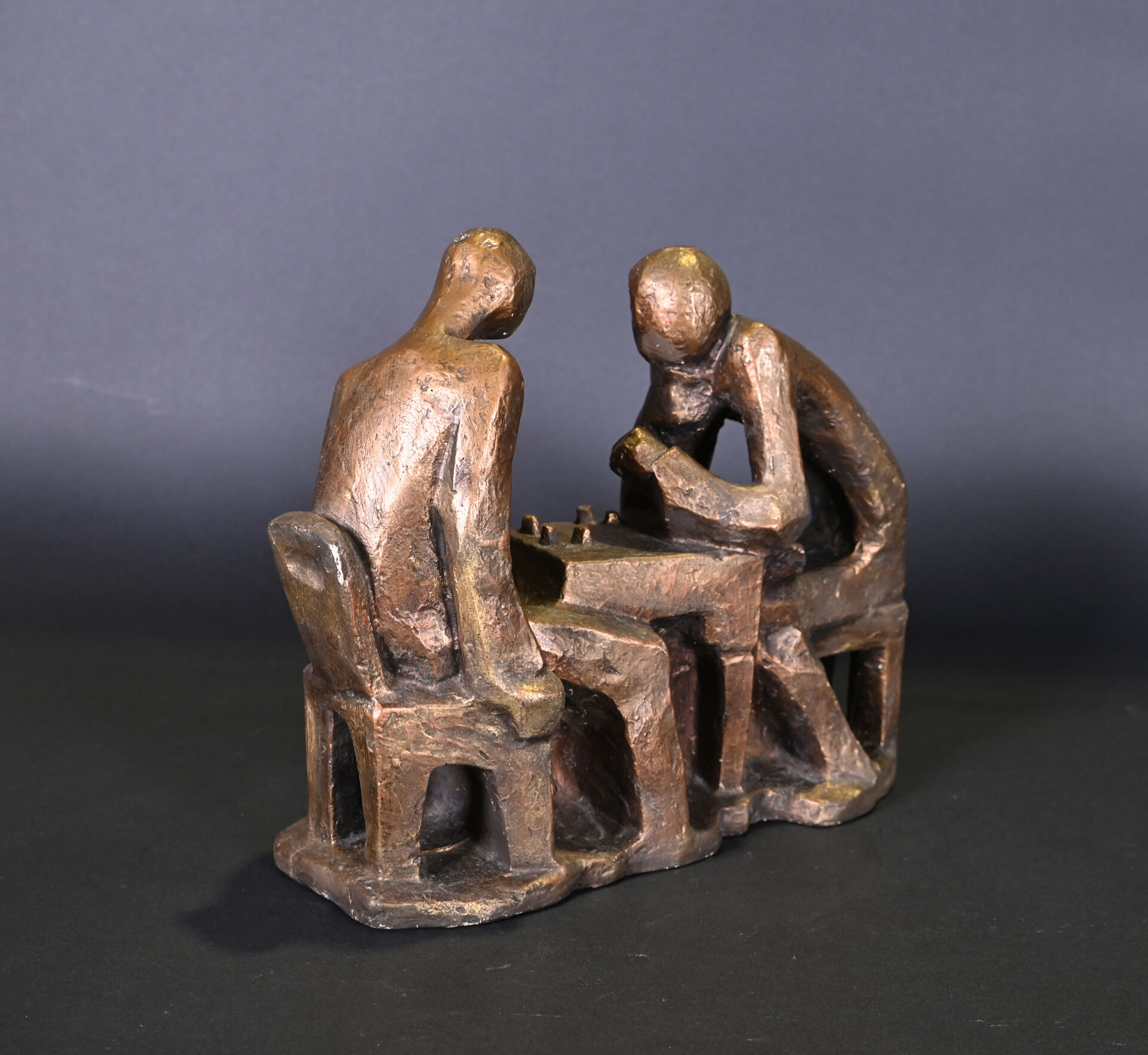 AUSTIN PRODING FISHER. Sculpture en matériaux composite couleur bronze représentant des joueurs d’échec. Signé à la base et daté 1971. Haut. : 24,5 cm – Larg. : 32 cm.