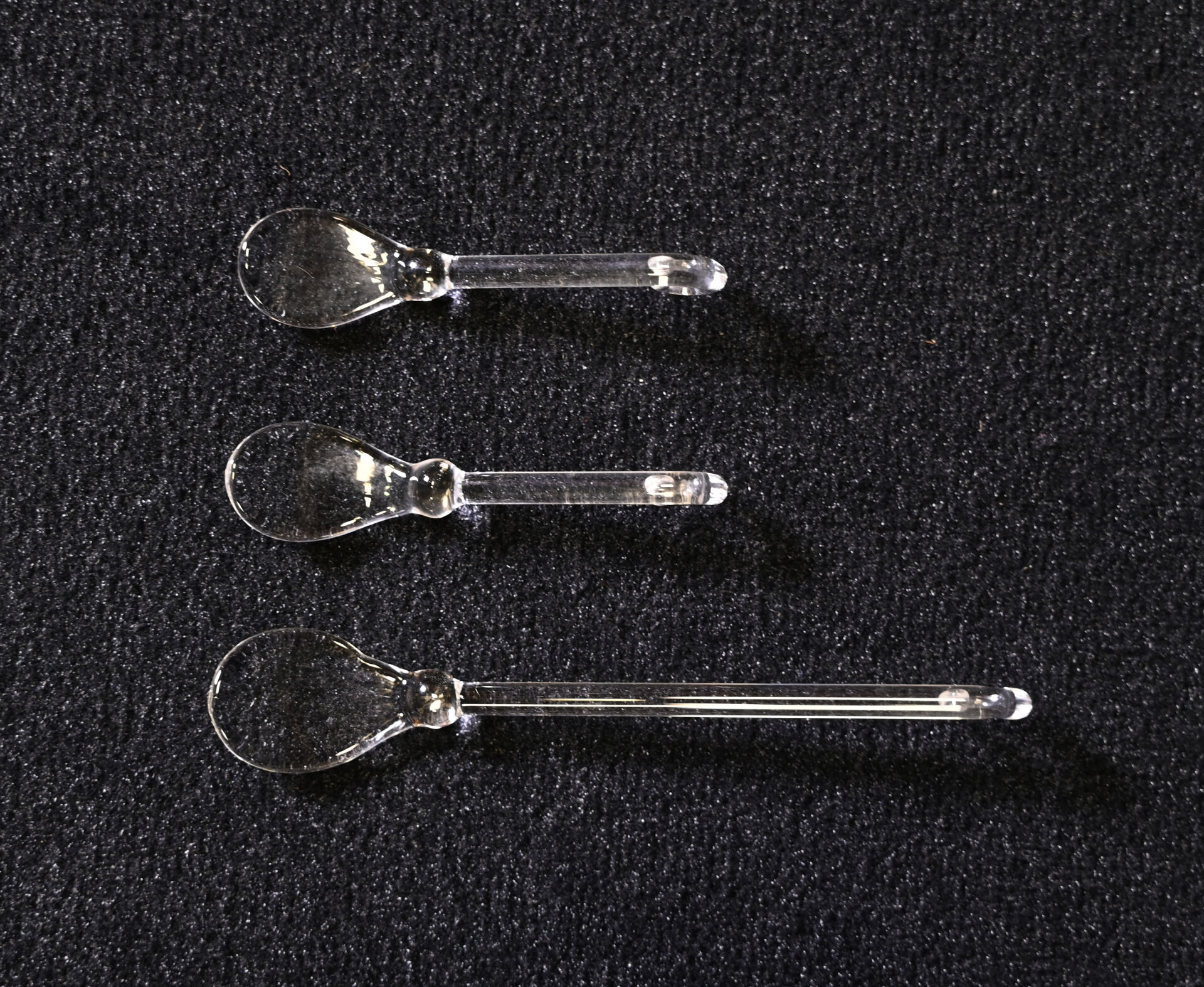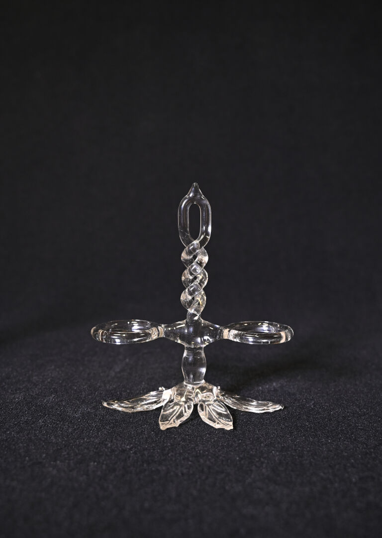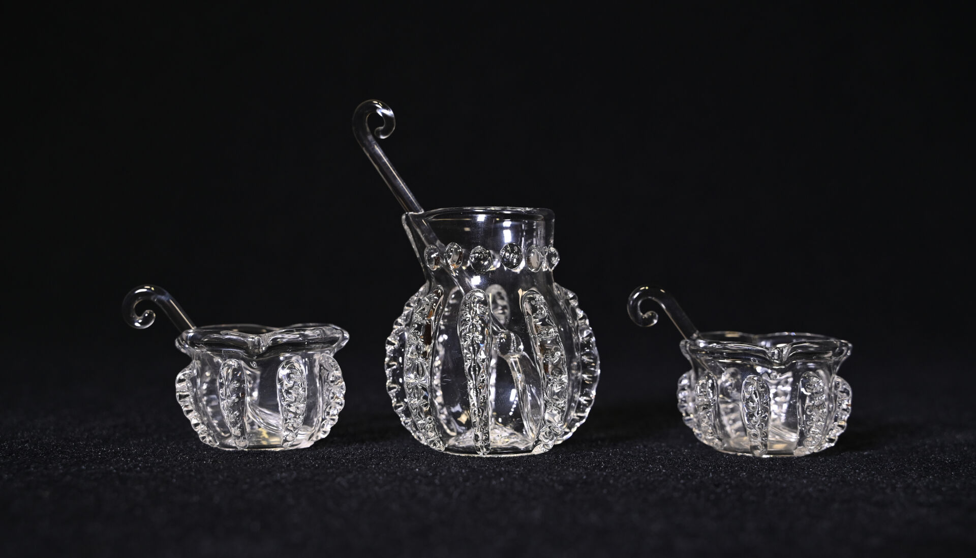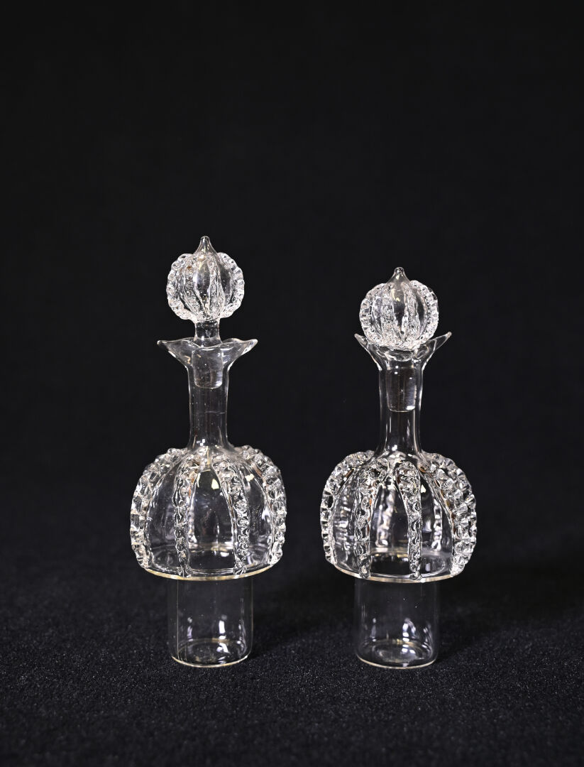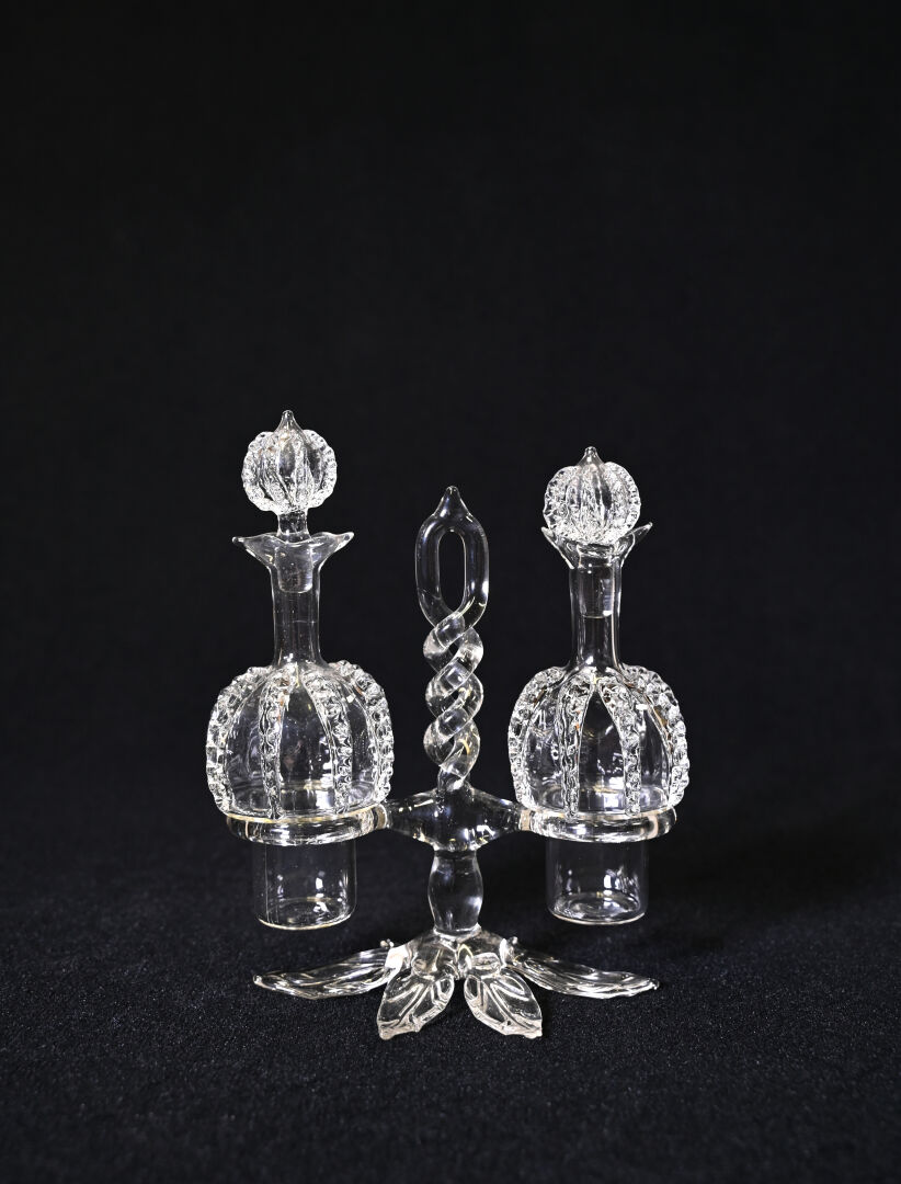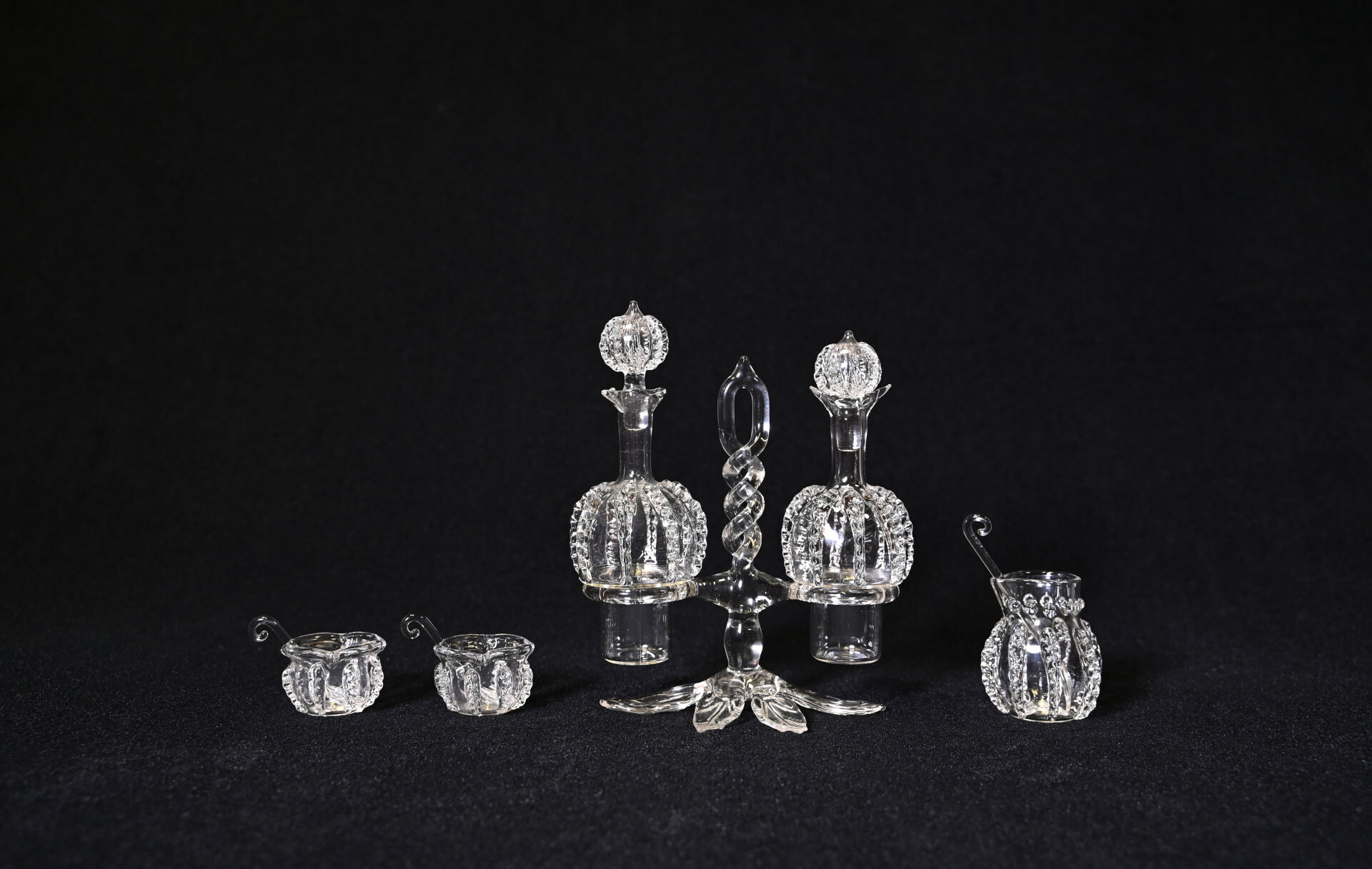 AVIALAS. Ensemble en verre et verre moulé soit un huilier/vinaigrier, un moutardier, une salière/poivrière avec les 3 cuillères. Marqué sous la monture de l’huilier.