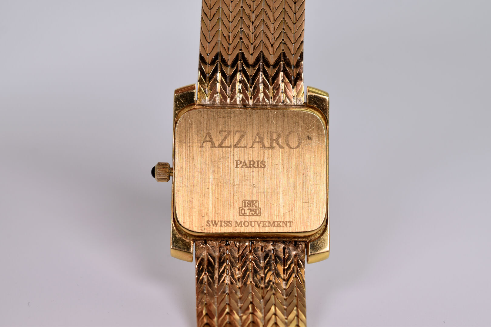 AZZARO. Montre de dame tout or 18K 750/1.00e. Boitier carré épaulé de diamants en pavage. Cadran fond blanc avec guichet dateur à 4 heures. Mouvement quartz (fonctionne). Bracelet à maille tressée. Chaîne de sécurité manquante. Long. Poignet : 18 cm – Dim. boitier : 28 x 30 mm. Poids brut : 76,4g. Avec boite (usée).
