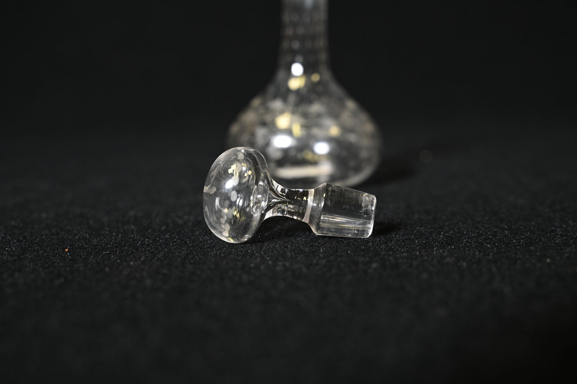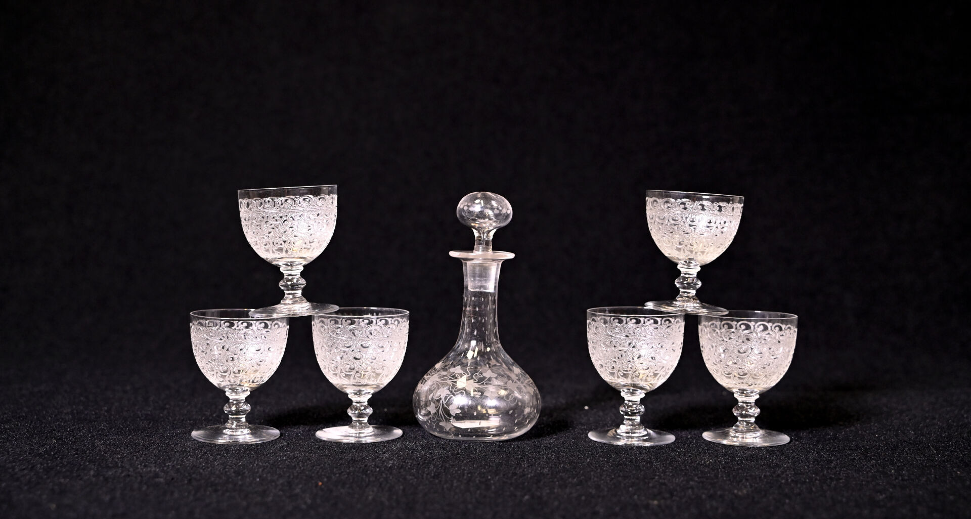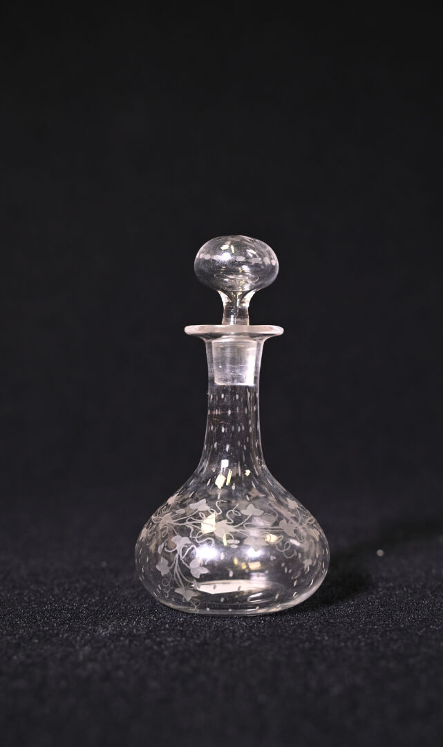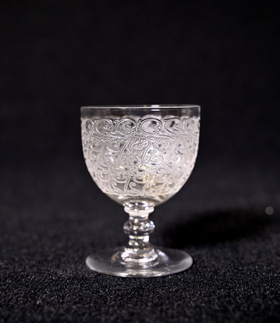 BACCARAT (avant 1936). Suite de 6 verres à liqueurs en cristal gravé modèle Rohan (Haut. : 7,5 cm). On joint une petite carafe à décor de vigne. Non marqués, début du XXe siècle.
