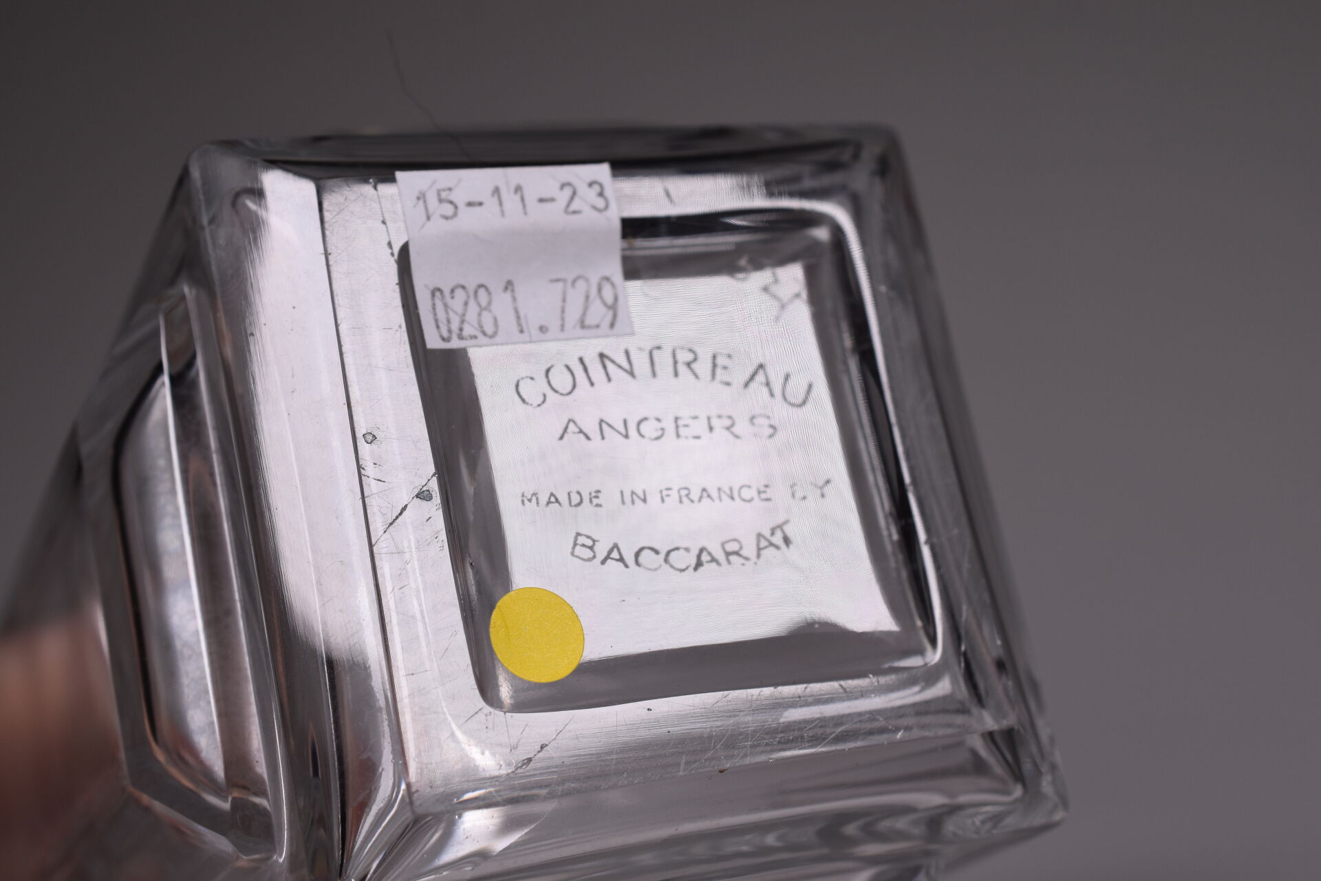 BACCARAT. Carafe et son bouchon pour cointreau d’Angers en cristal moulé (une égrenure sur le bouchon, au niveau de la tige). Marqué. Haut. : 22,5 cm.