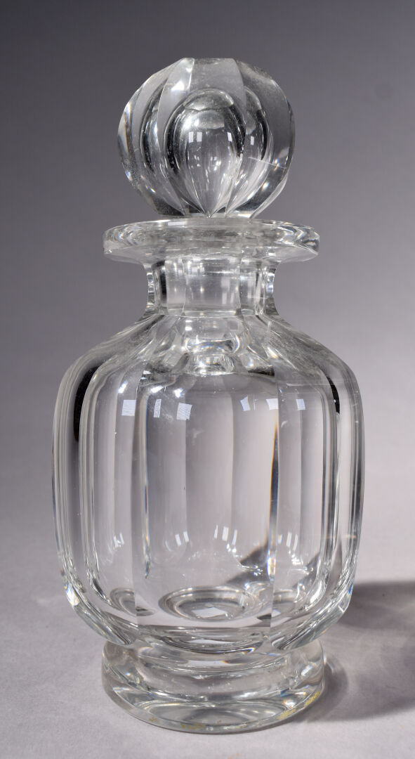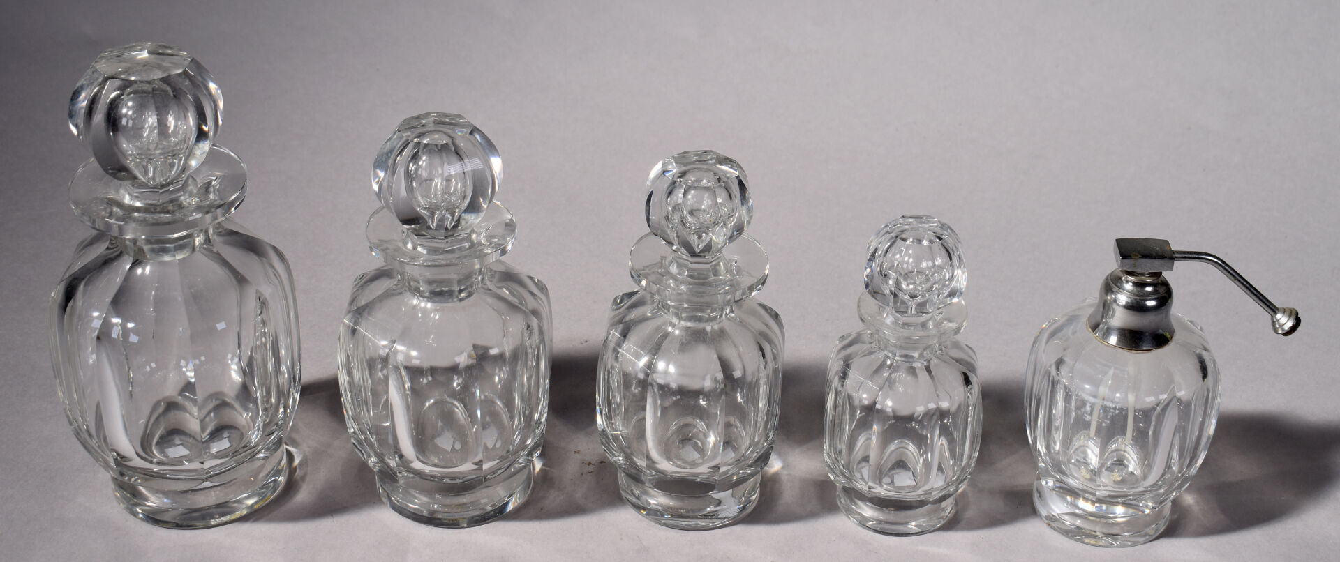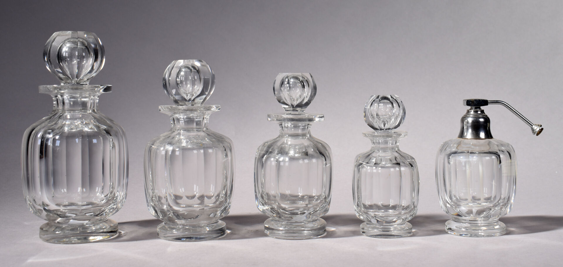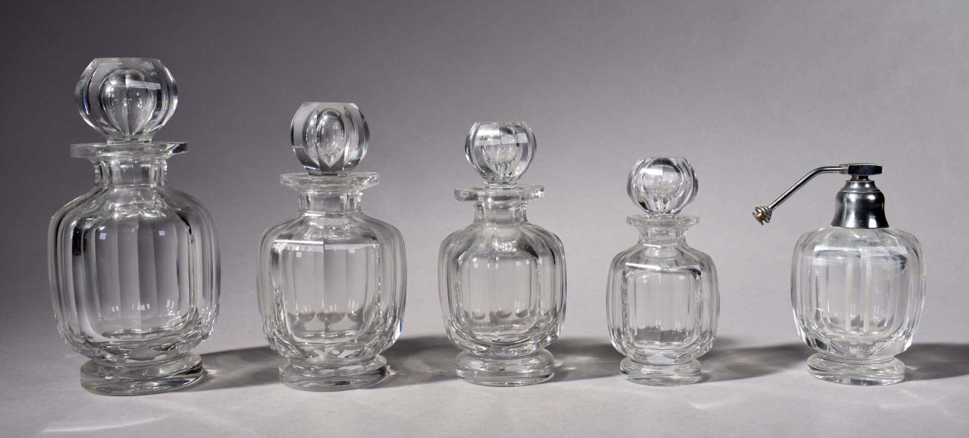 BACCARAT. Nécessaire de toilette en cristal modèle « Harcourt » comprenant 4 flacons et leurs bouchons et un vaporisateur sans sa poire (égrenures aux bouchons et à l’intérieur du col pour un). Vaporisateur marqué. Début du XXe siècle. Haut. du plus grand flacon : 20 cm.