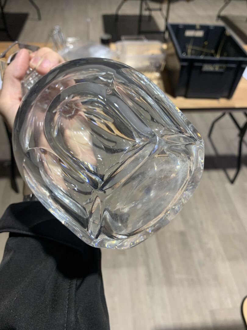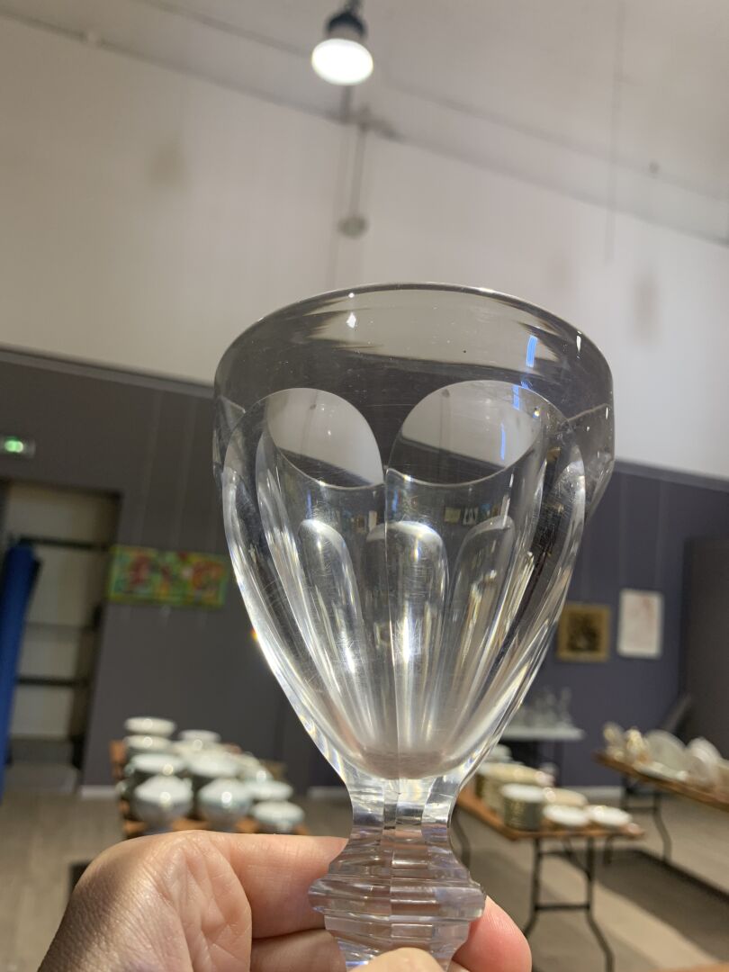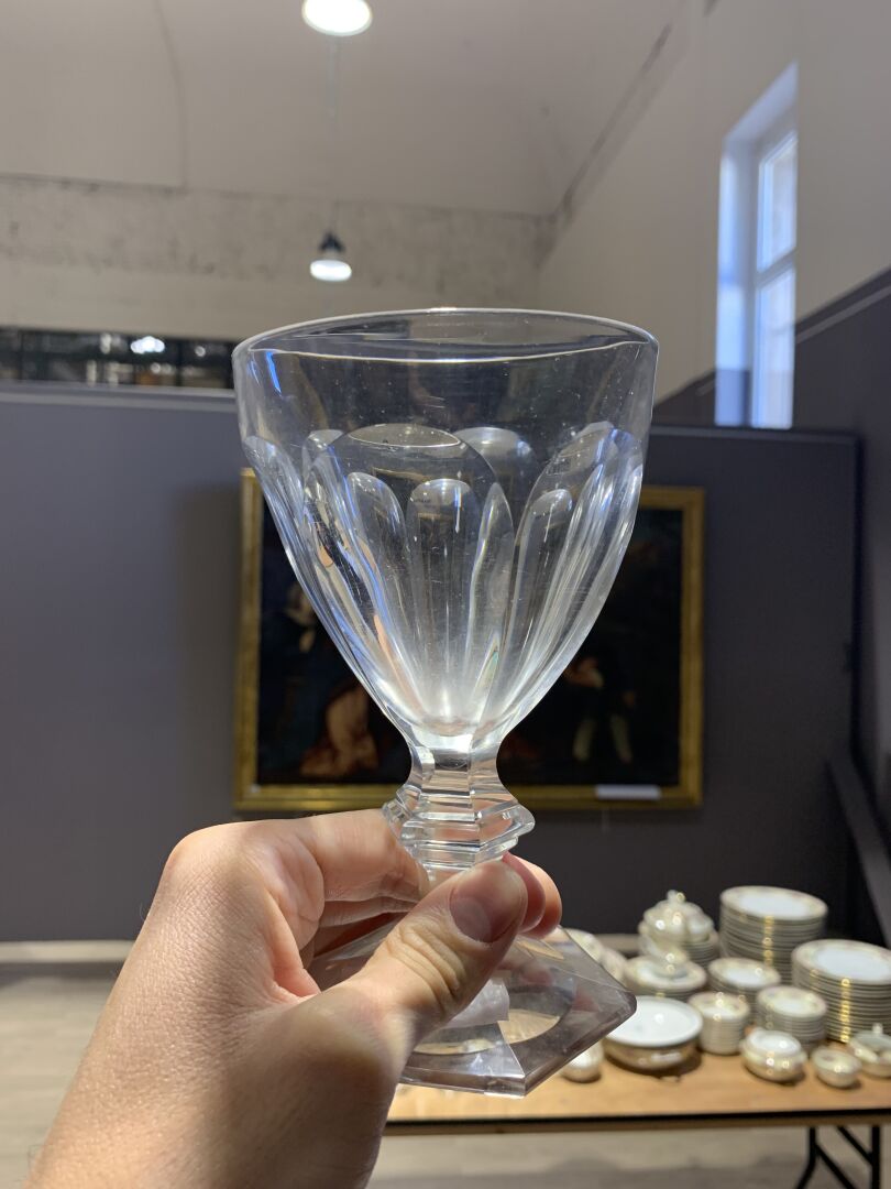 BACCARAT. Partie de service de verres en cristal modèle Harcourt comprenant une carafe avec bouchon, 5 verres à eau, 7 verres à vin rouge, 6 verres à vin blanc, 5 coupes à champagne (usures d’usage et traces de calcaire pour la carafe et un seul verre à eau). Boites individuelles (manque une). Marqués.