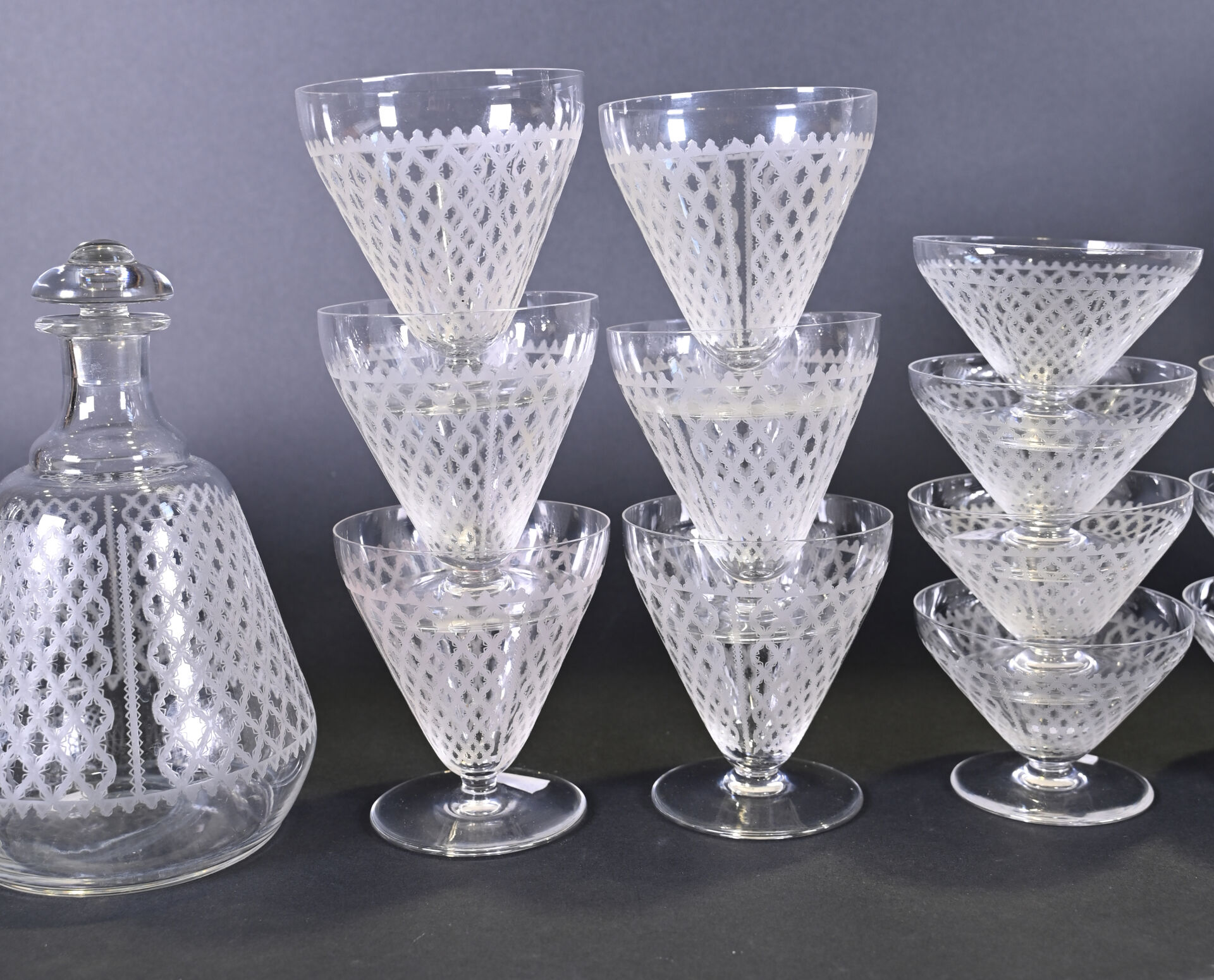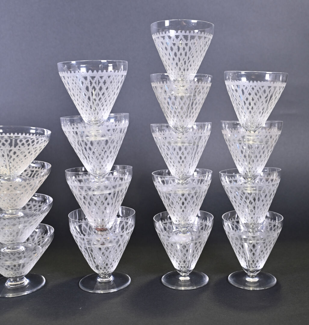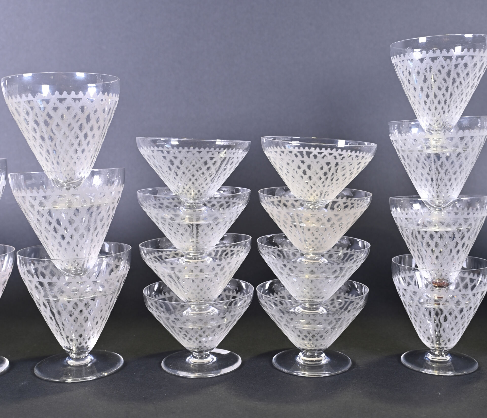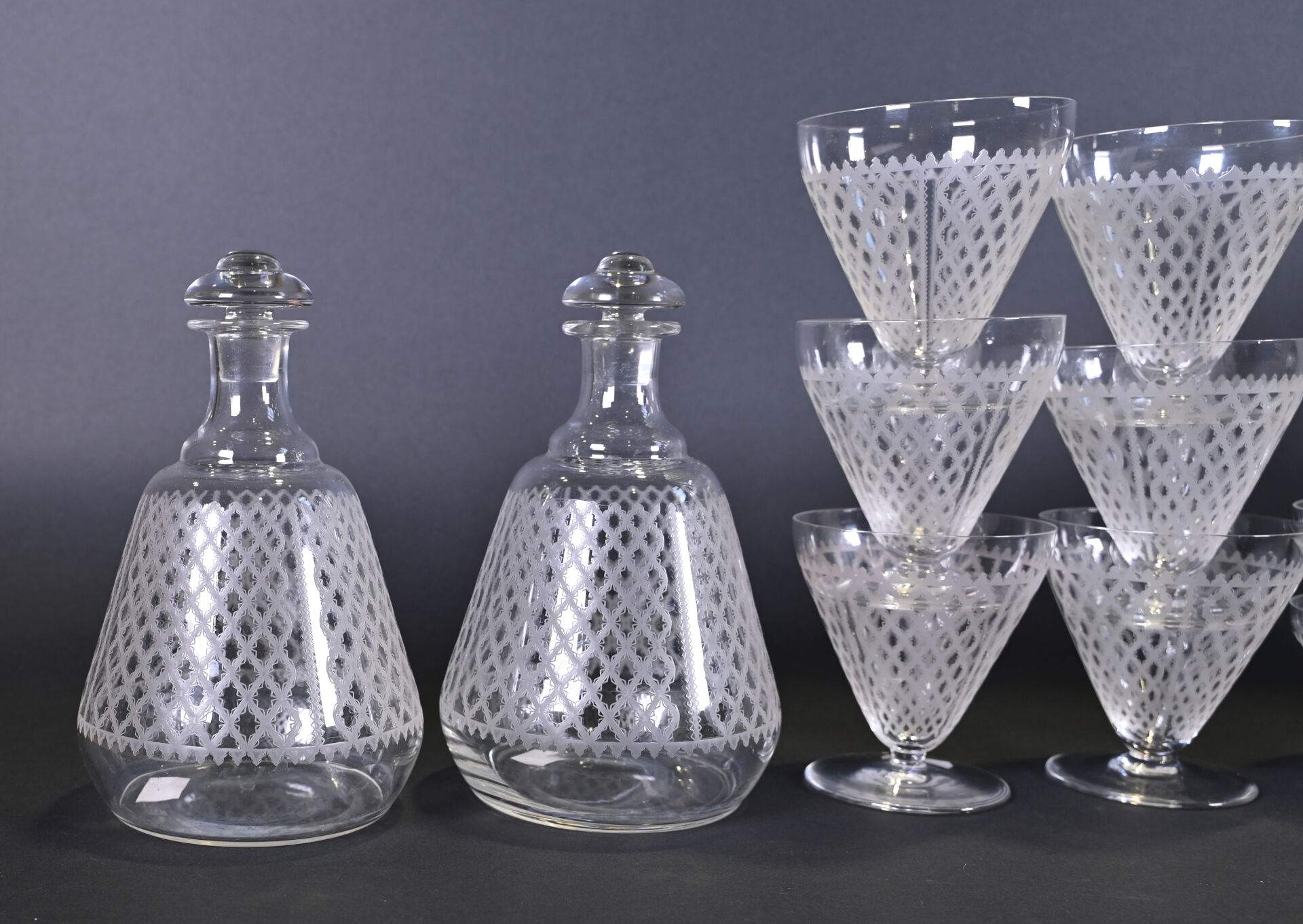 BACCARAT. Partie de service de verres modèle « Alhambra » comprenant 2 carafes, 6 verres à eau , 8 coupes à champagne, 4 verres à vin, 9 verres à Porto (égrenures, éclats).