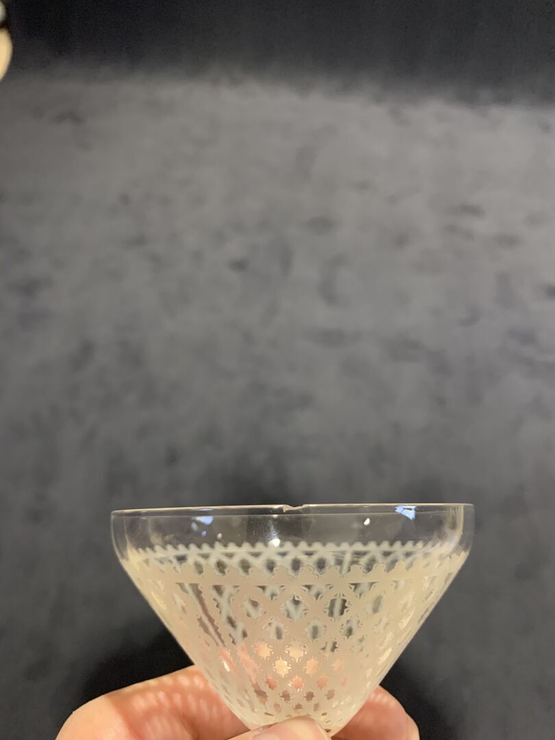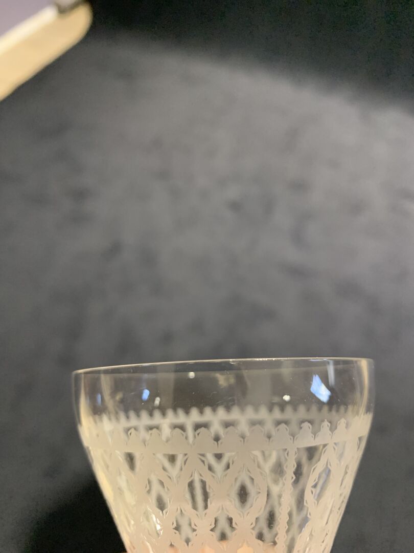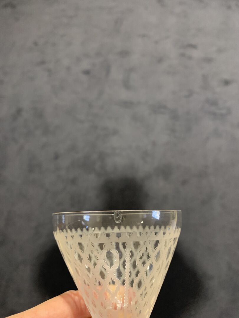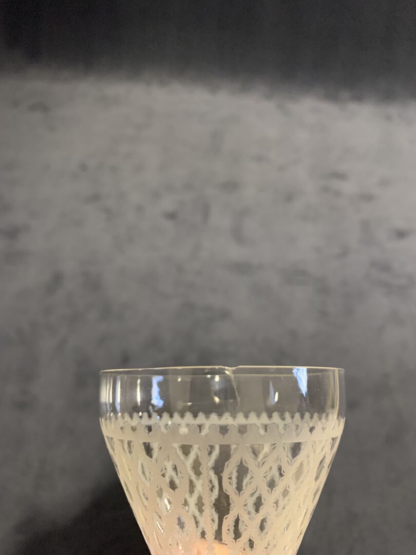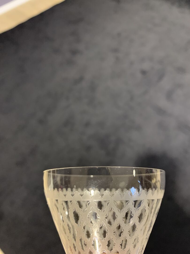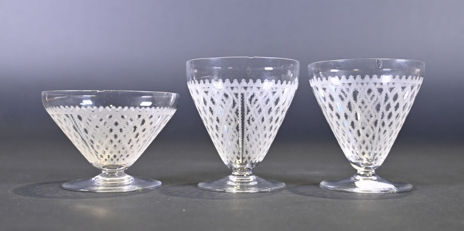 BACCARAT. Partie de service de verres modèle « Alhambra » comprenant 2 carafes, 6 verres à eau , 8 coupes à champagne, 4 verres à vin, 9 verres à Porto (égrenures, éclats).