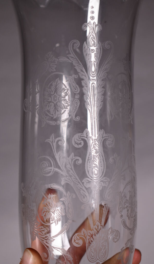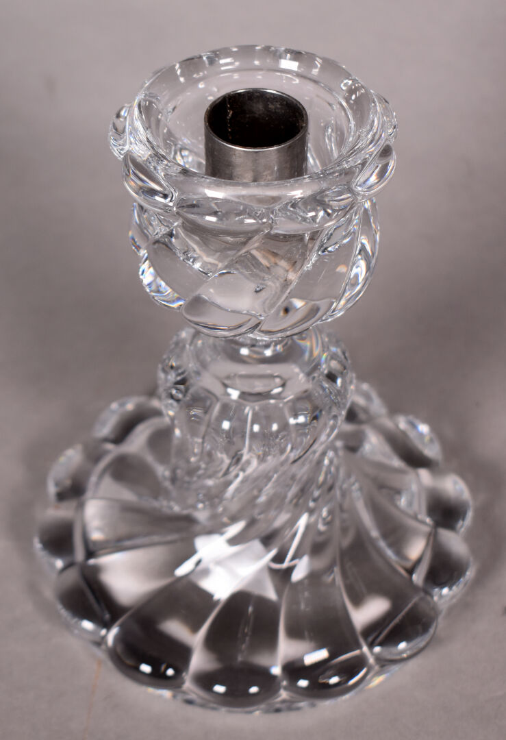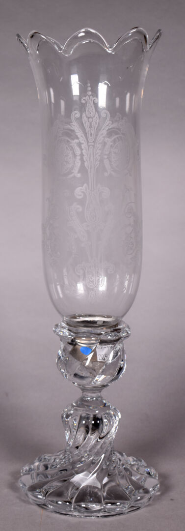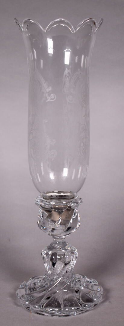 BACCARAT. Photophore, le pied en cristal moulé godronné. La tulipe à décor gravé d’arabesques. Marqué au dessous. Haut. : 41 cm.