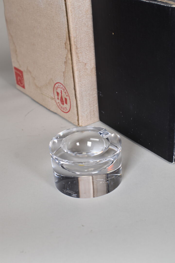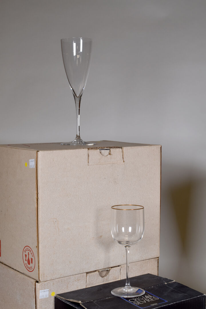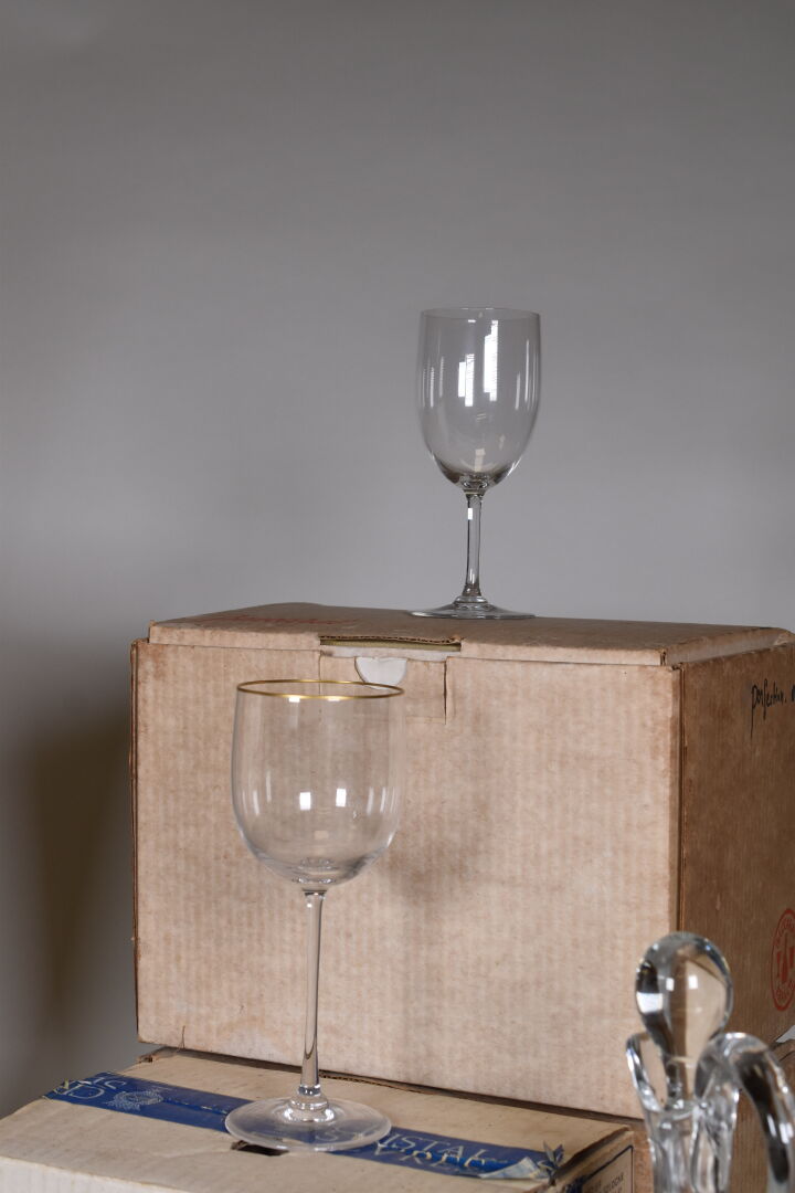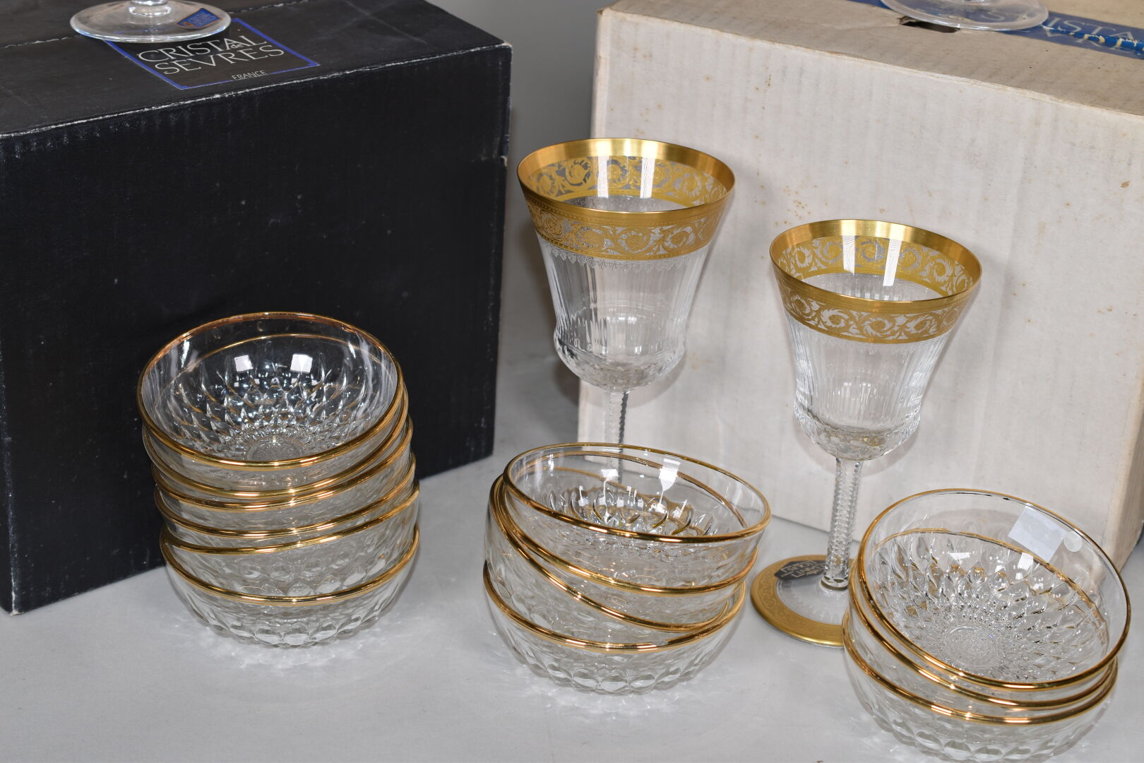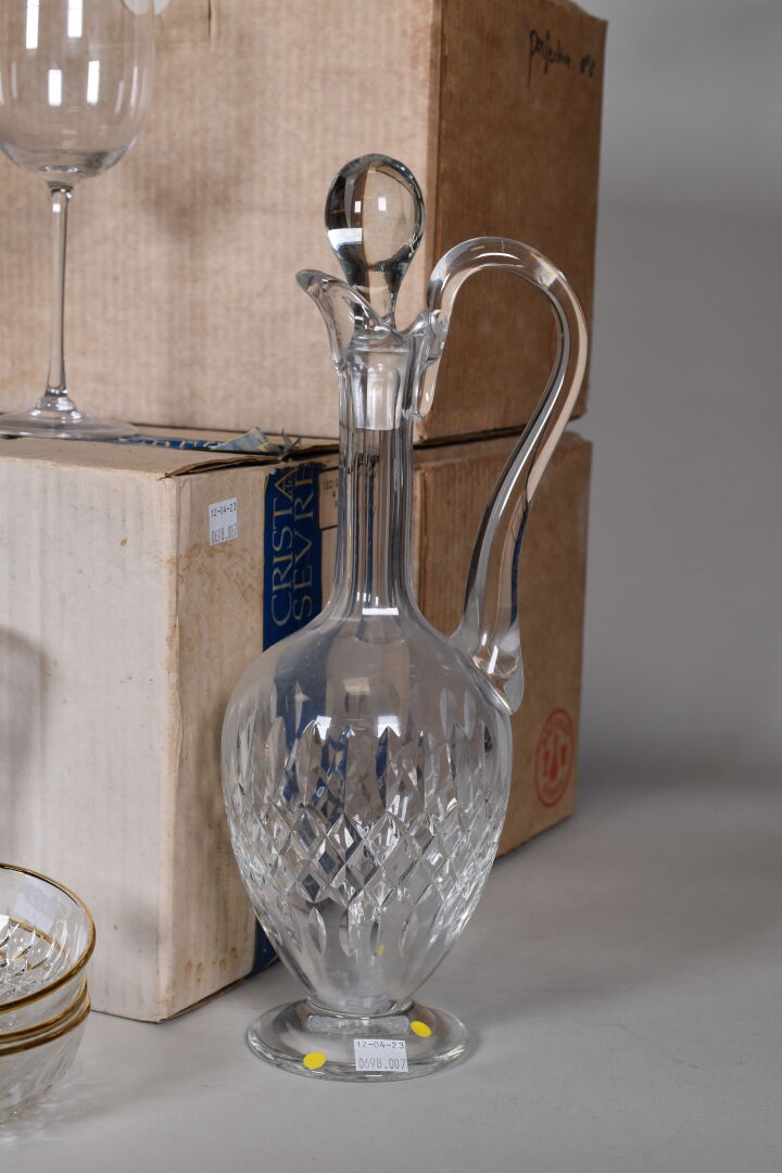 BACCARAT – ST LOUIS – CRISTAL DE SEVRES. Ensemble de verres à pied, carafe et cendrier en cristal dont deux verres dorés modèle Thisle. Marqués. Boites d’origine.