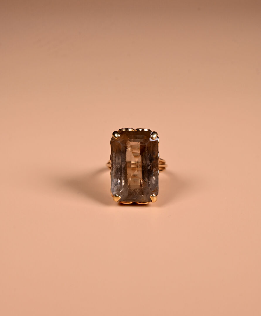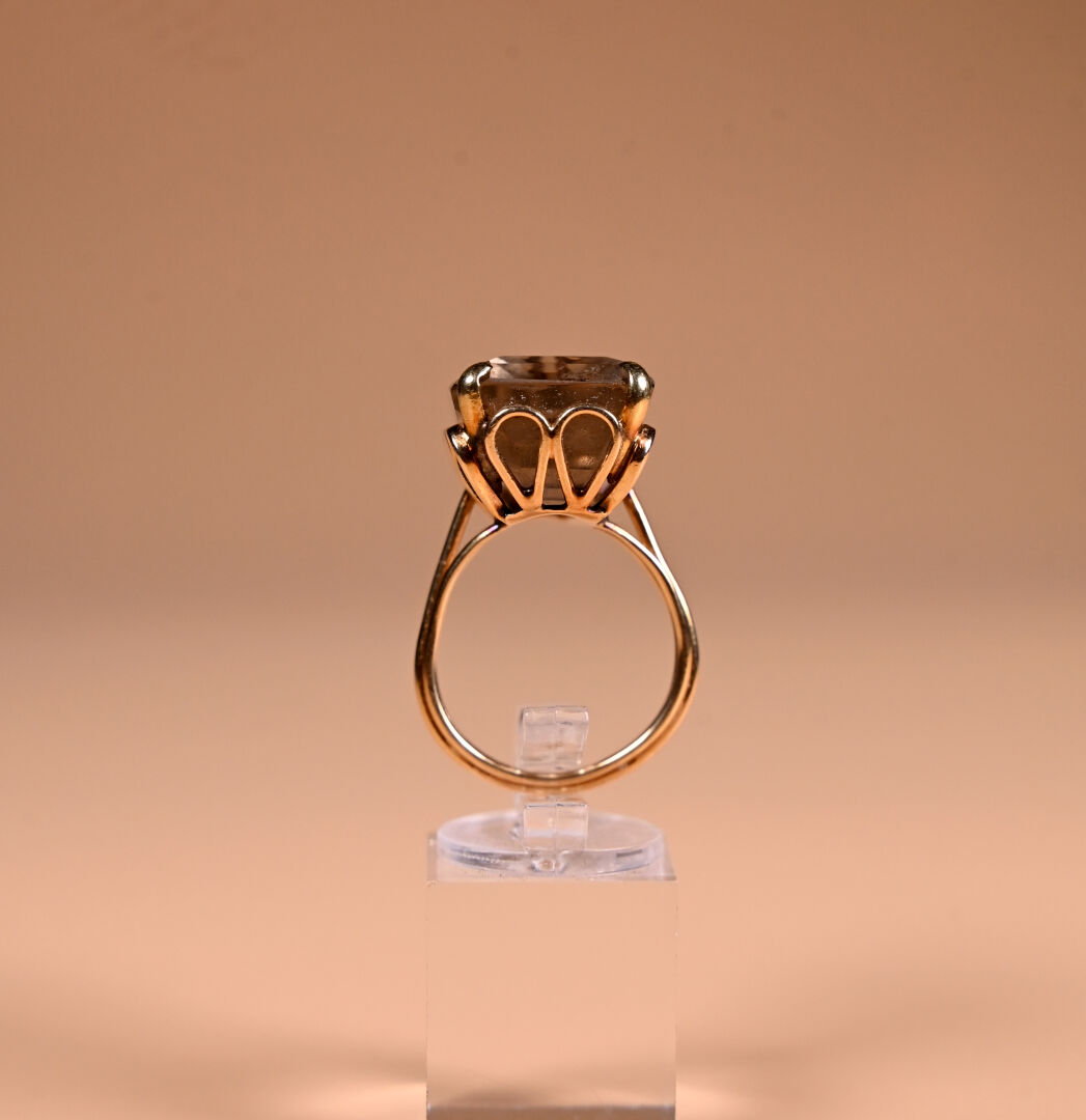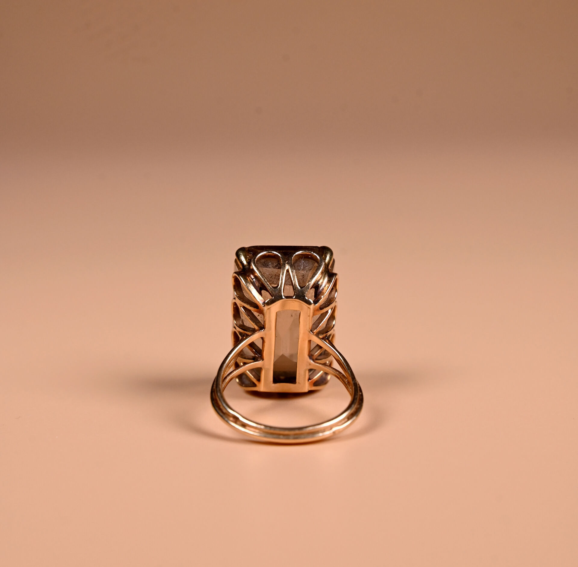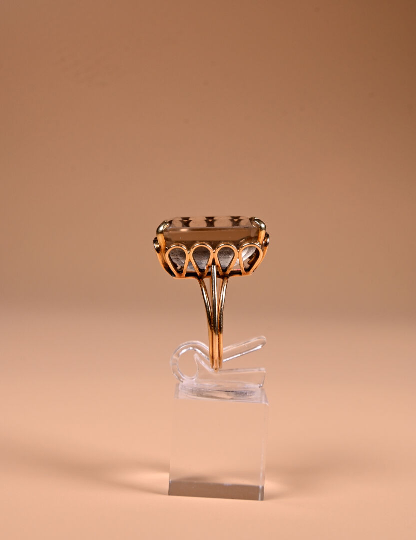 Bague cocktail en or jaune 18K 750/1000e et quartz fumé (usé). TDD 60. Poids brut. : 15,2g.