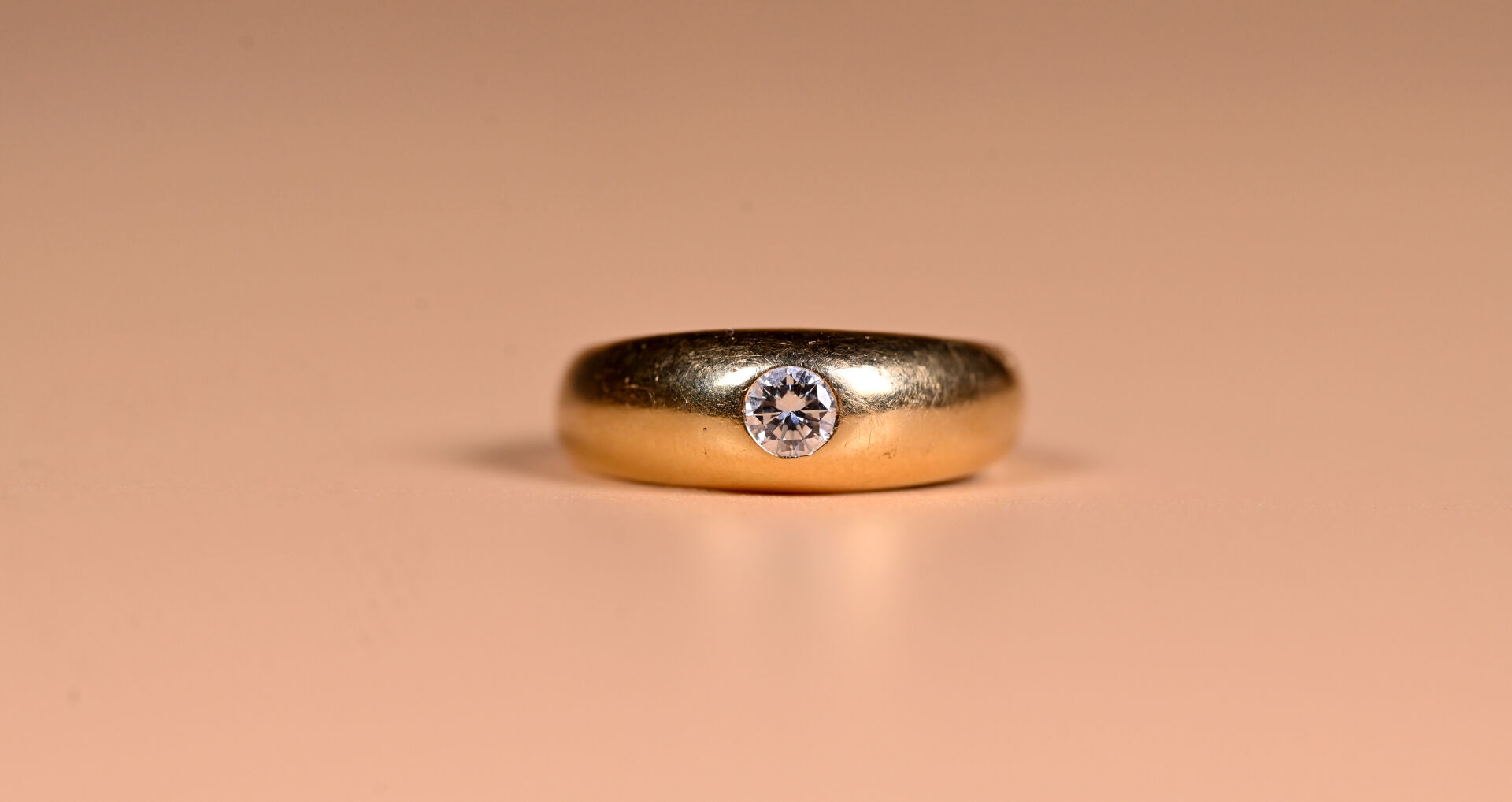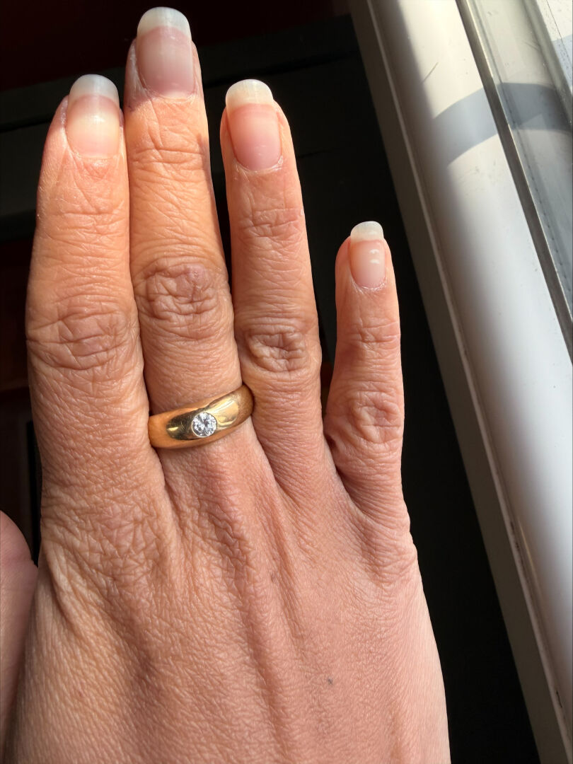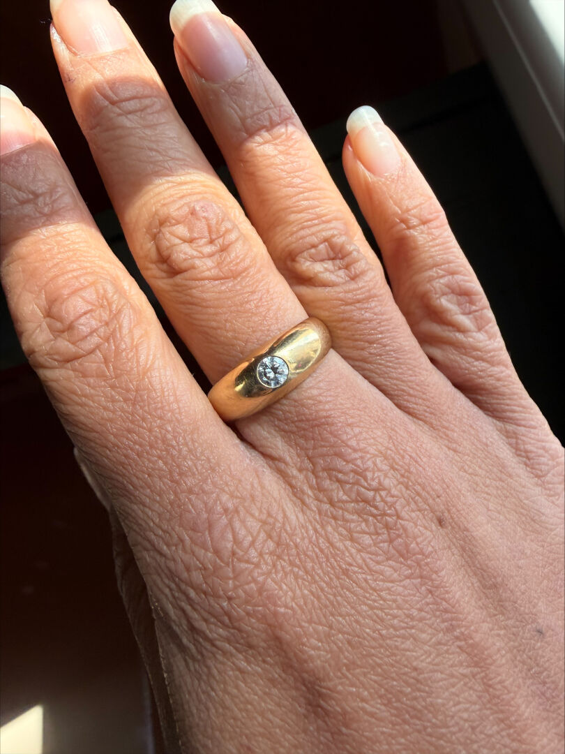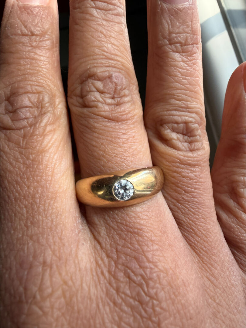 Bague dite « jonc anglais » en or jaune 18K 750/1000e et diamant taille moderne d’environ 0,20 ct. Qualité estimée : IJ-VS2. TDD 61. Poids brut. : 7,3 g.