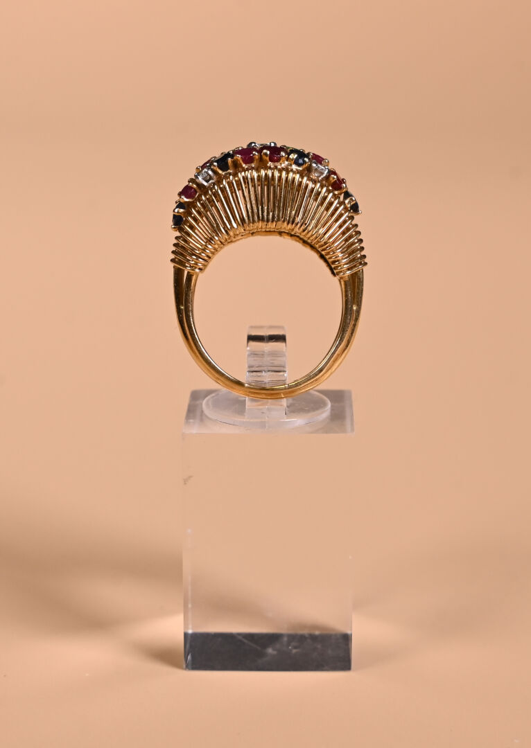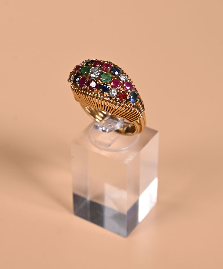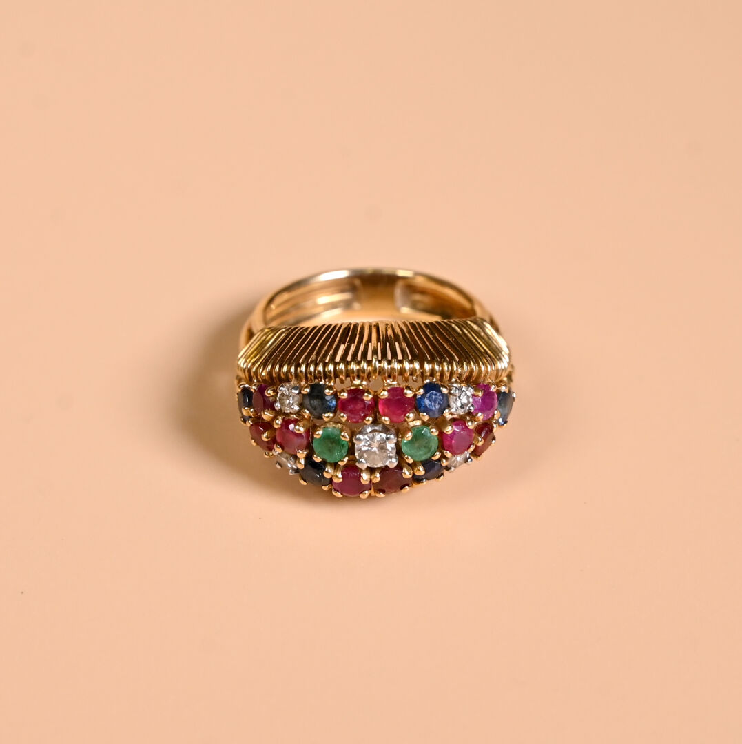 Bague dôme en or jaune 18K 750/1000e sertie de petits rubis, saphirs, émeraudes et diamants. TDD 54/55. Poids brut. : 9,83 g.
