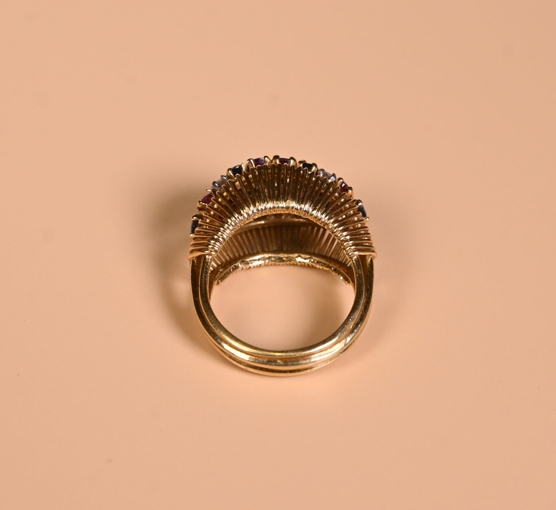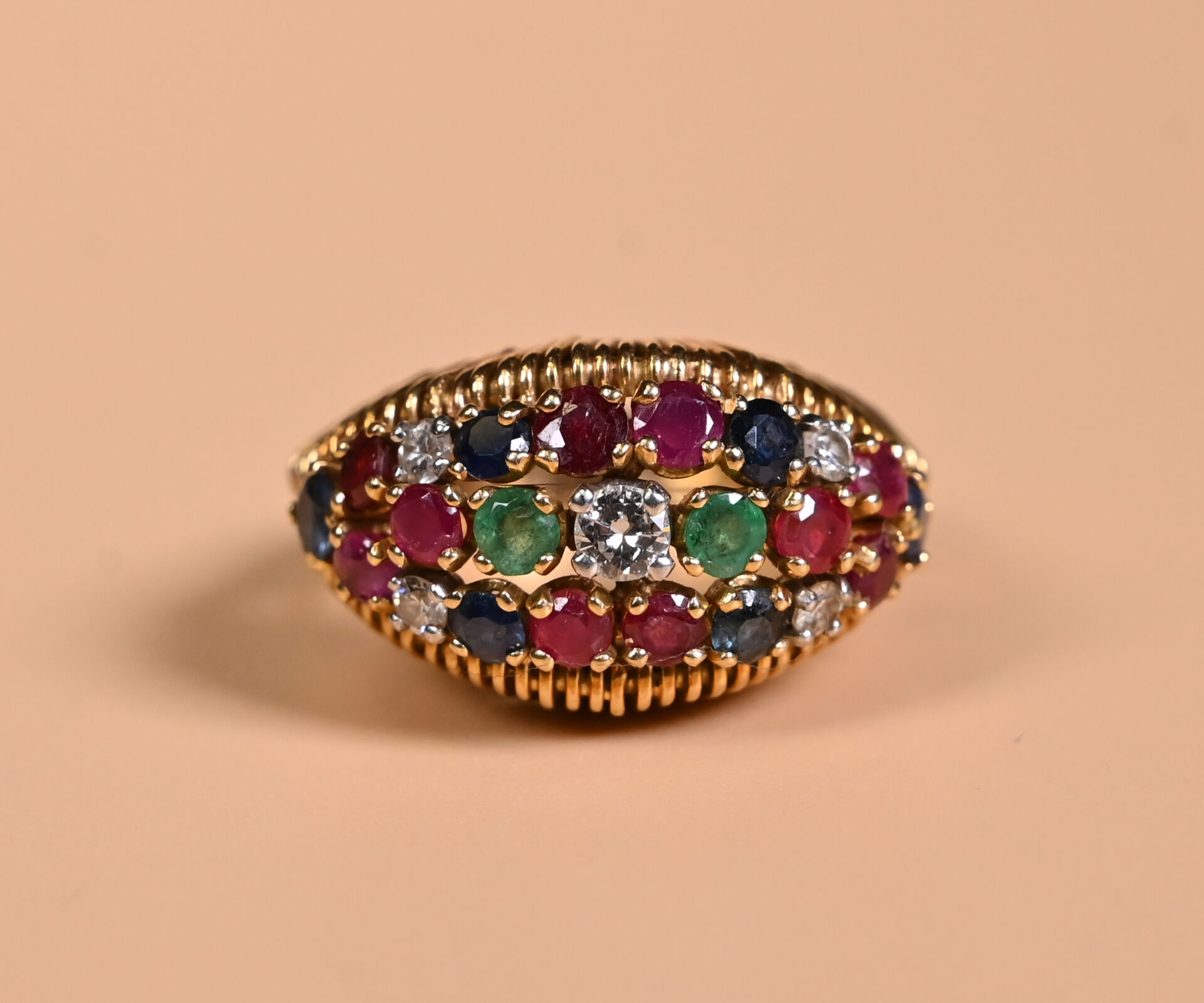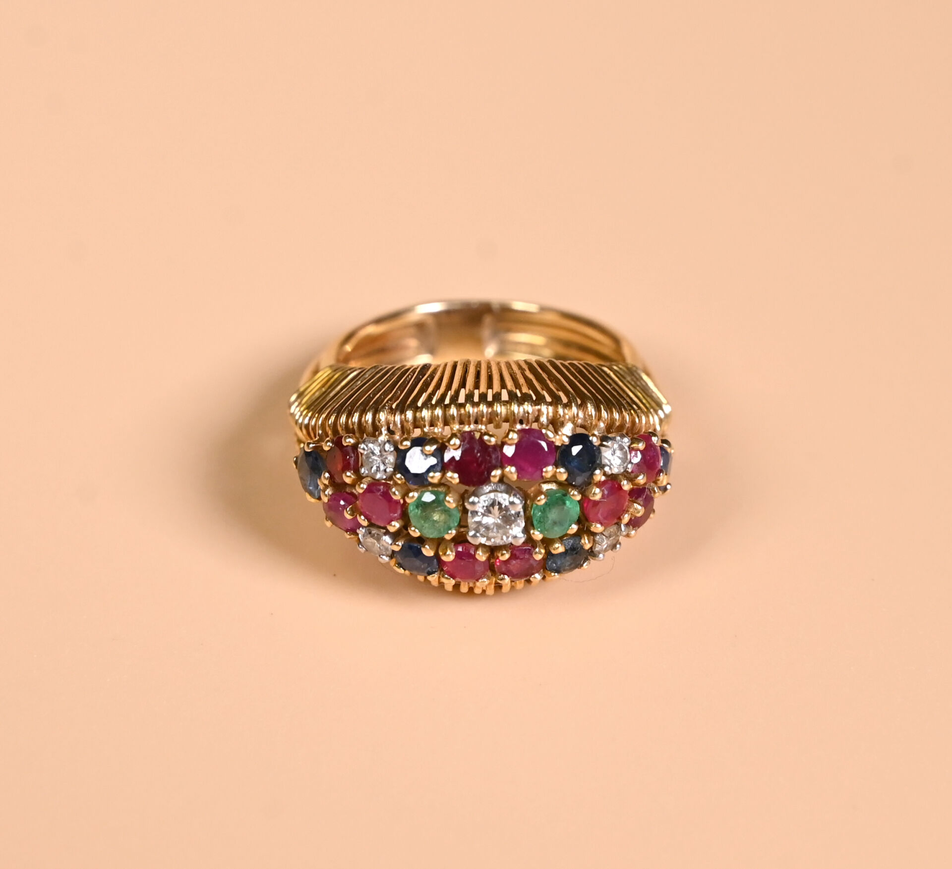 Bague dôme en or jaune 18K 750/1000e sertie de petits rubis, saphirs, émeraudes et diamants. TDD 54/55. Poids brut. : 9,83 g.