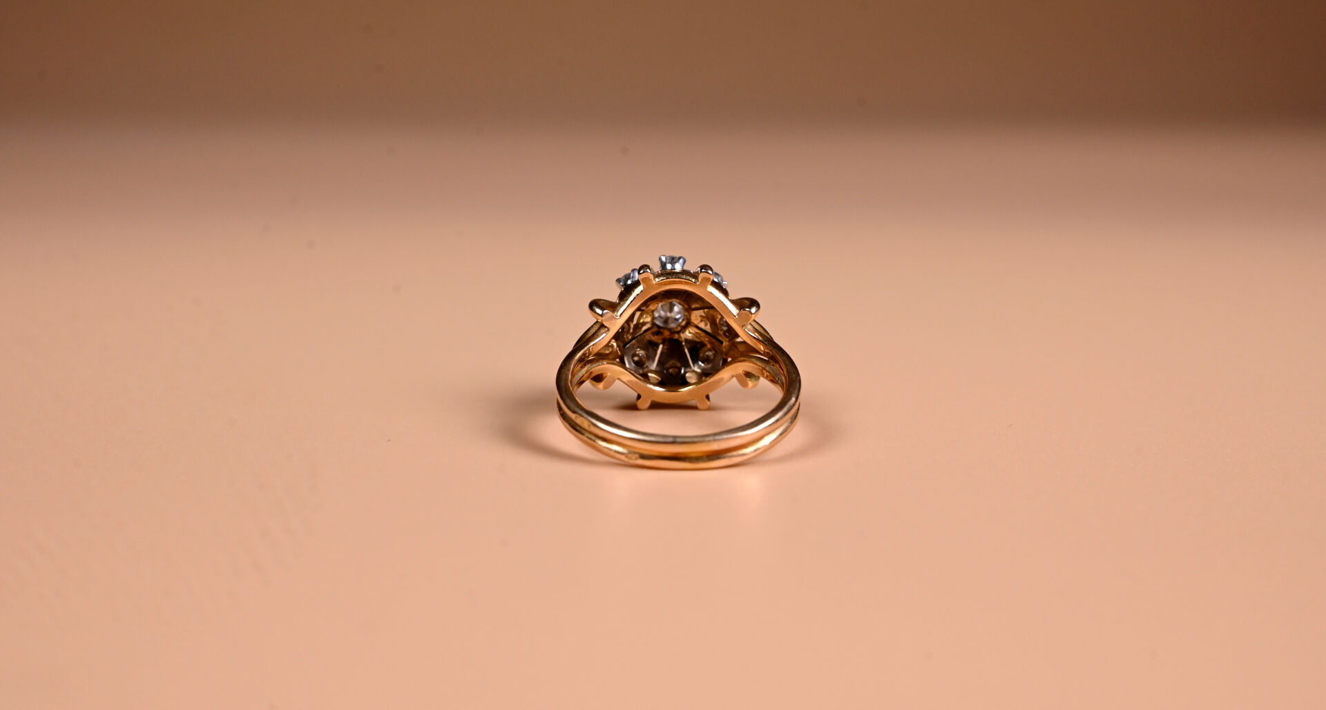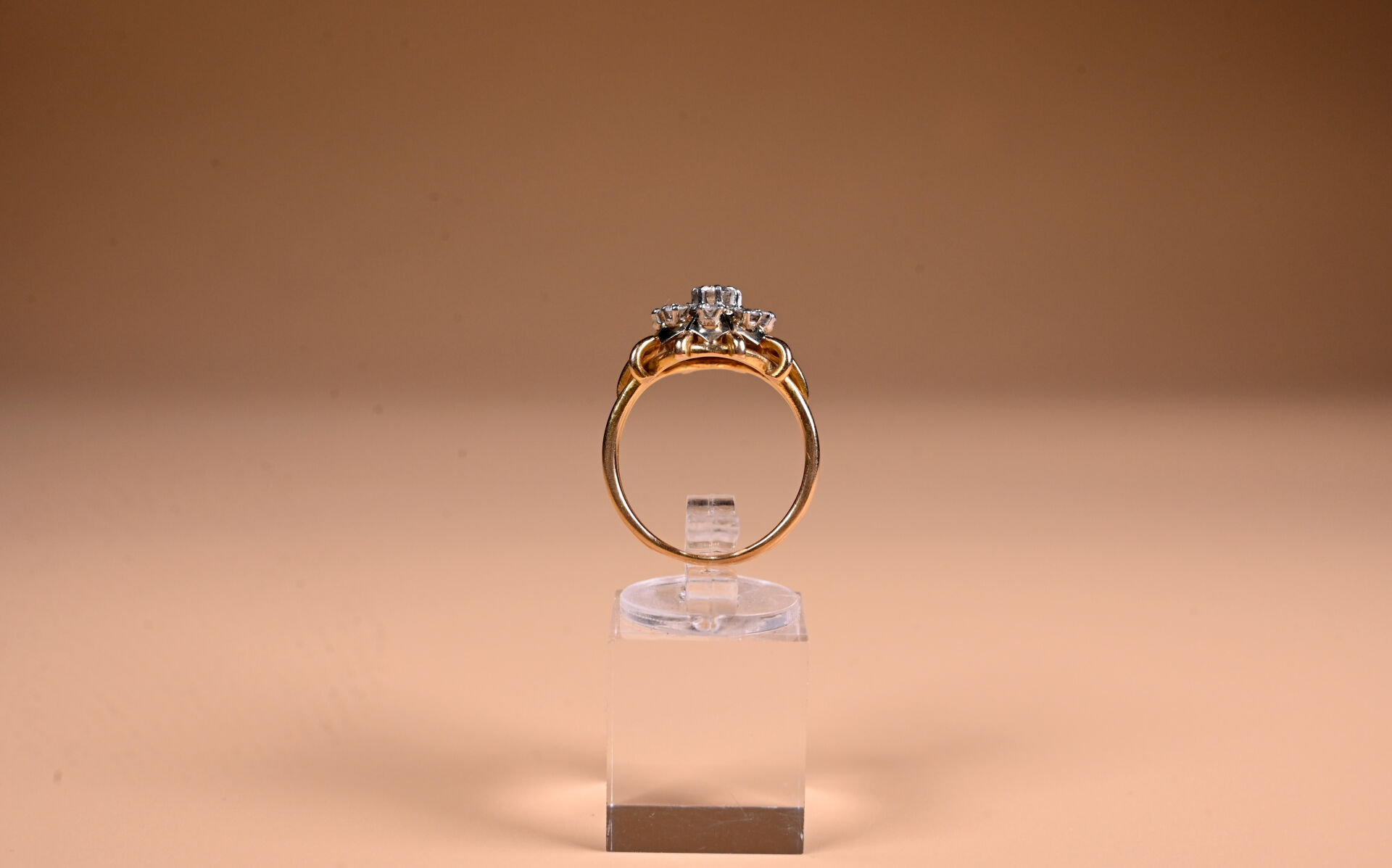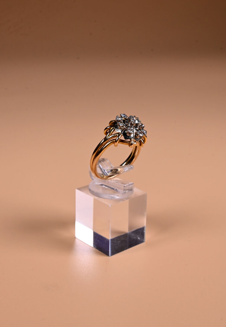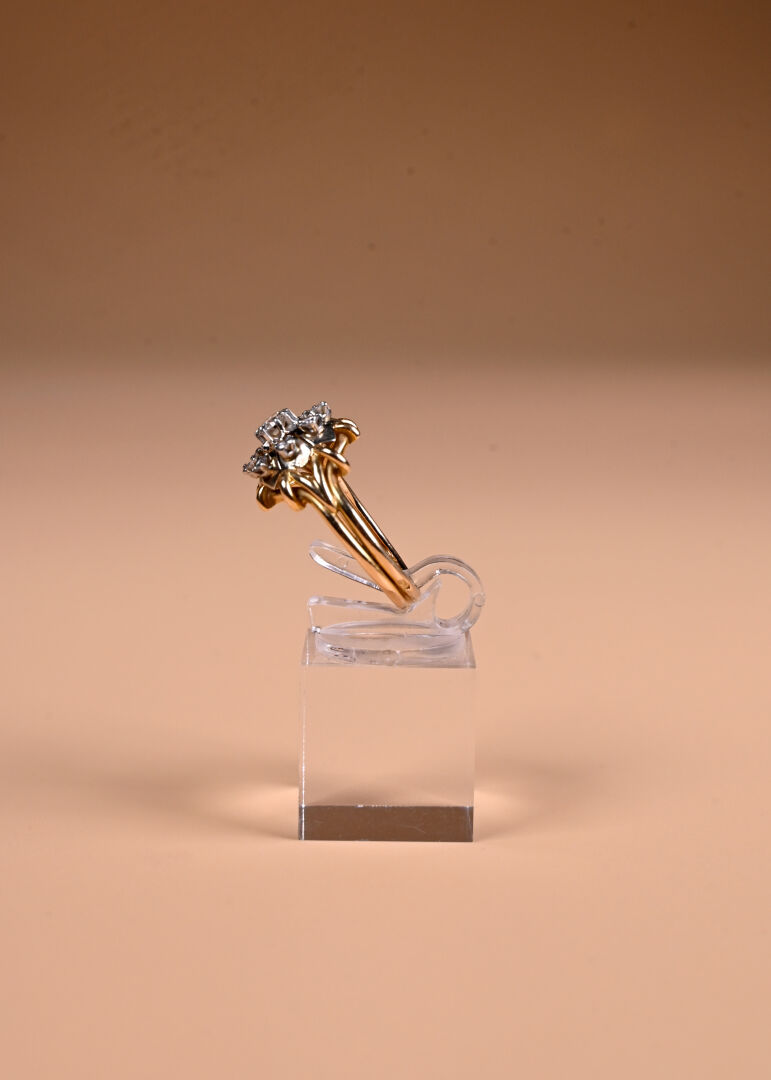 Bague en deux ors 18K 750/1000e et platine 800/1000e sertie de huit petits diamants taille 8/8 et d’un diamant central demi-taille, d’environ 0,20 carat. TDD 59. Poids brut. : 7 g.
